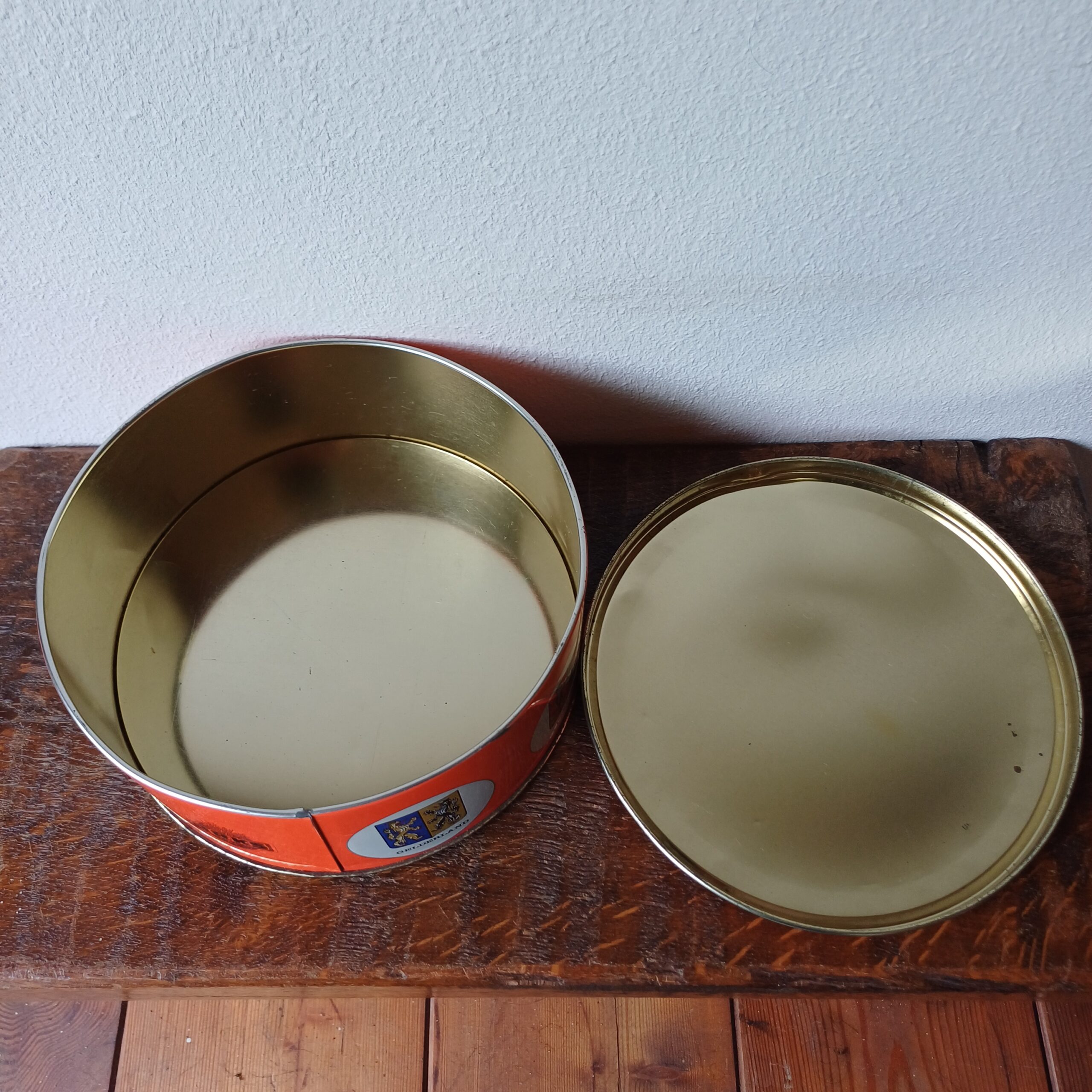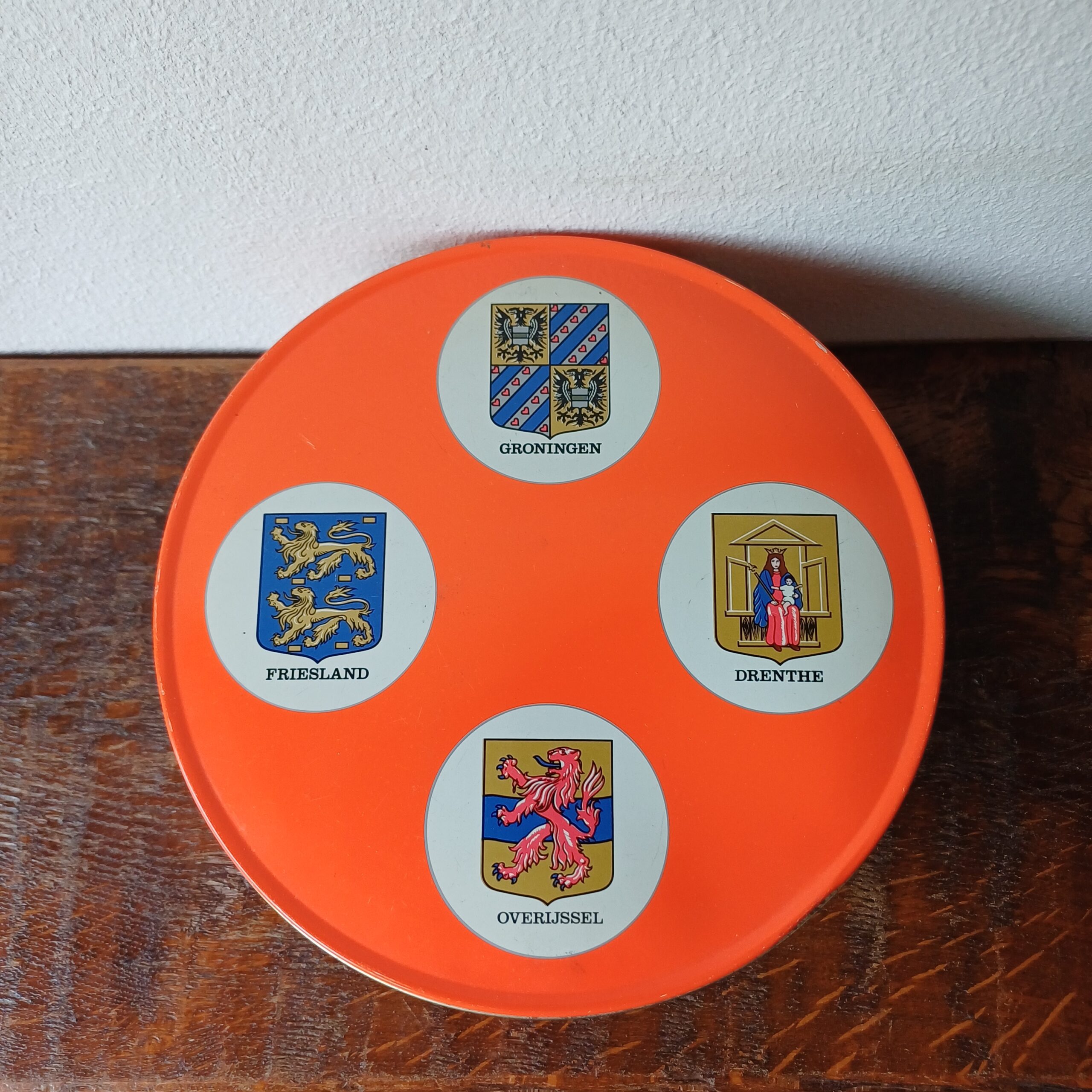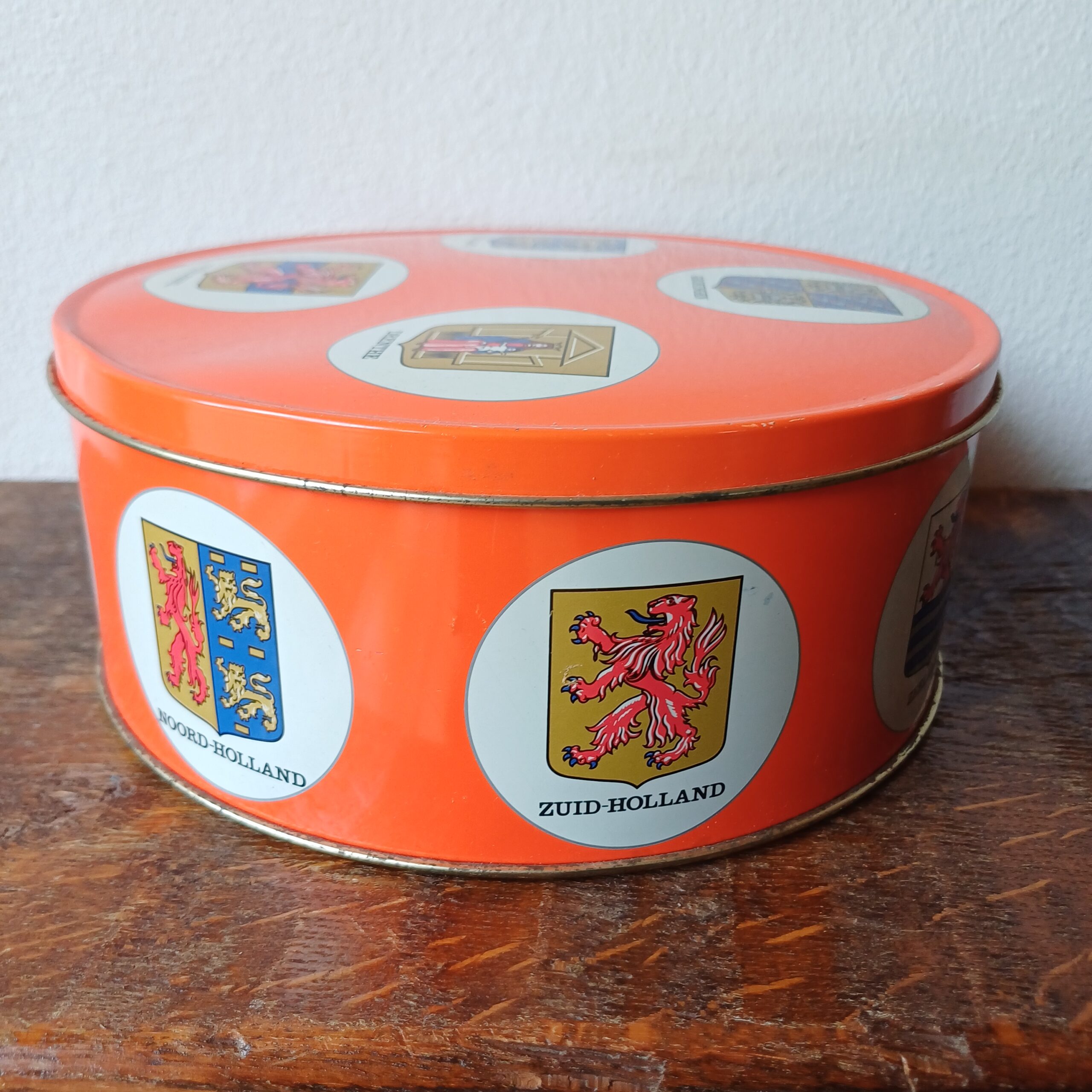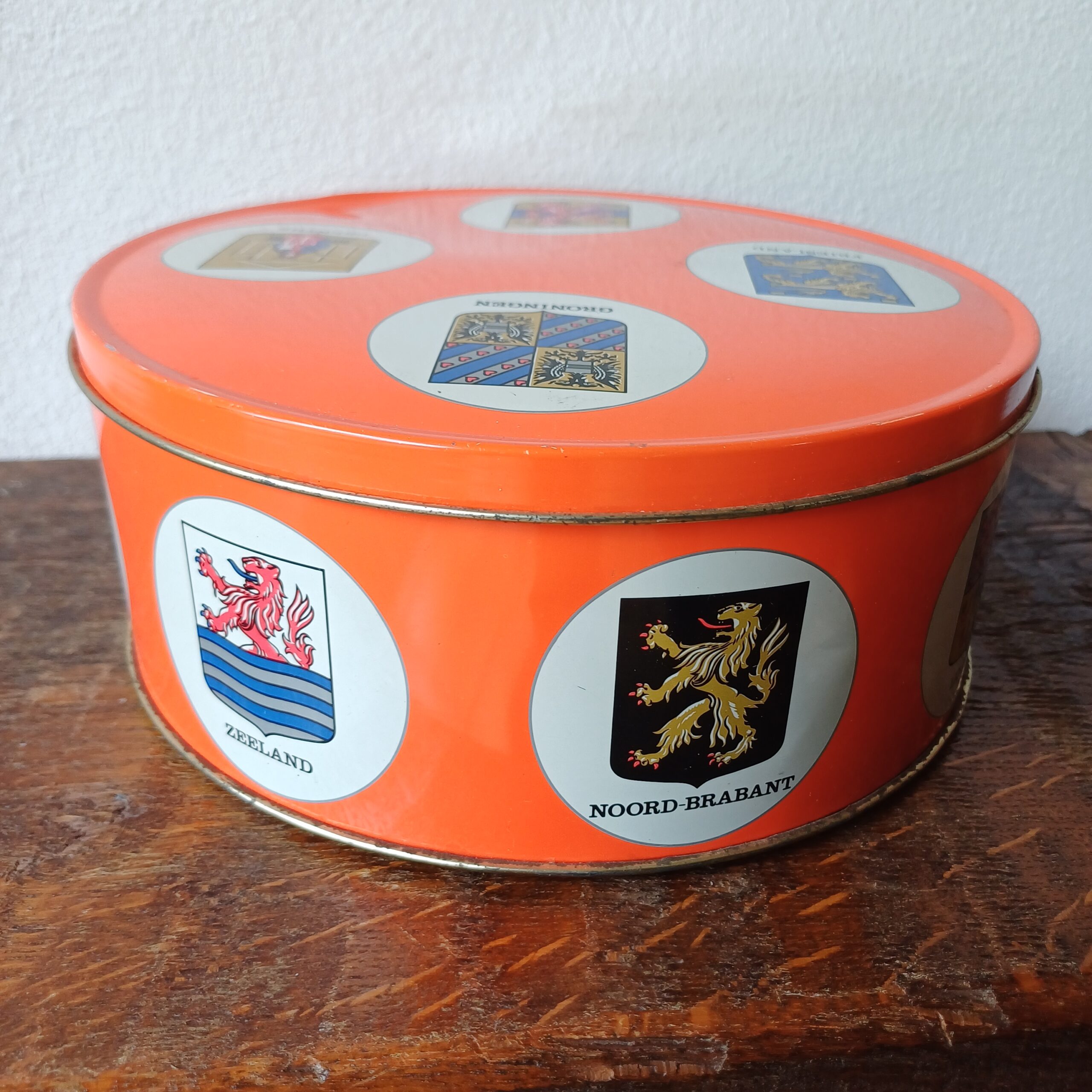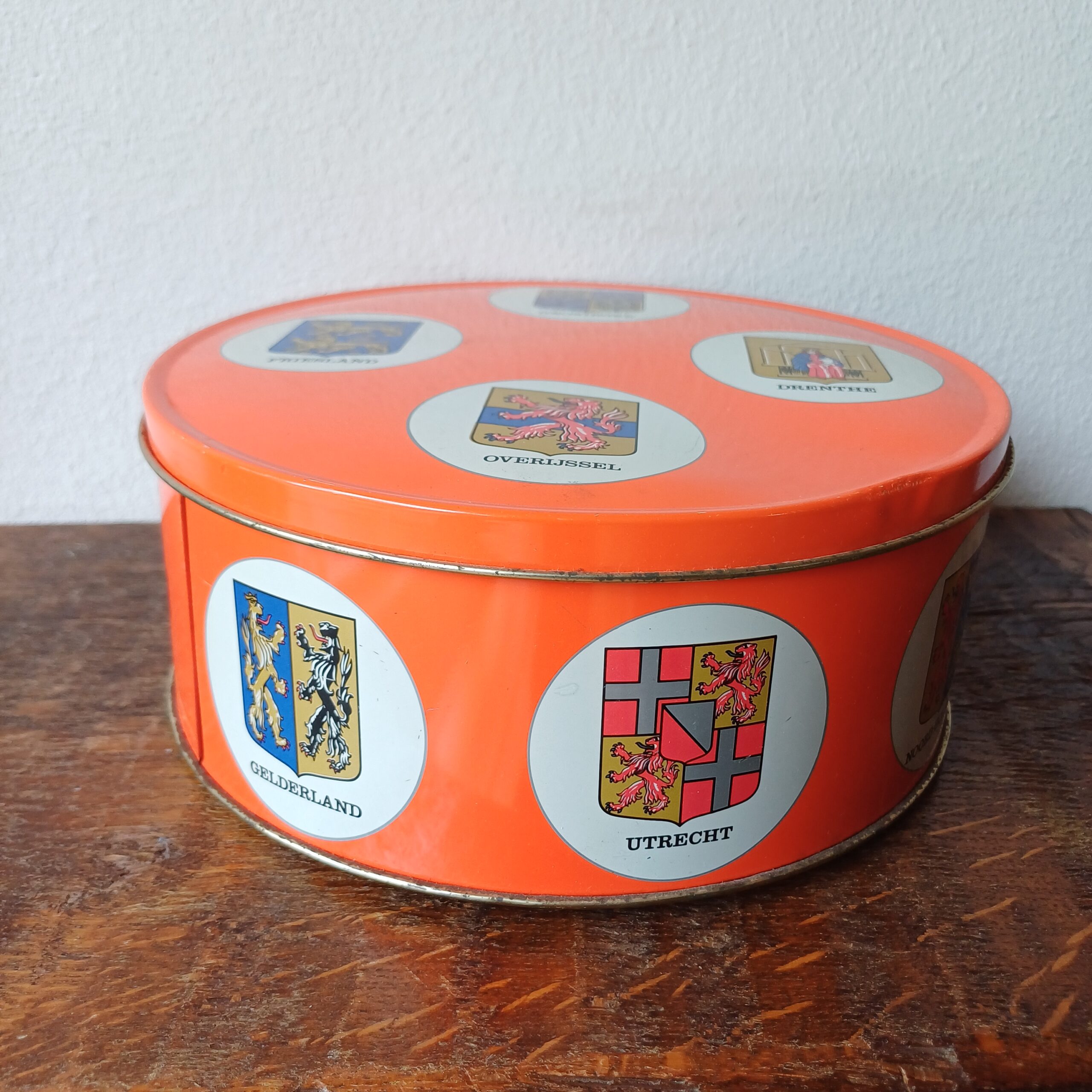 Ronde oranjekleurige vintage koektrommel ARKS met losse oversluitdeksel. Op de oranje ondergrond staan 11 Nederlandse provincies, vergezeld met de bijbehorende wapenschilden. De provincie Flevoland is niet aanwezig op deze blikken, omdat deze provincie pas in 1986 is opgericht.
