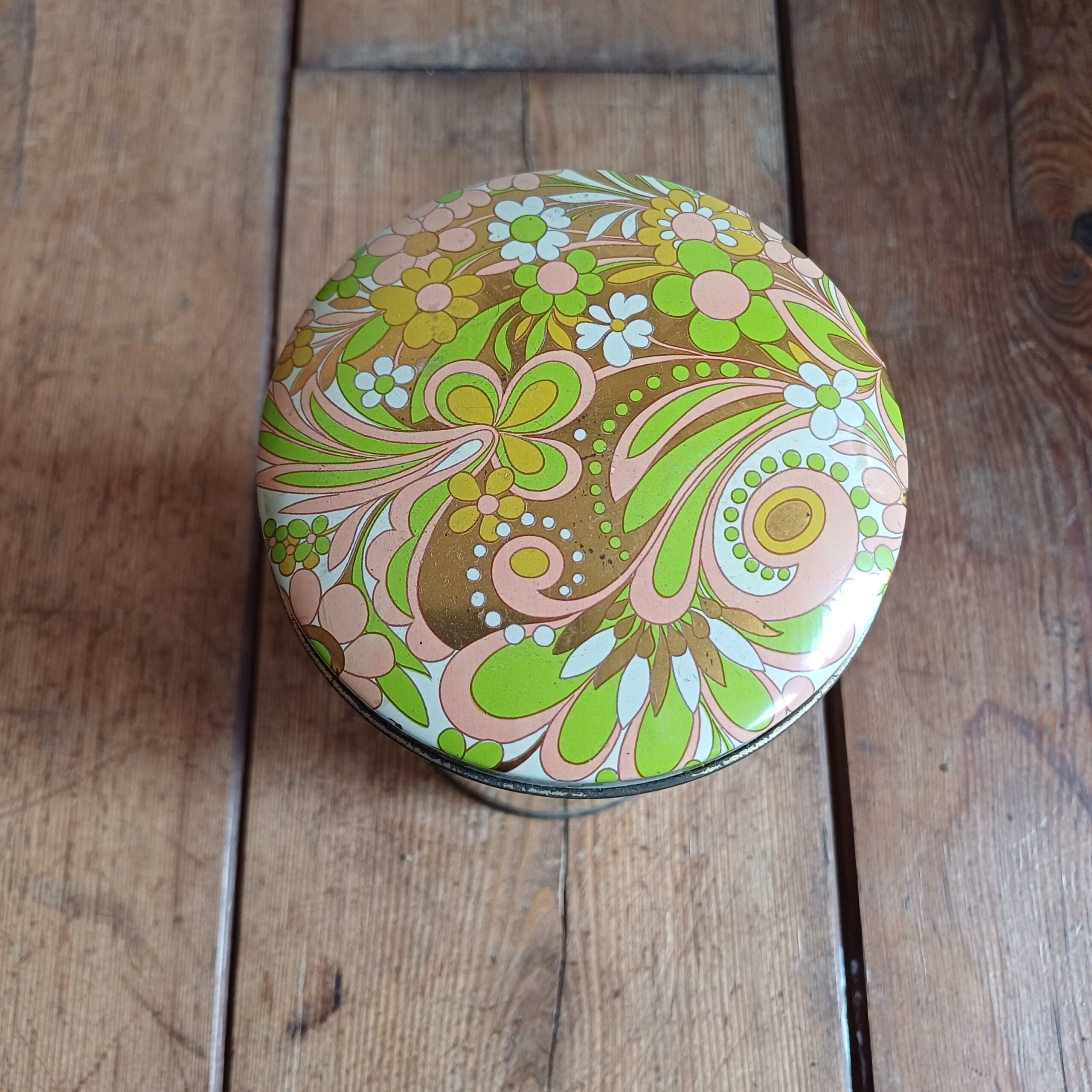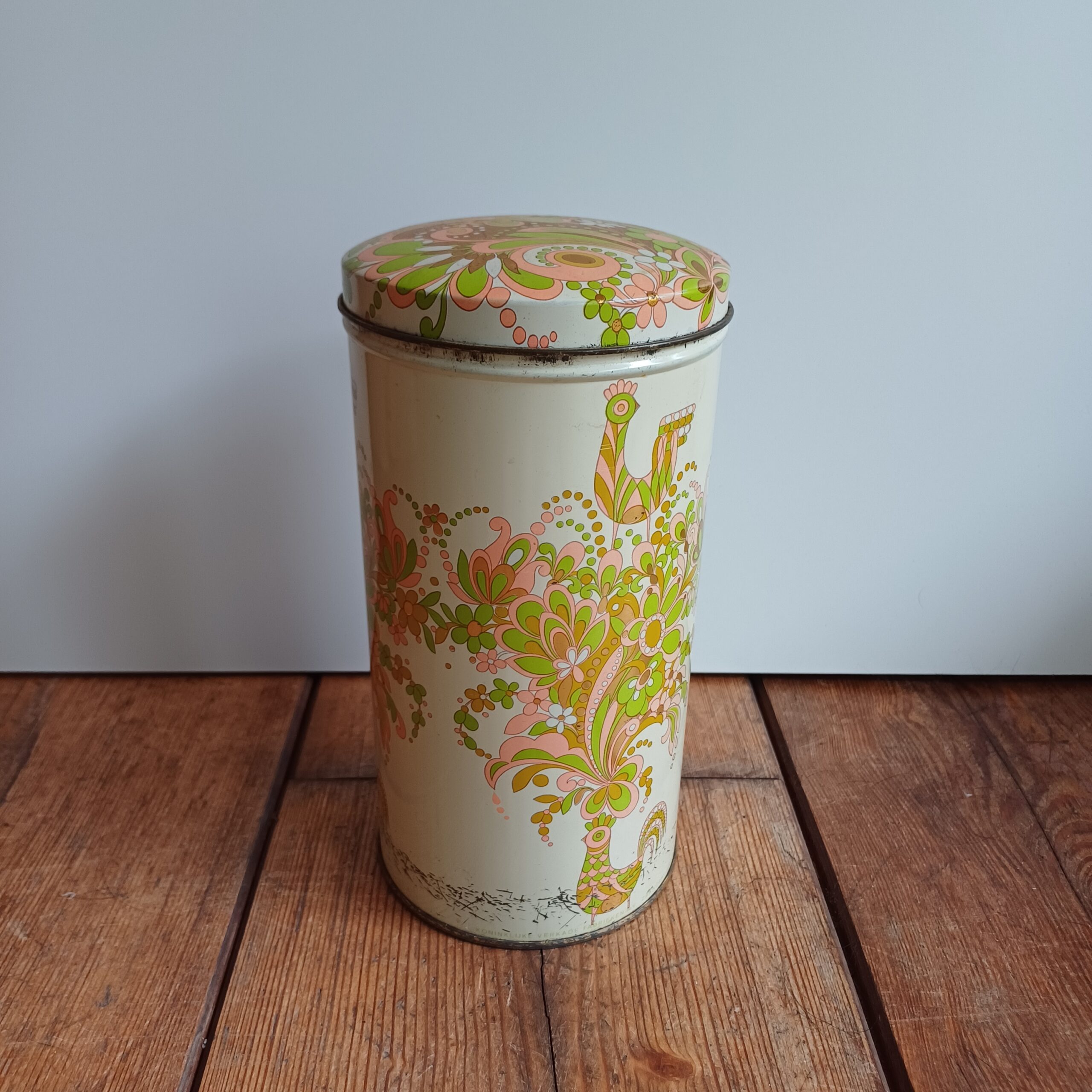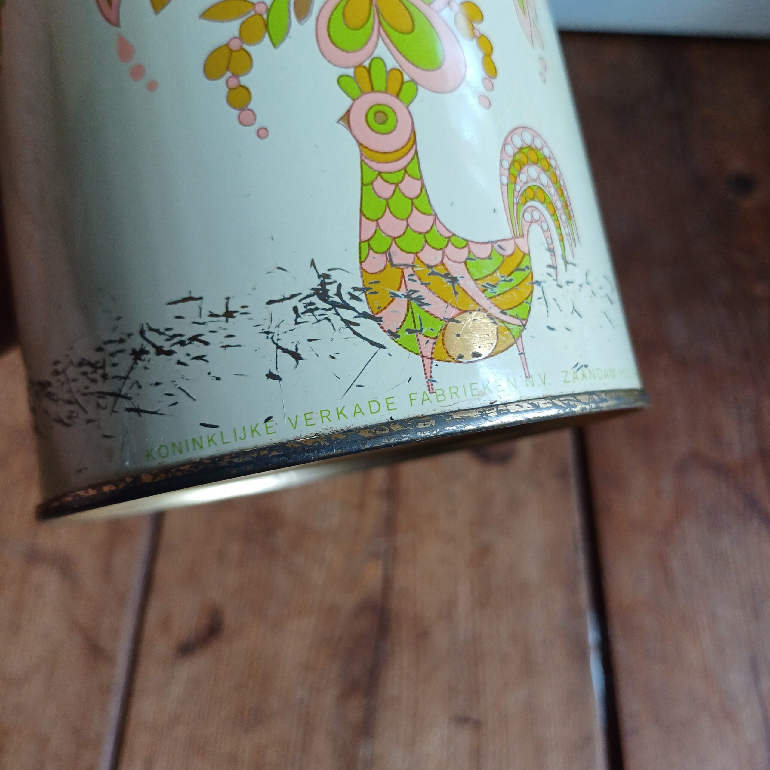 Vintage beschuitblik van Verkade, met mooie afbeeldingen van hanen en bloemen. Koninklijke Verkade Fabrieken N.V. Zaandam Holland. De beschuitbus is nog bruikbaar, maar ook mooi ter decoratie.