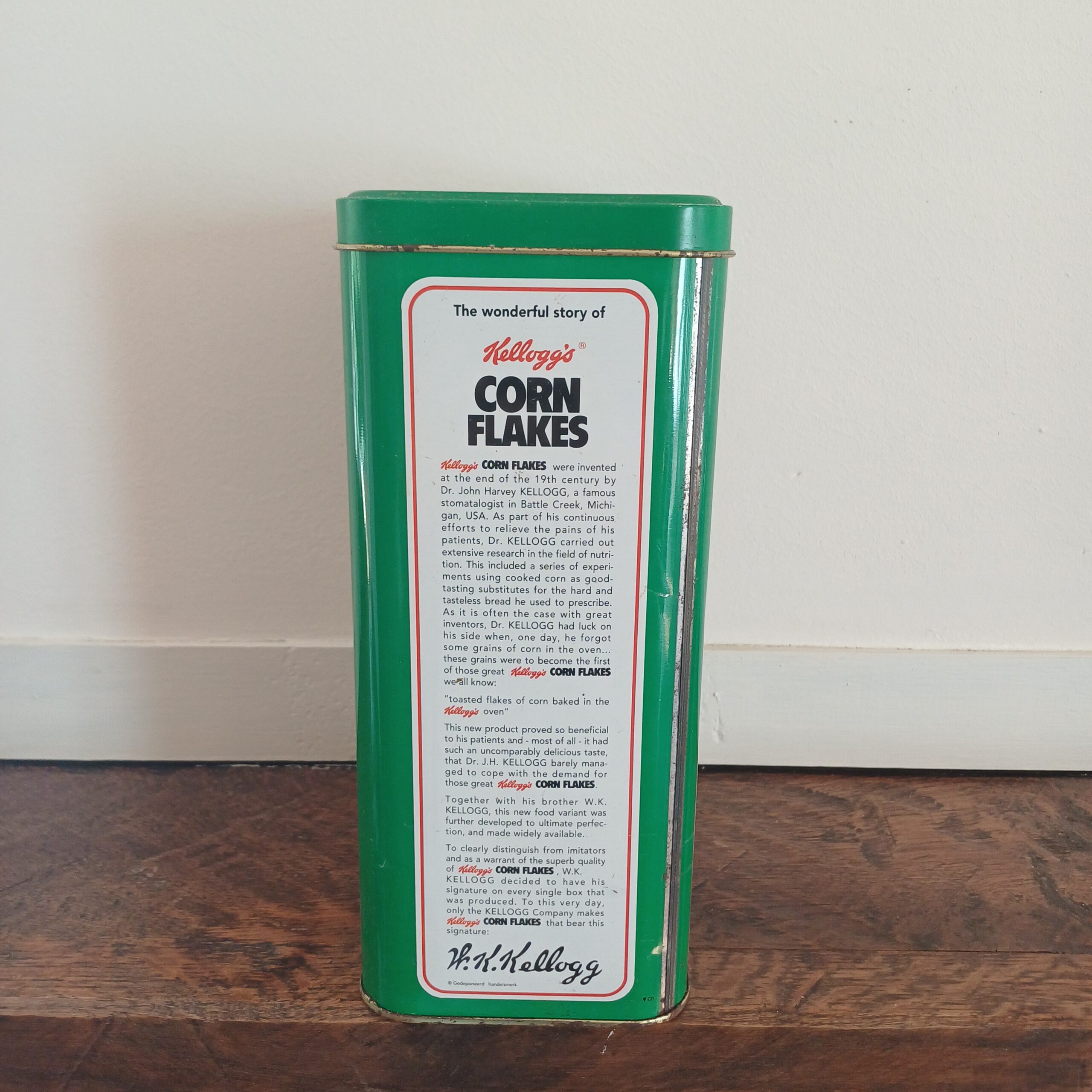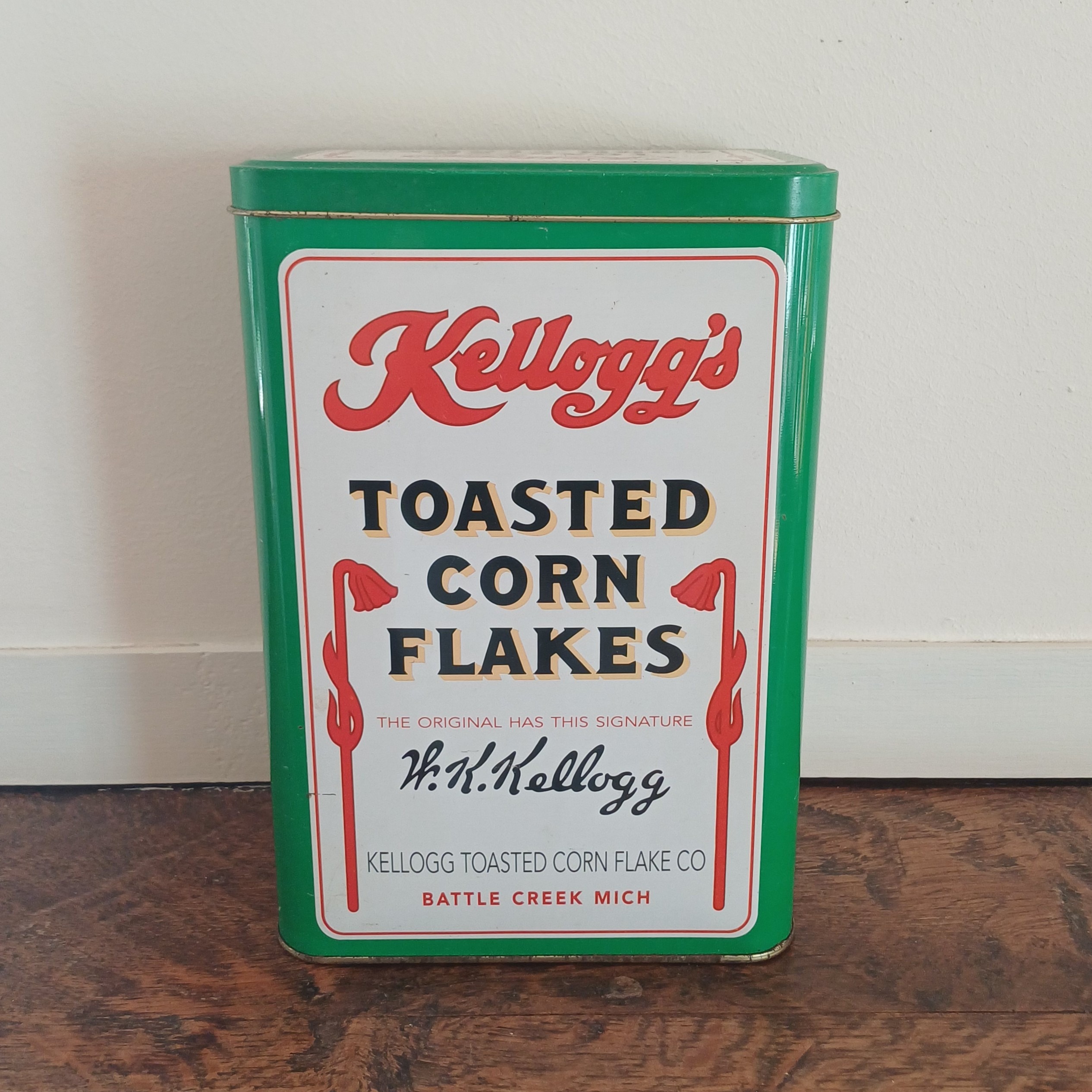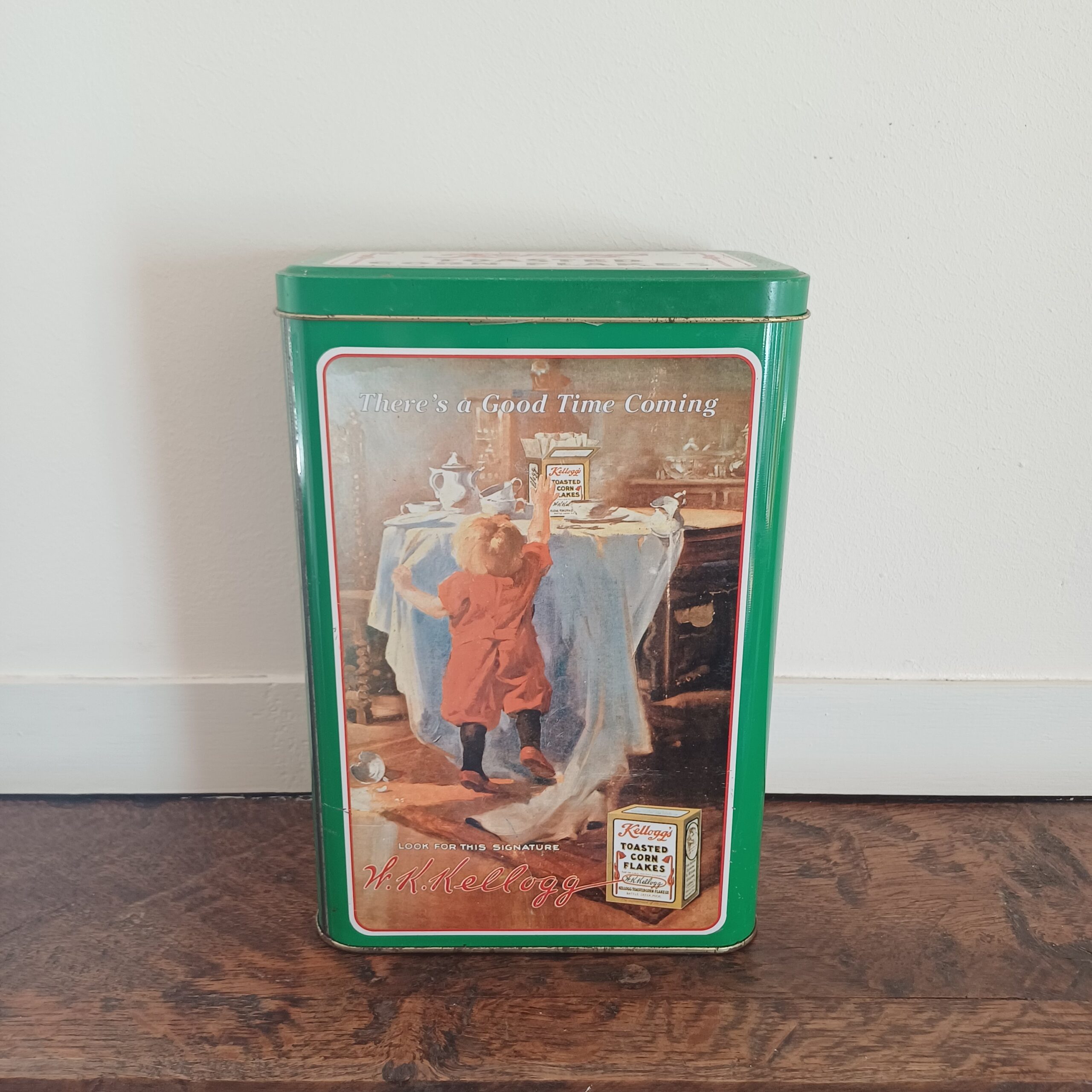 Leuk vintage blik van Kellogg’s toasted corn flakes, met een afbeelding van een kind dat reikt naar het pak cornflakes op tafel. There’s a good time coming. Houdbaarheidsdatum van de krokant geroosterde maisvlokken was tot januari 1997.
