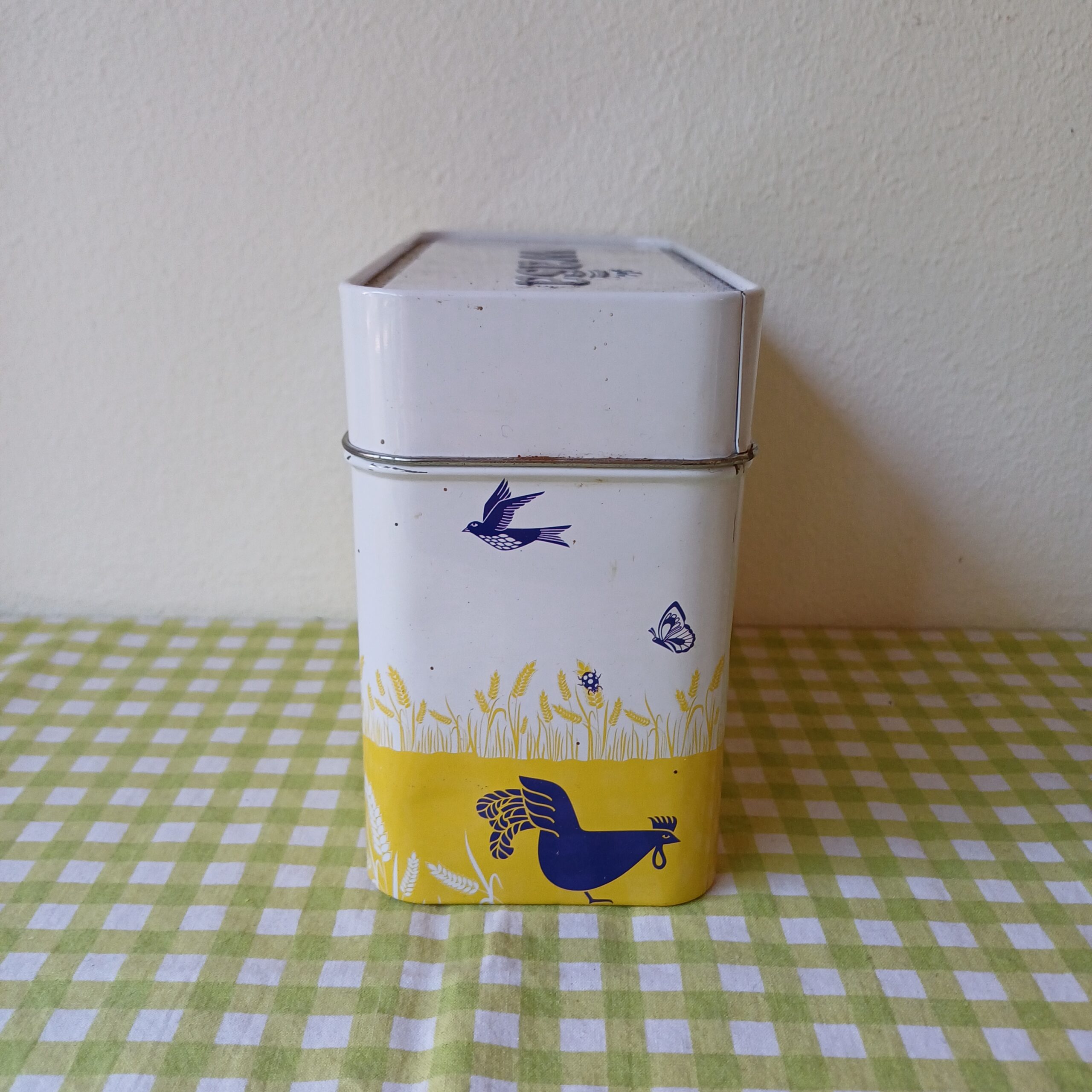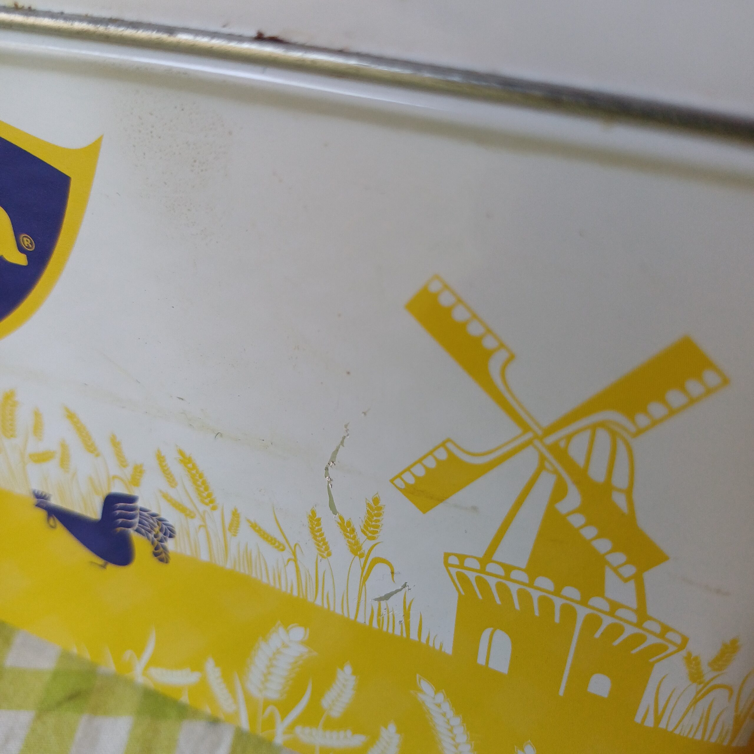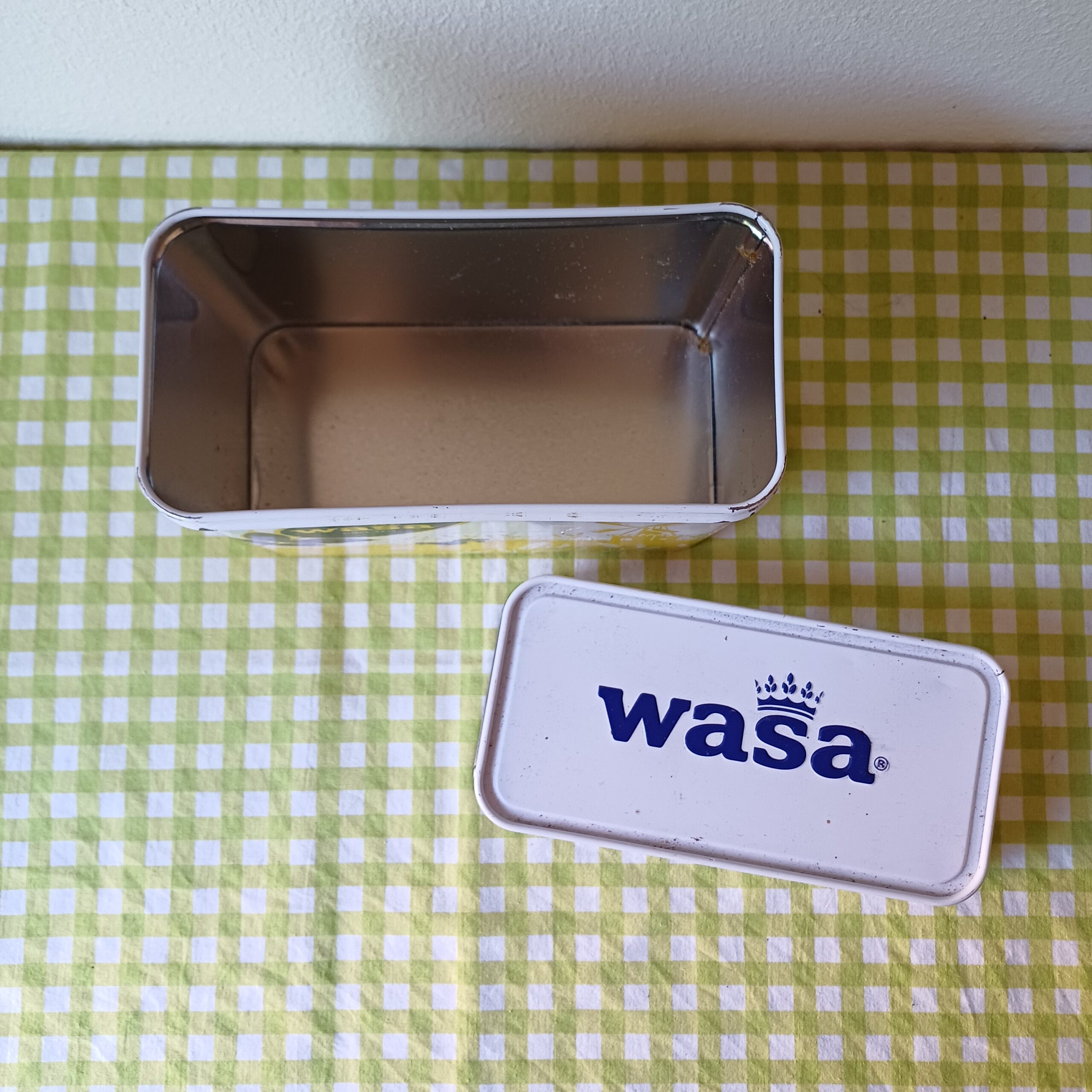 Mooi blik van Wasa met afbeeldingen van een korenveld met een molen, haan, zwaluw etc. Op het deksel staat ‘WASA’ in reliëf. Het blik houdt je crackers lang knapperig en lekker. Eén verpakking past precies in de bewaardoos. Dit crackerblikje kan natuurlijk ook gebruikt worden voor andere etenswaren of spullen en is sowieso decoratief.