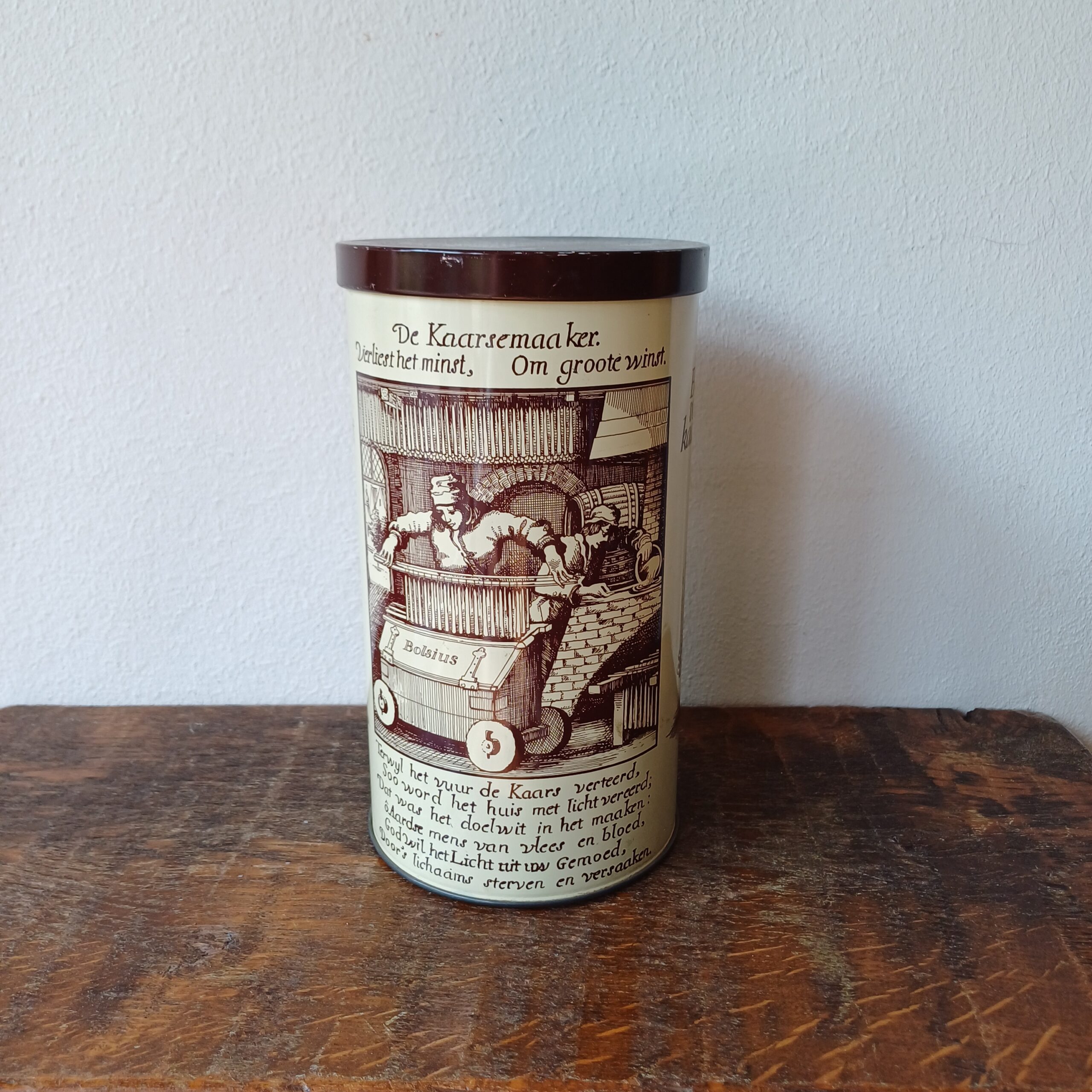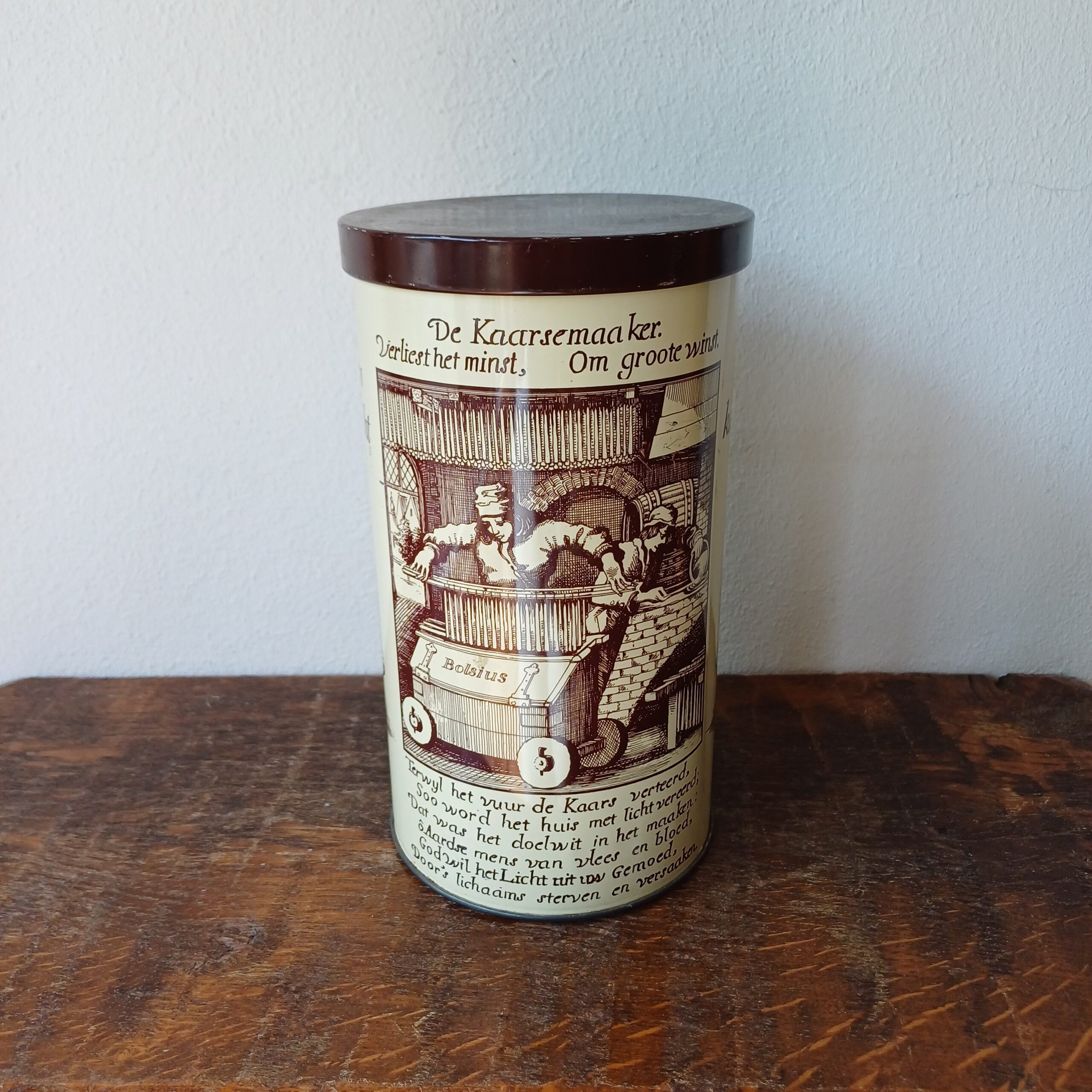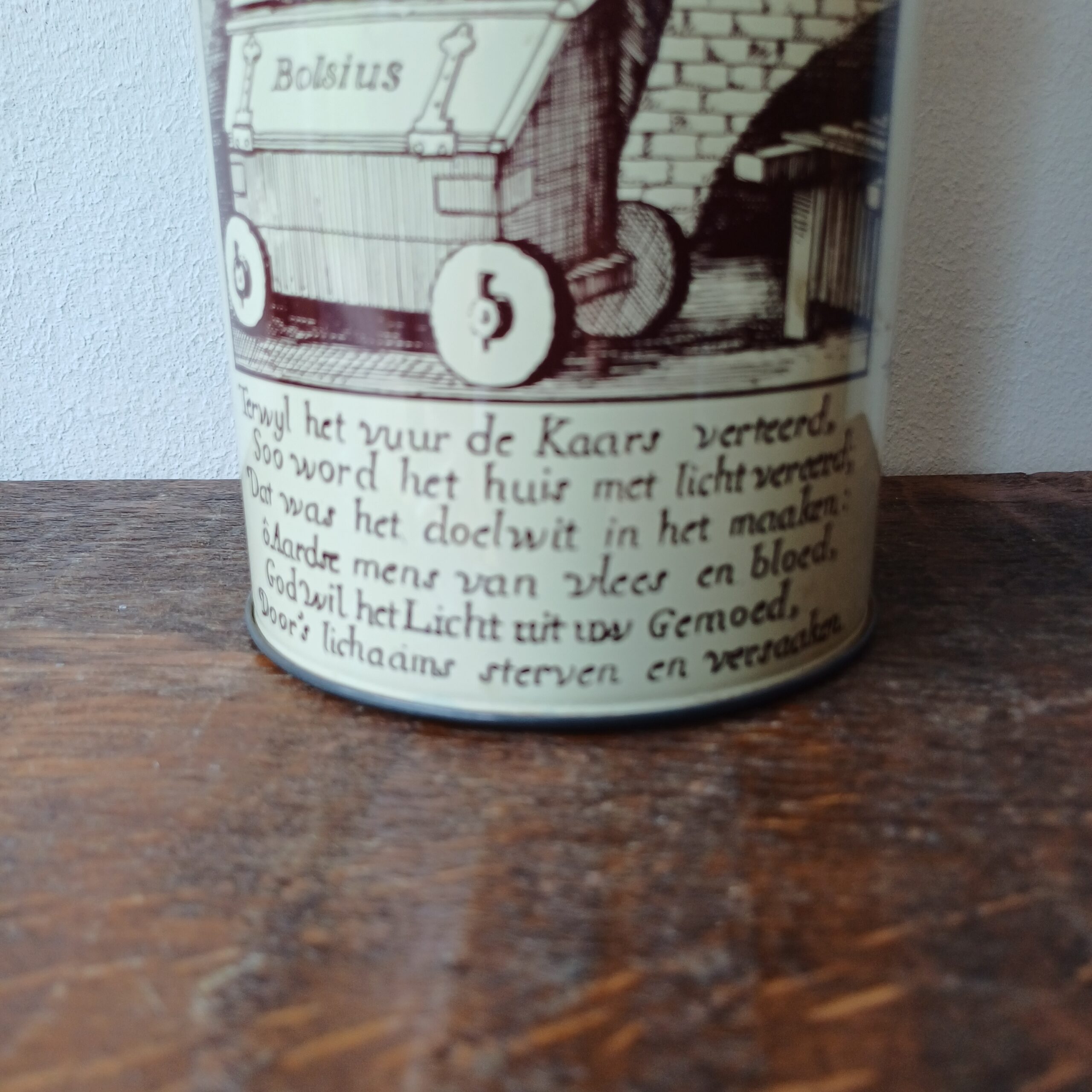 Blik van Bolsius waar kaarsen voor kandelaars in hebben gezeten. Op het plaatje zie je een kaarsenmakerij en er staat een leuk rijm bij.