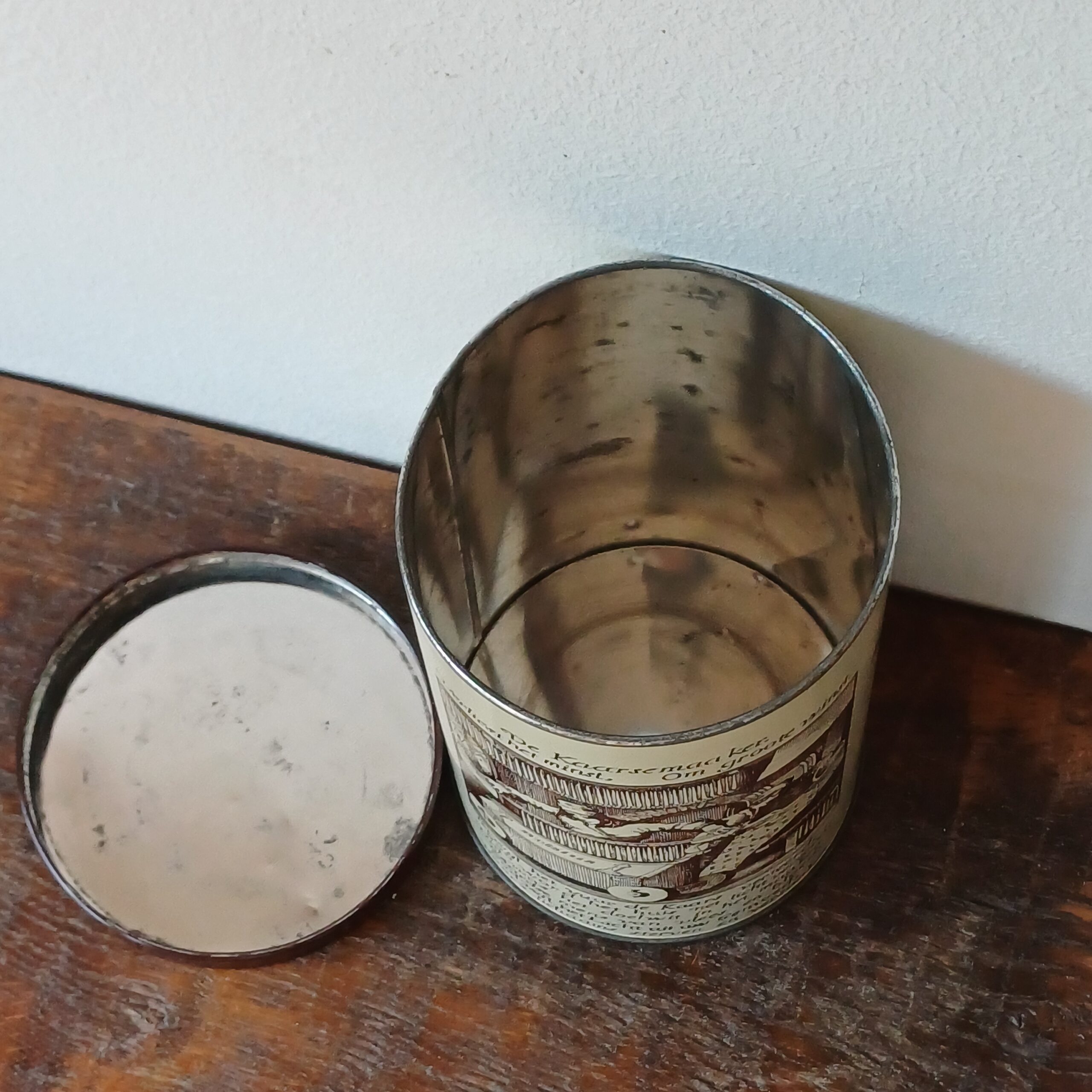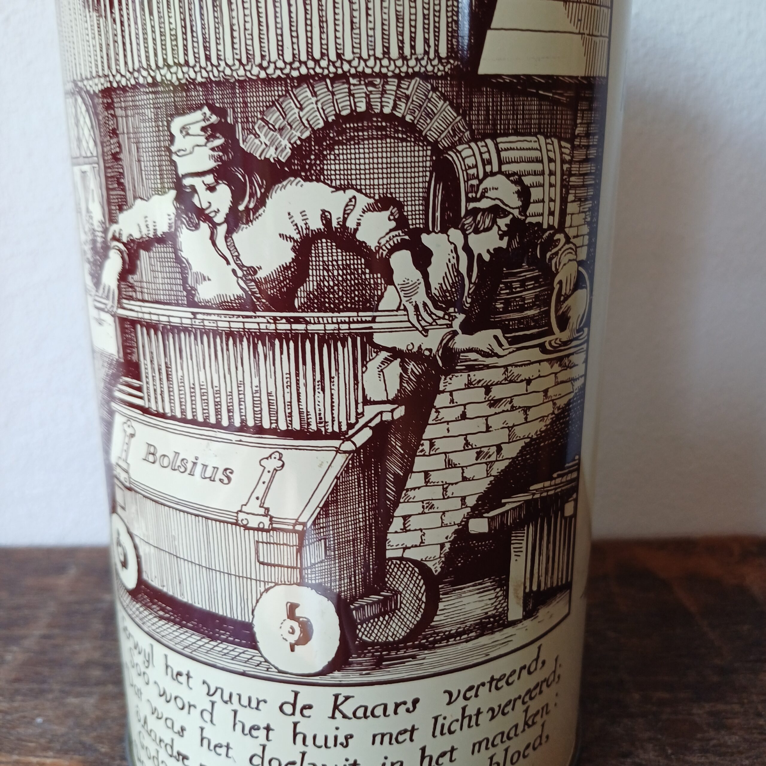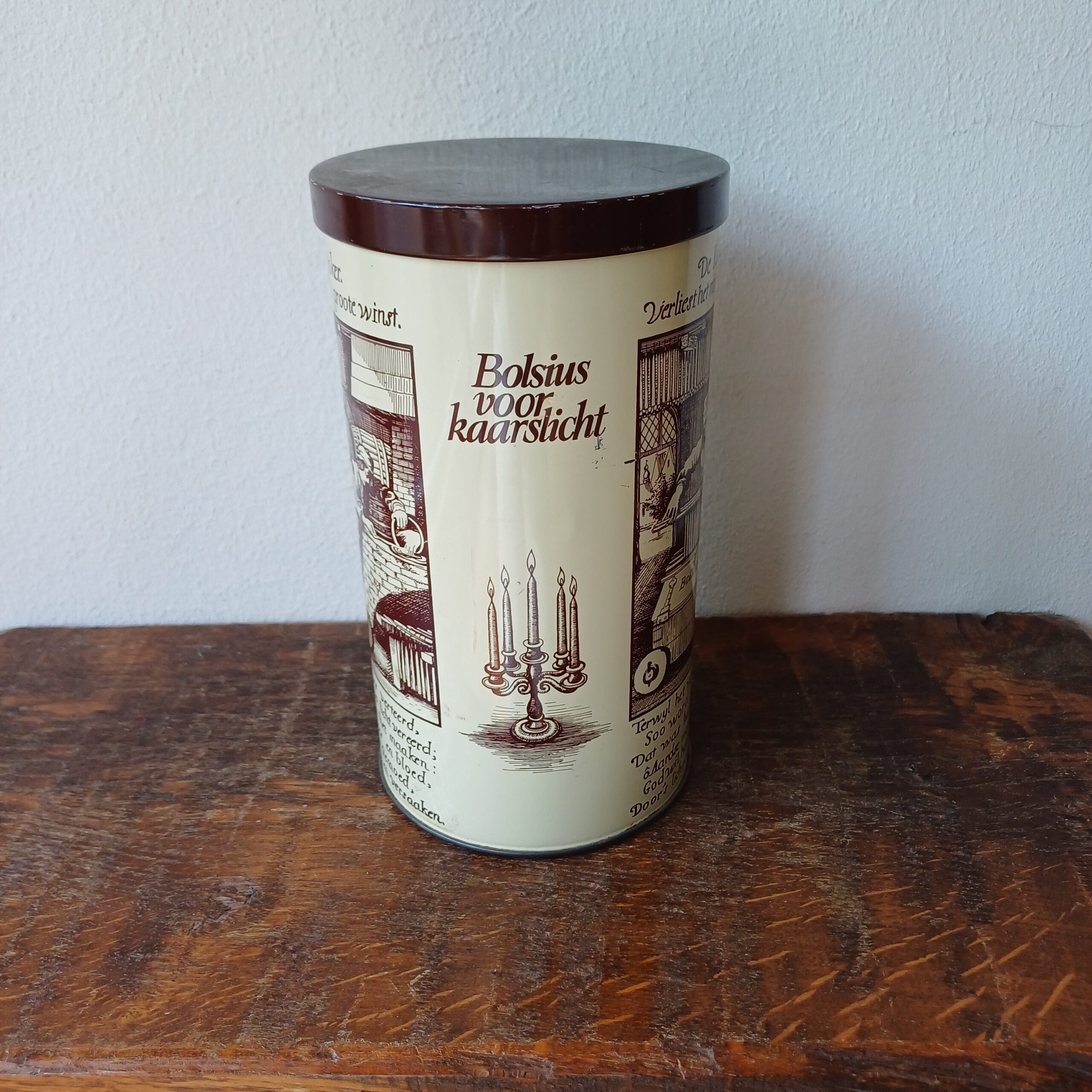 Blik van Bolsius waar kaarsen voor kandelaars in hebben gezeten. Op het plaatje zie je een kaarsenmakerij en er staat een leuk rijm bij.