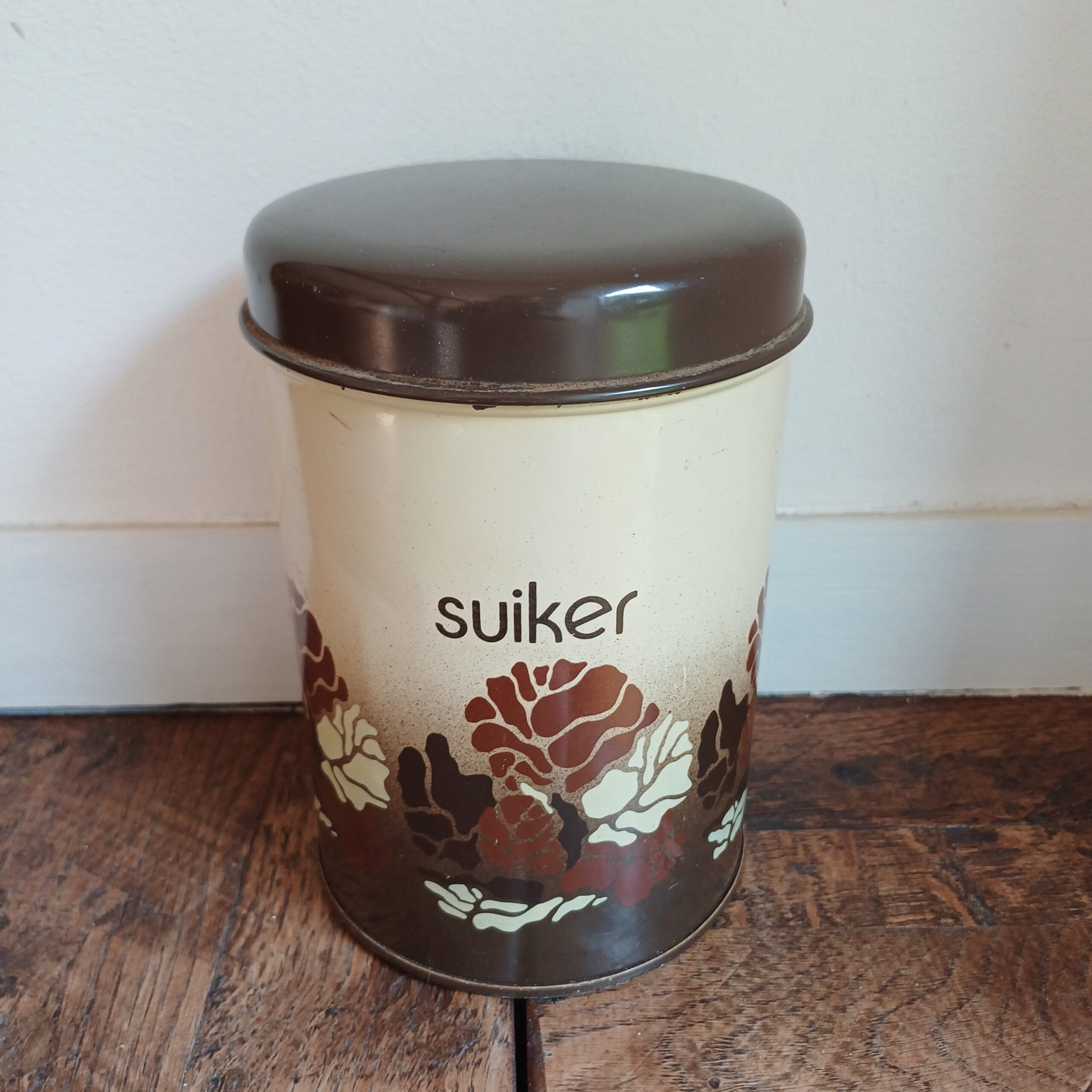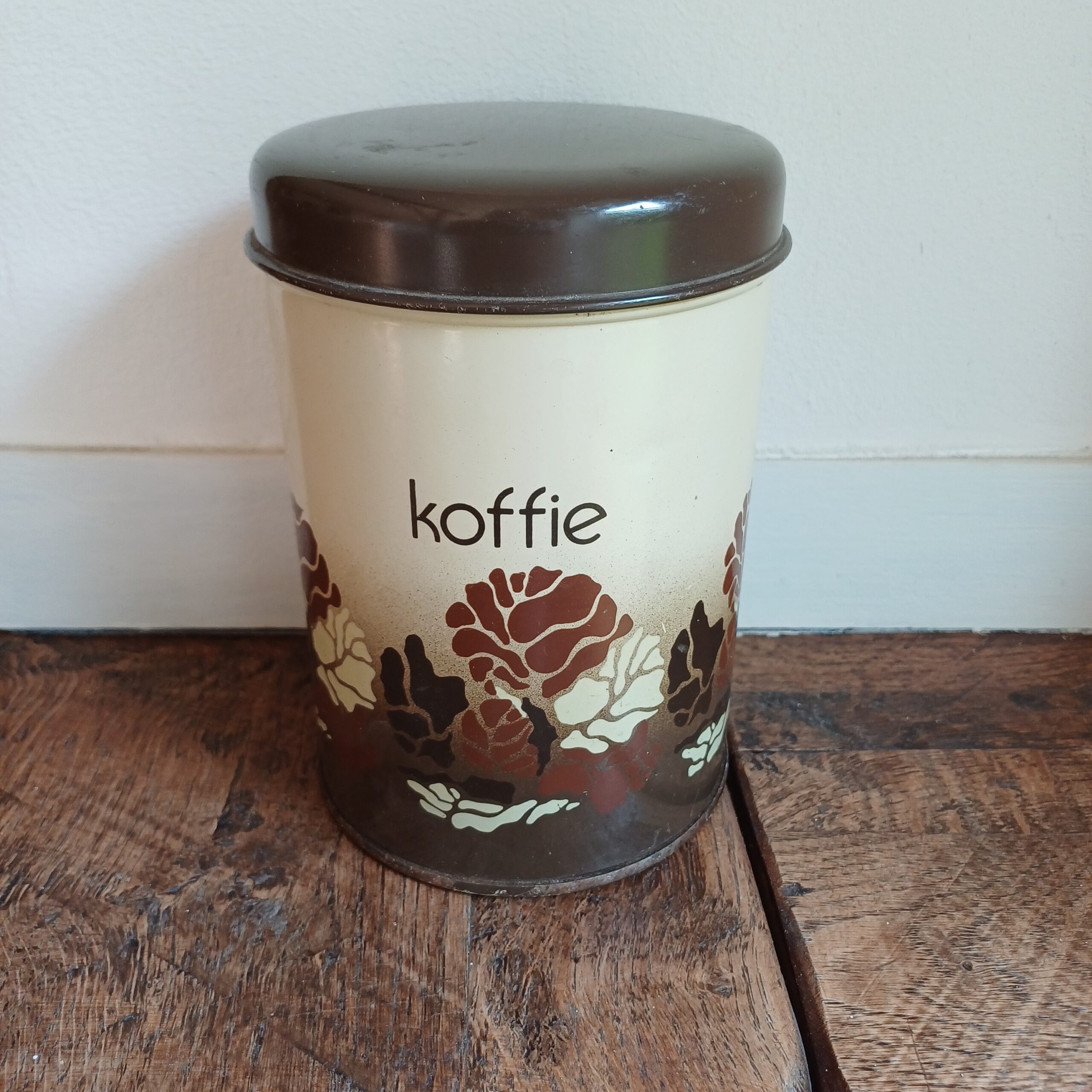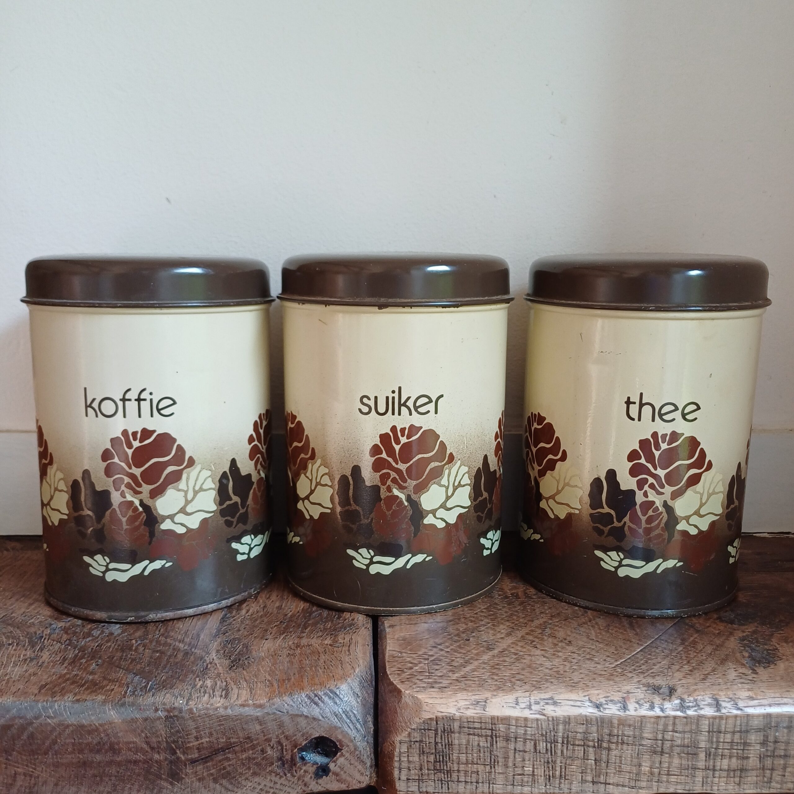 Brabantia blikken voor koffie, thee en suiker. Lekker ouderwets bruin met beige kleurtje.