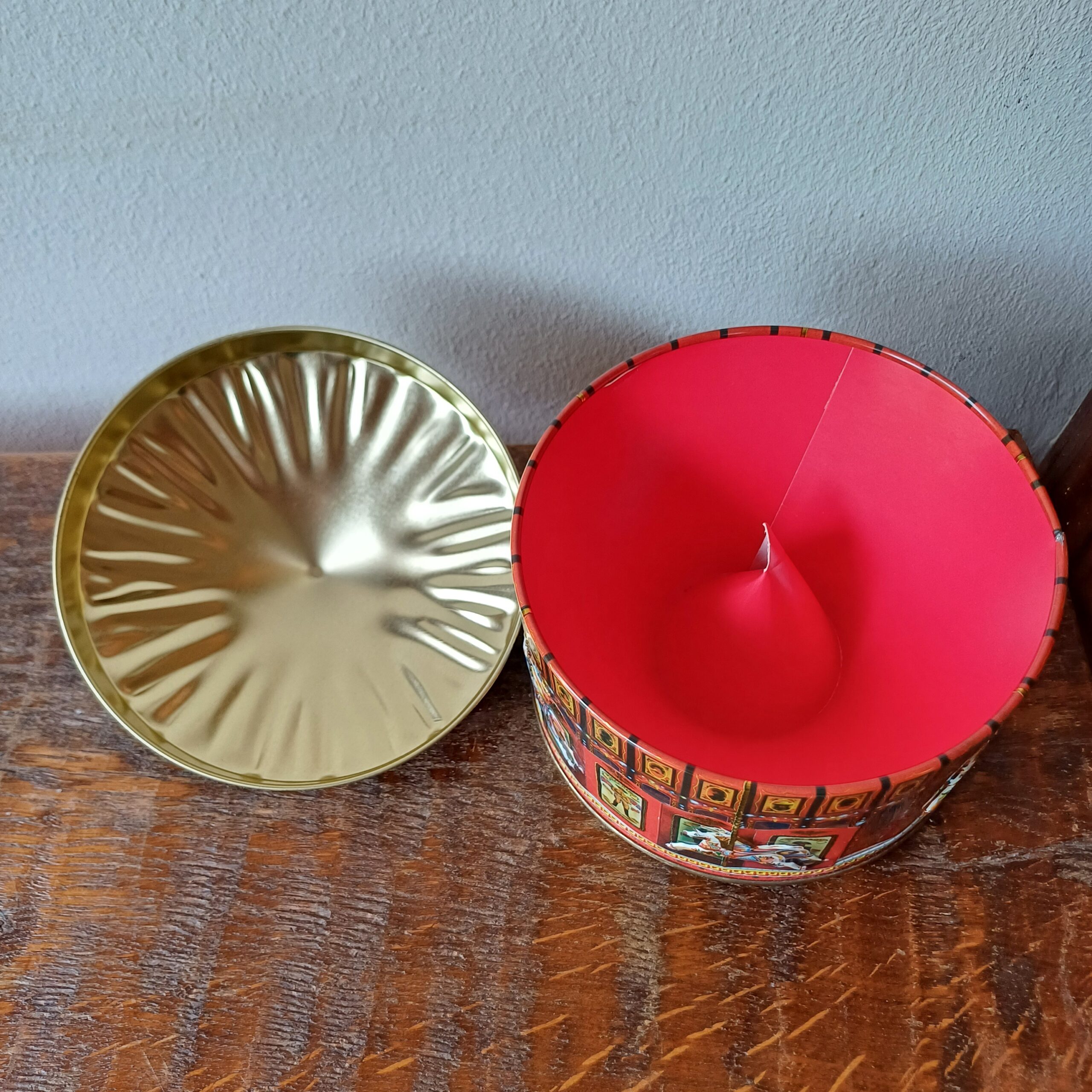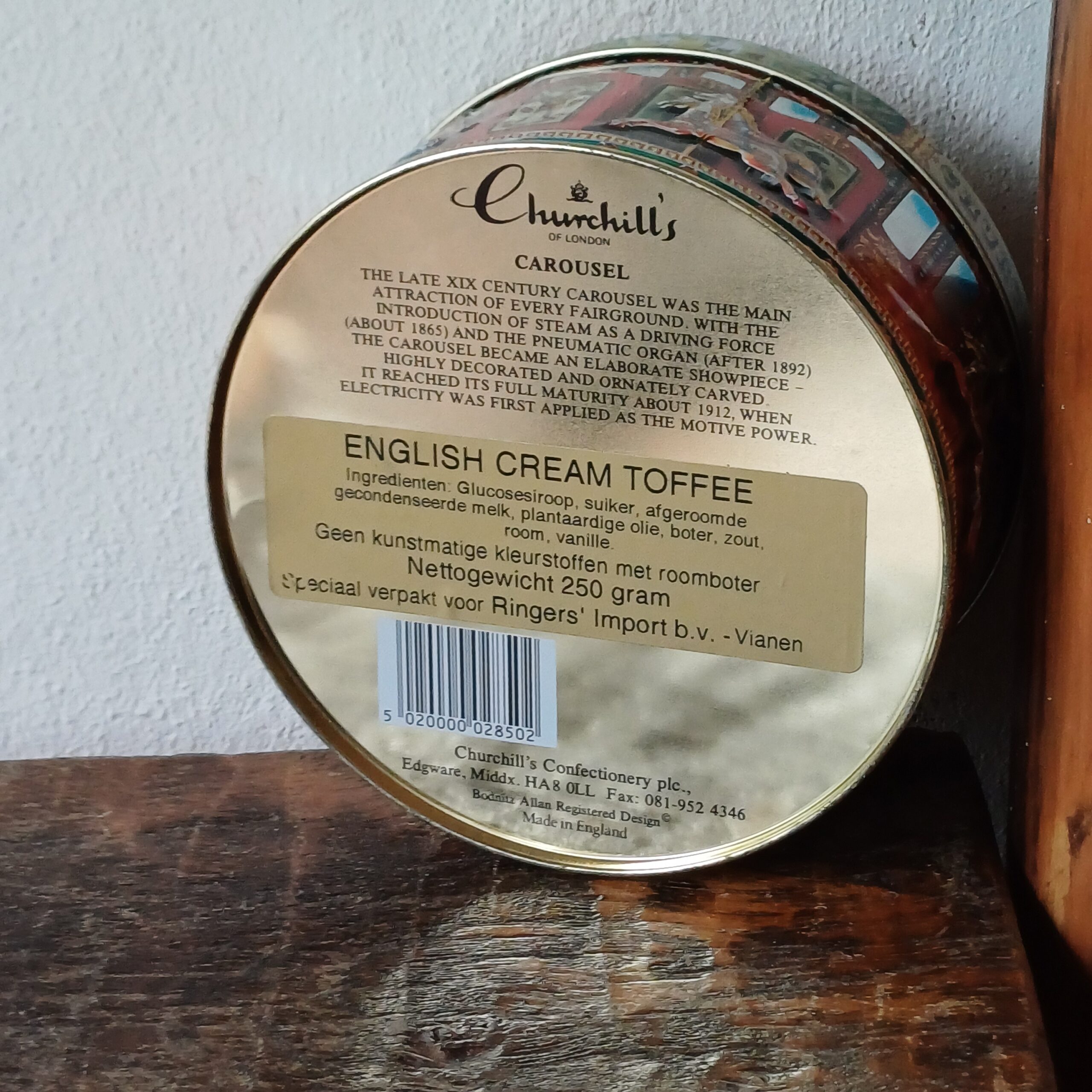 Prachtig blik van Churchills of London blik – Carousel. Met veel verbazingwekkende details, zoals de ruiters, de paarden, de decoratie en de muurschilderingen die over het bovenste deel (de rand van het deksel) lopen. De verschillende elementen hebben een reliëf om het ontwerp te accentueren. Op de onderzijde van het blik staat een korte, interessante geschiedenis van de draaimolen. Het deksel is koepelvormig, net als de originele canvas tent. De binnenkant is netjes.