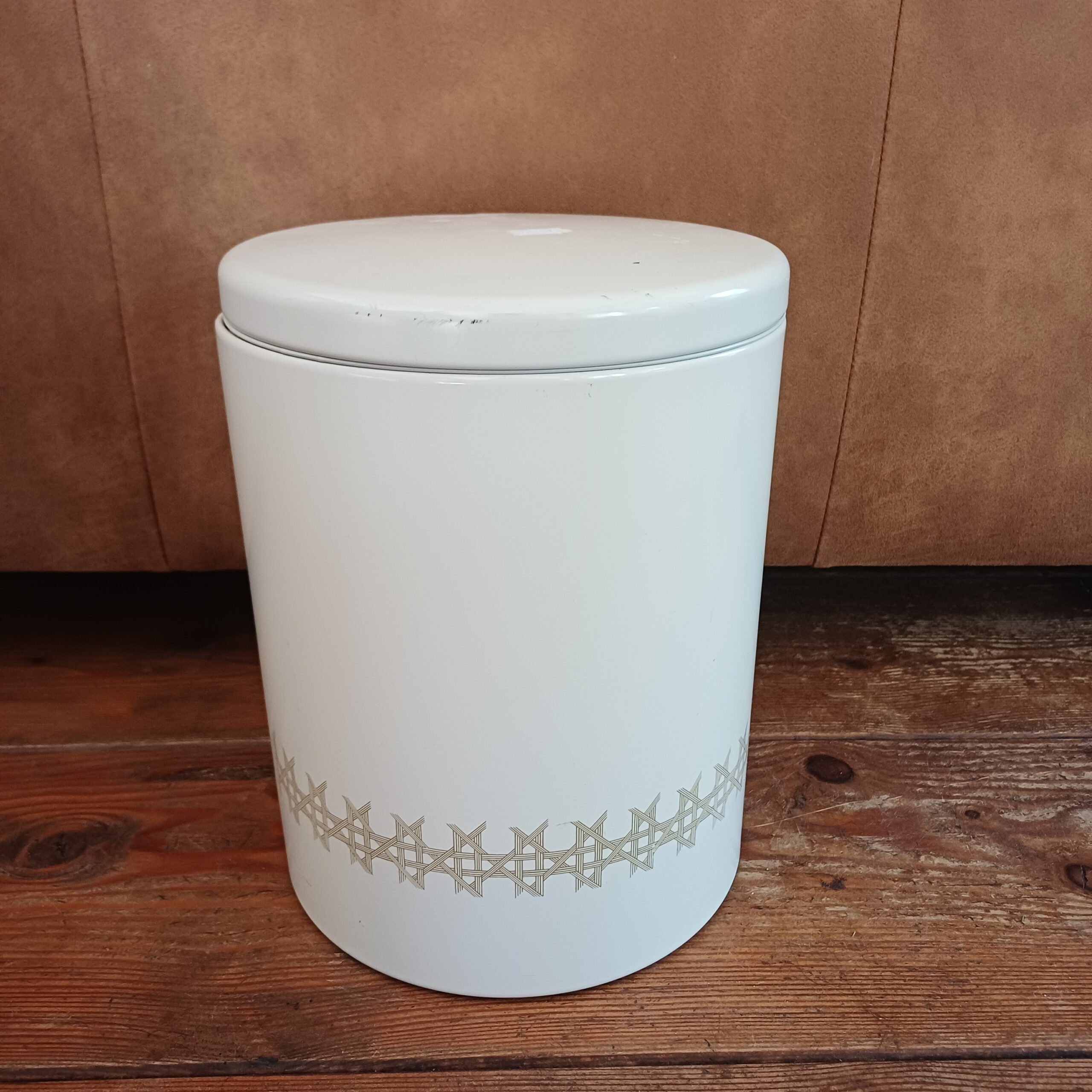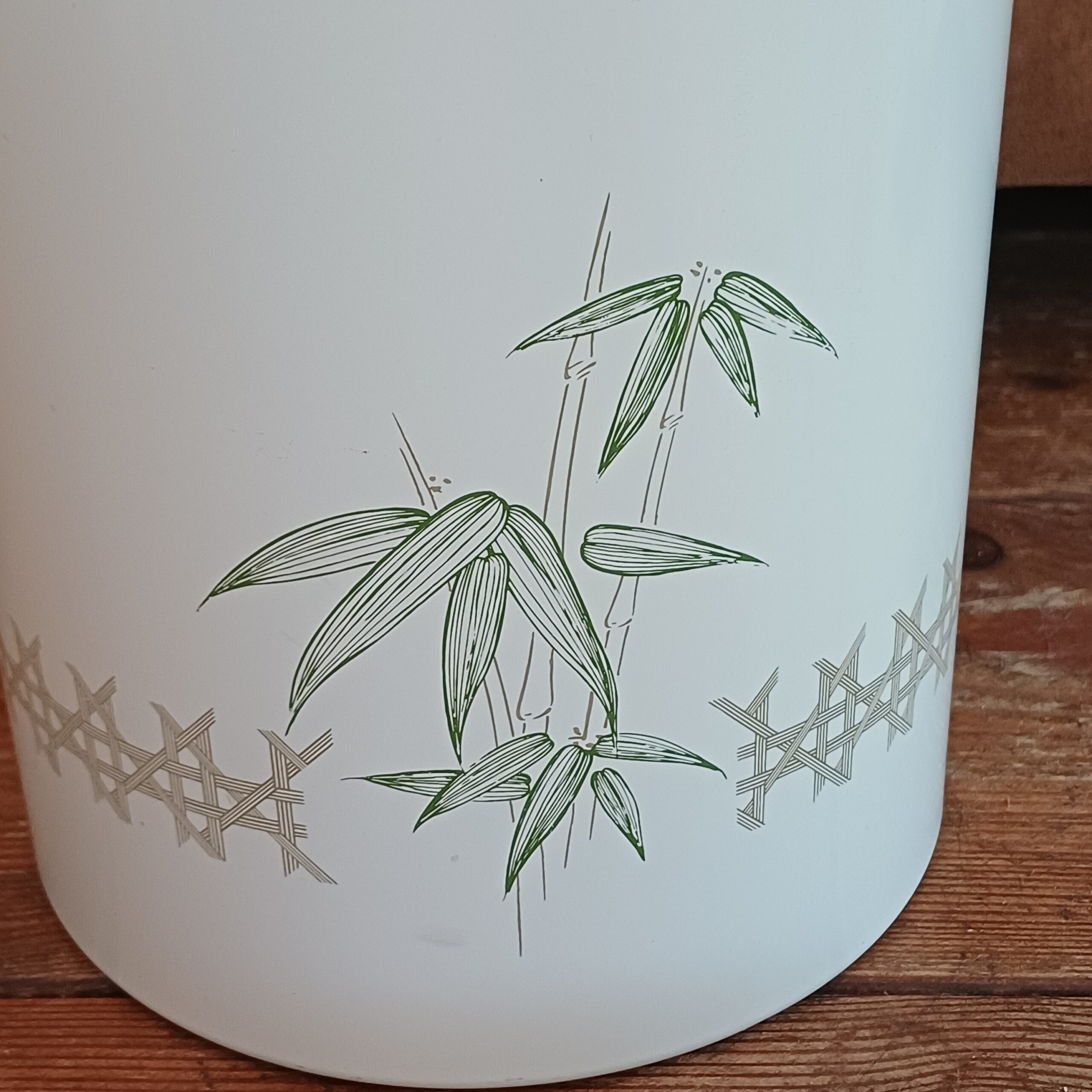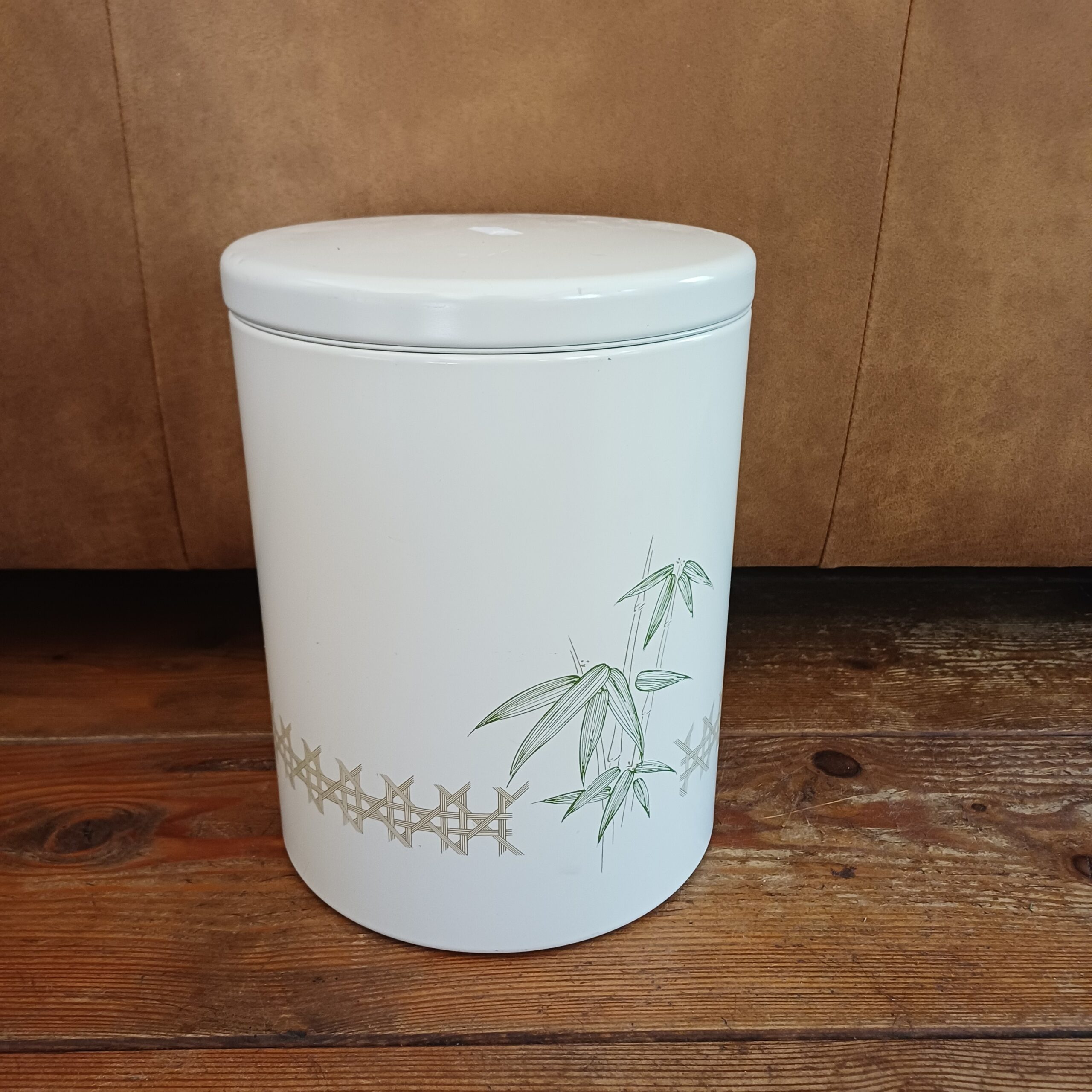 Mooi groot Brabantia blik met een decoratief patroon en wat bamboe. Het blik is 26,5 cm hoog met een diameter van 20,5 cm.