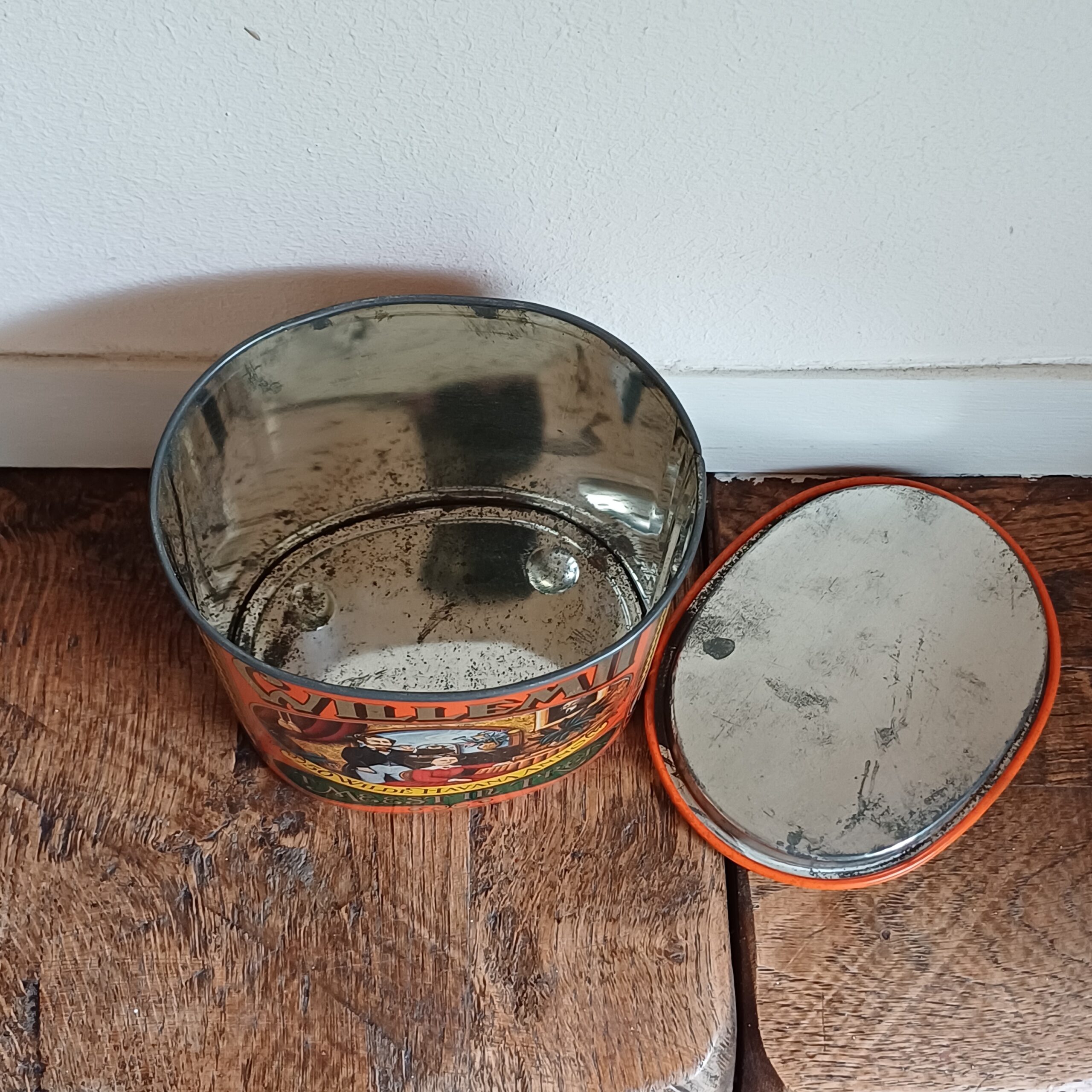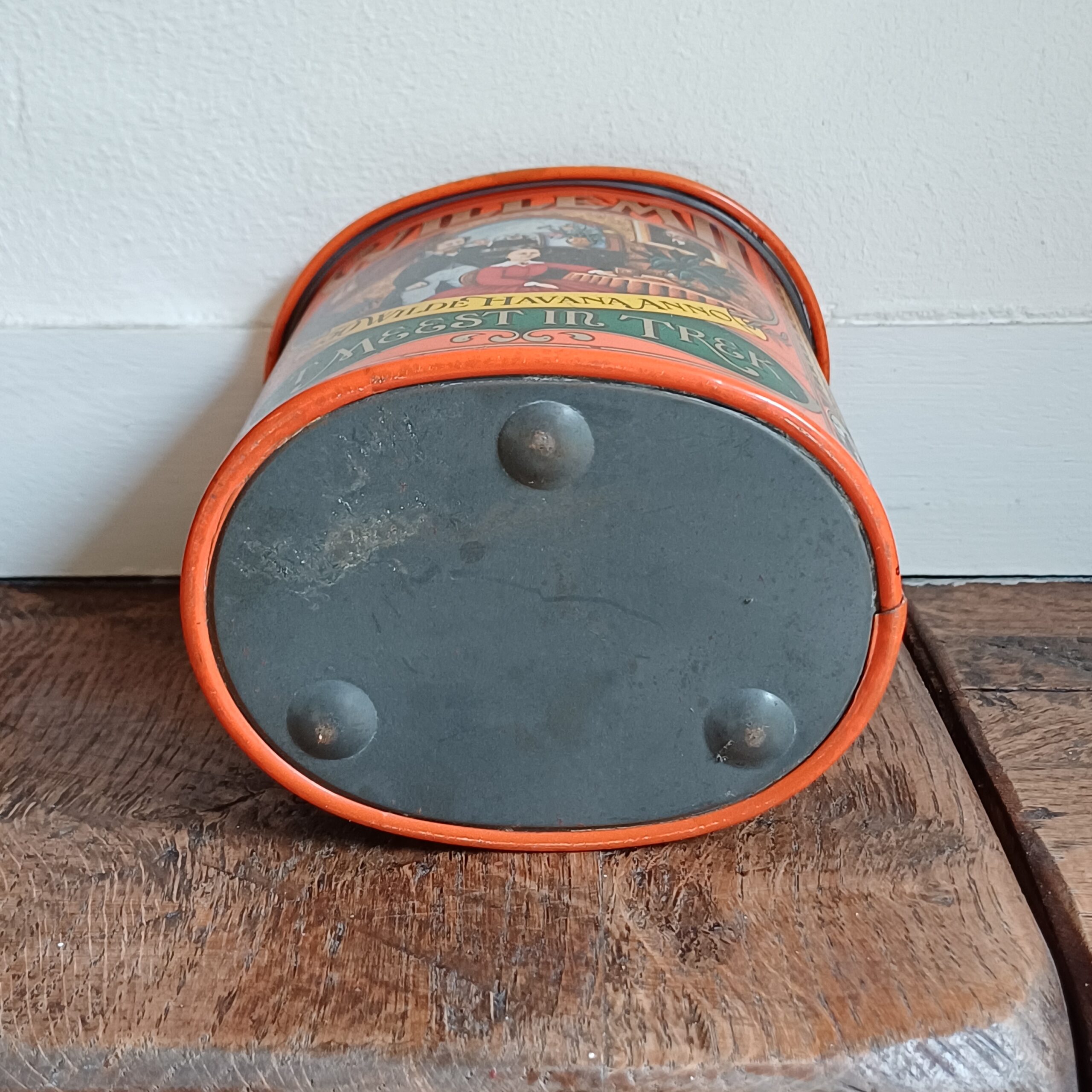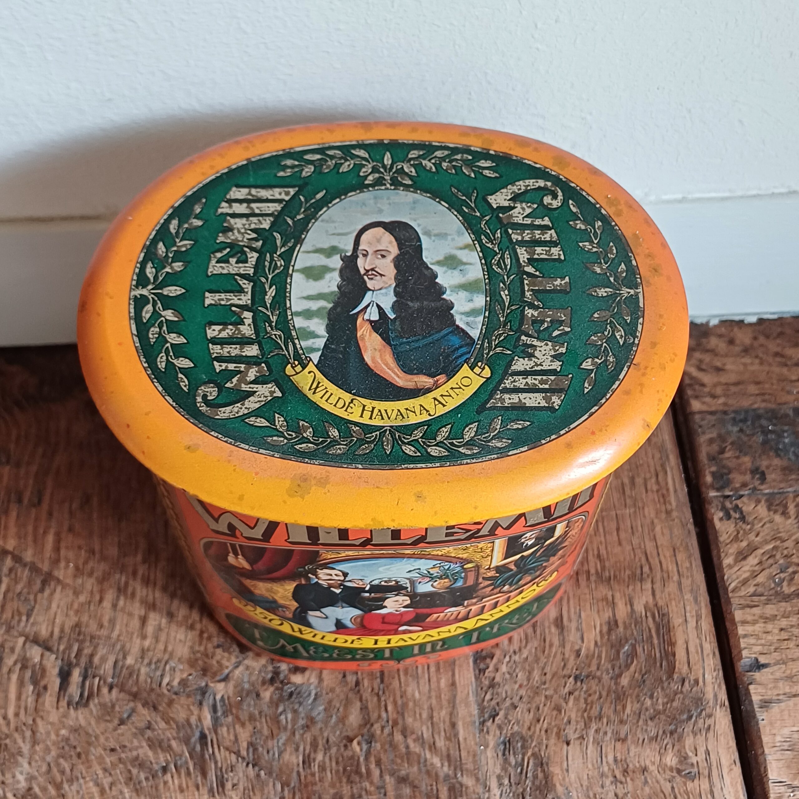 Ovaal blik van Willem II, waarin 50 wilde Havana sigaren gezeten hebben. ’t Meest in trek. Oranje blik met groene accenten. Uit Valkenswaard.