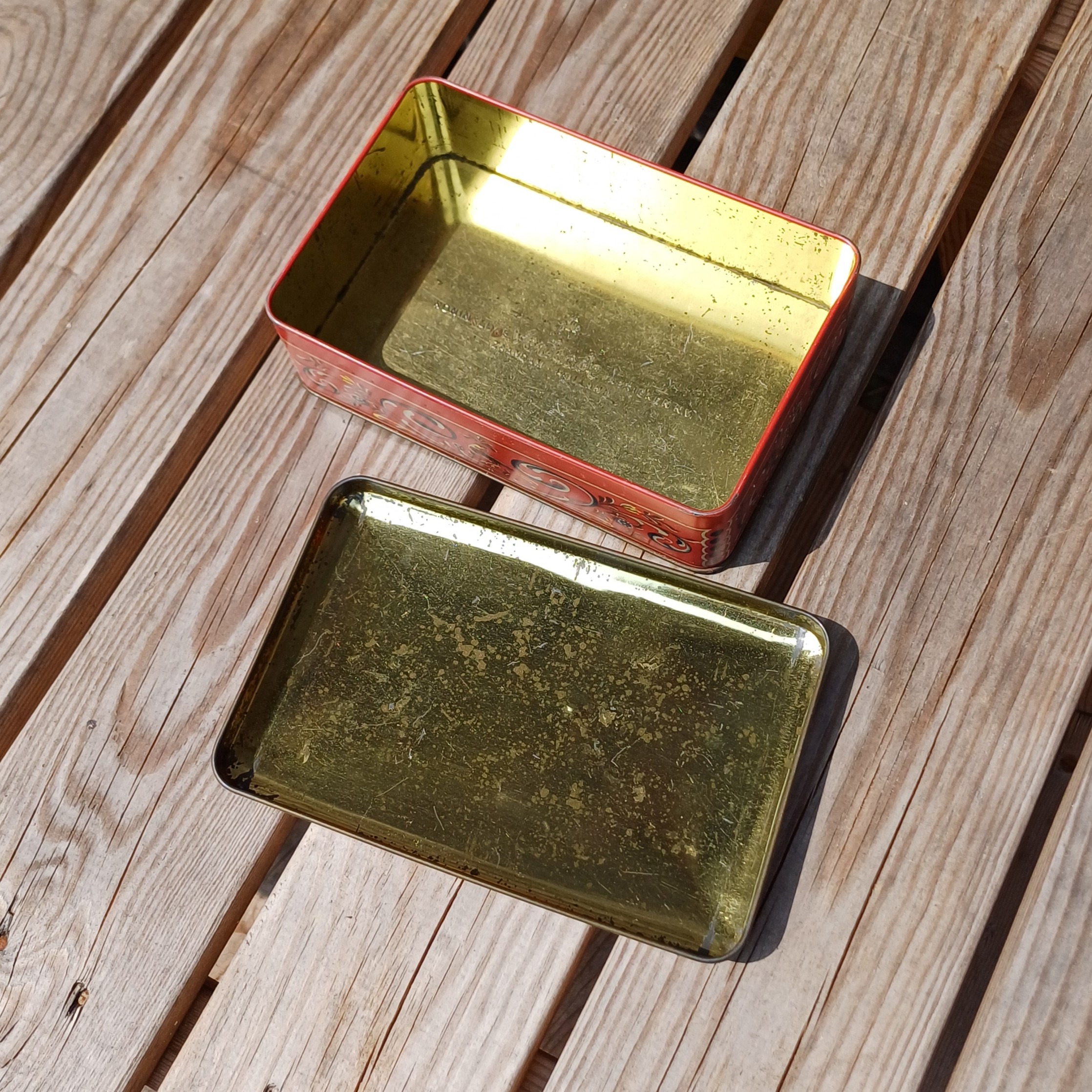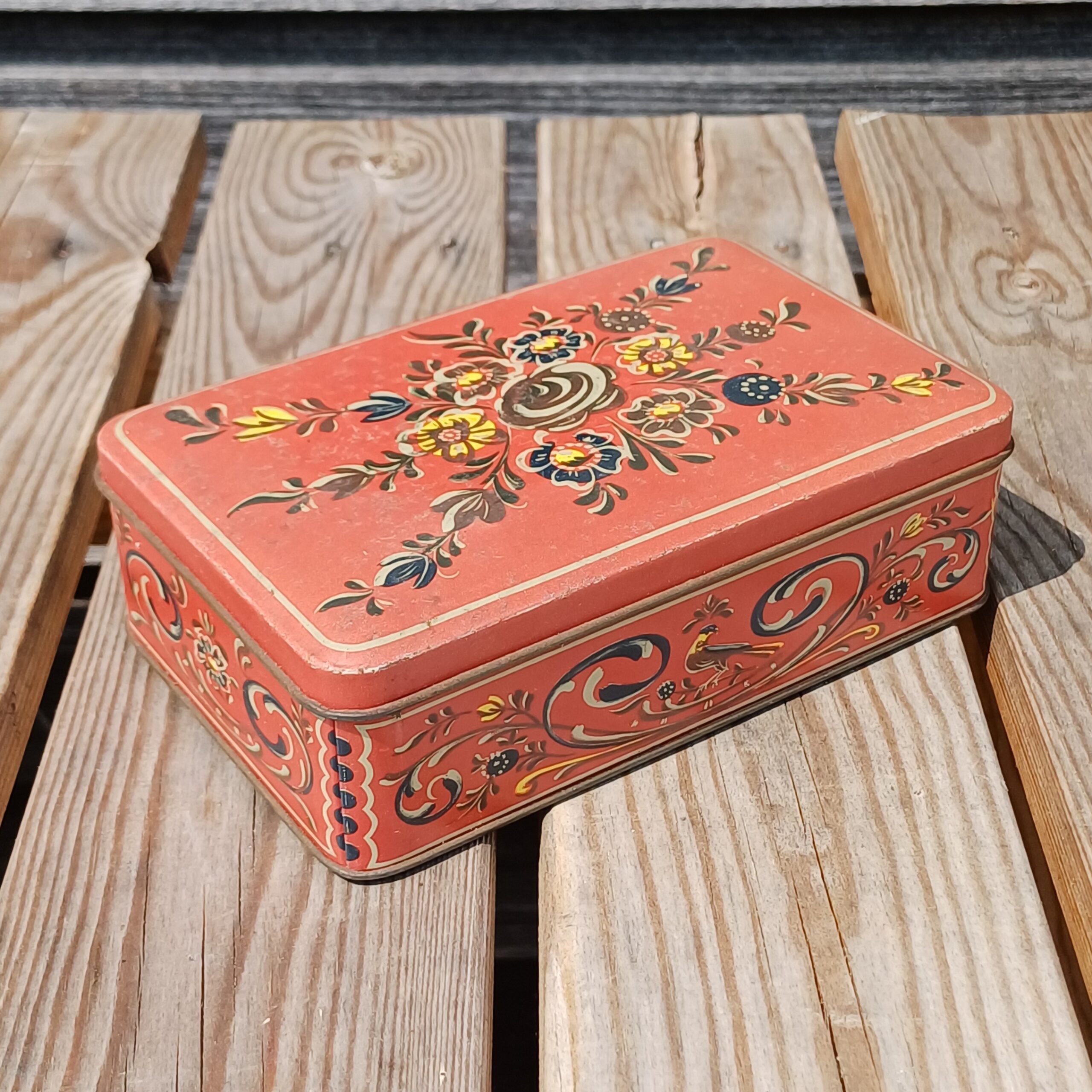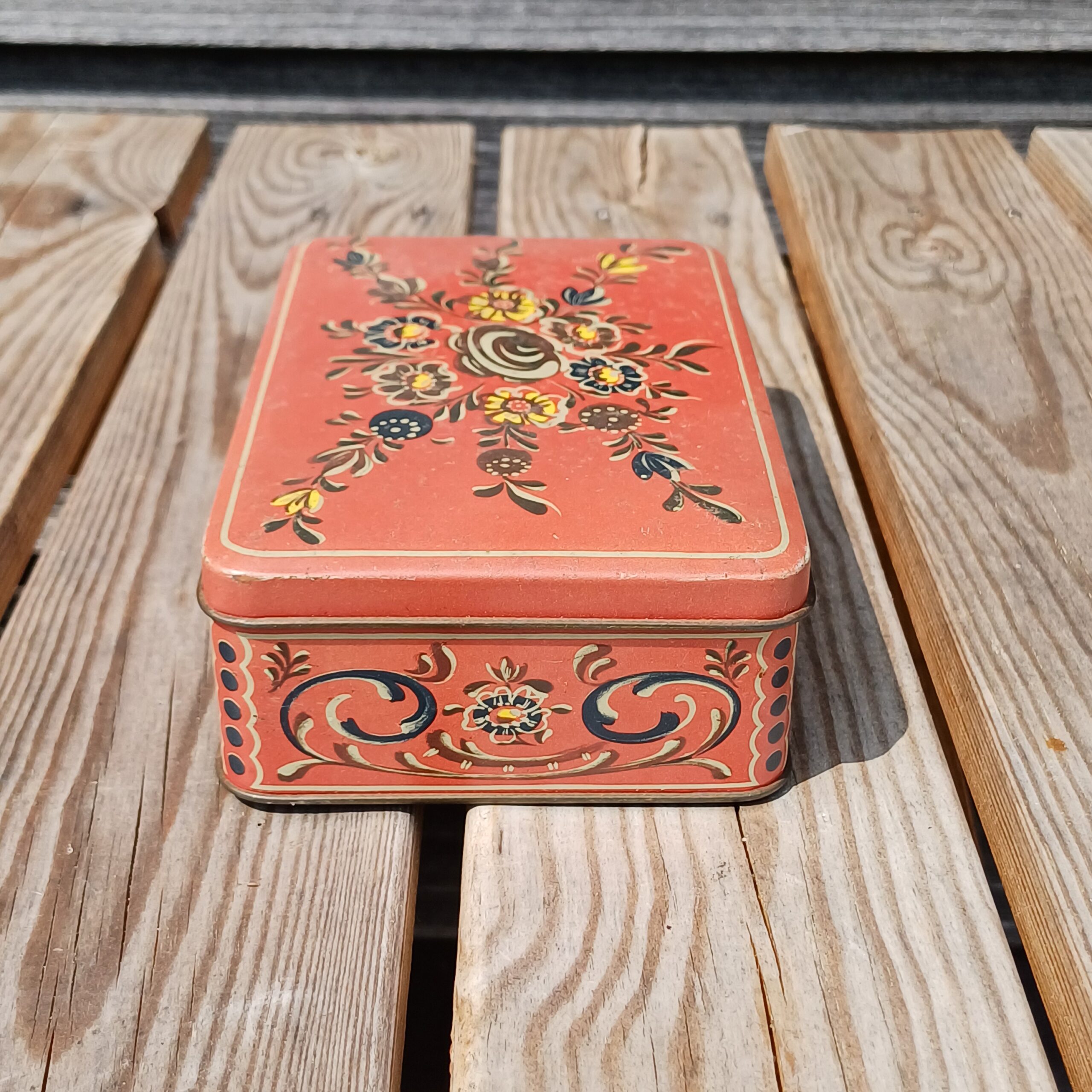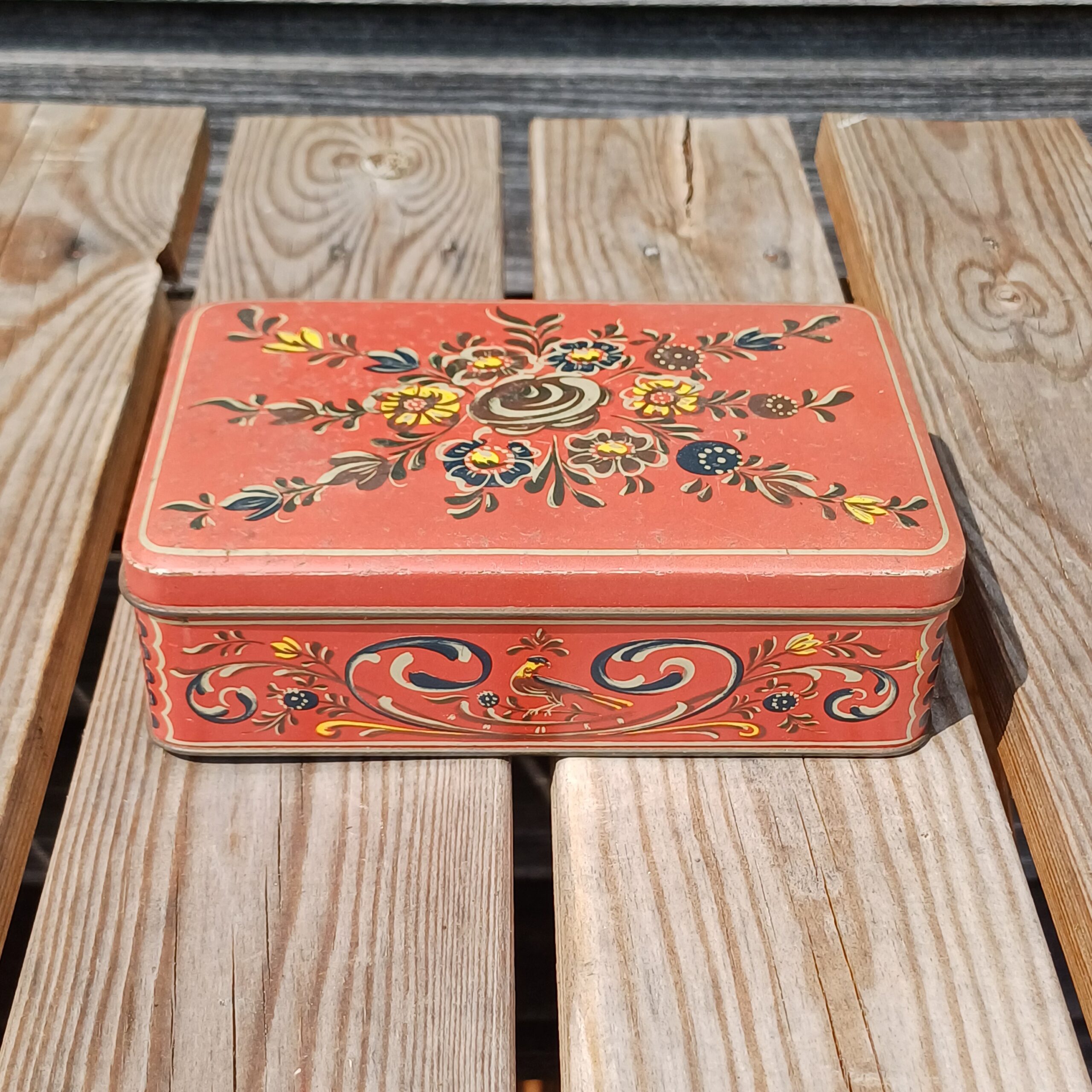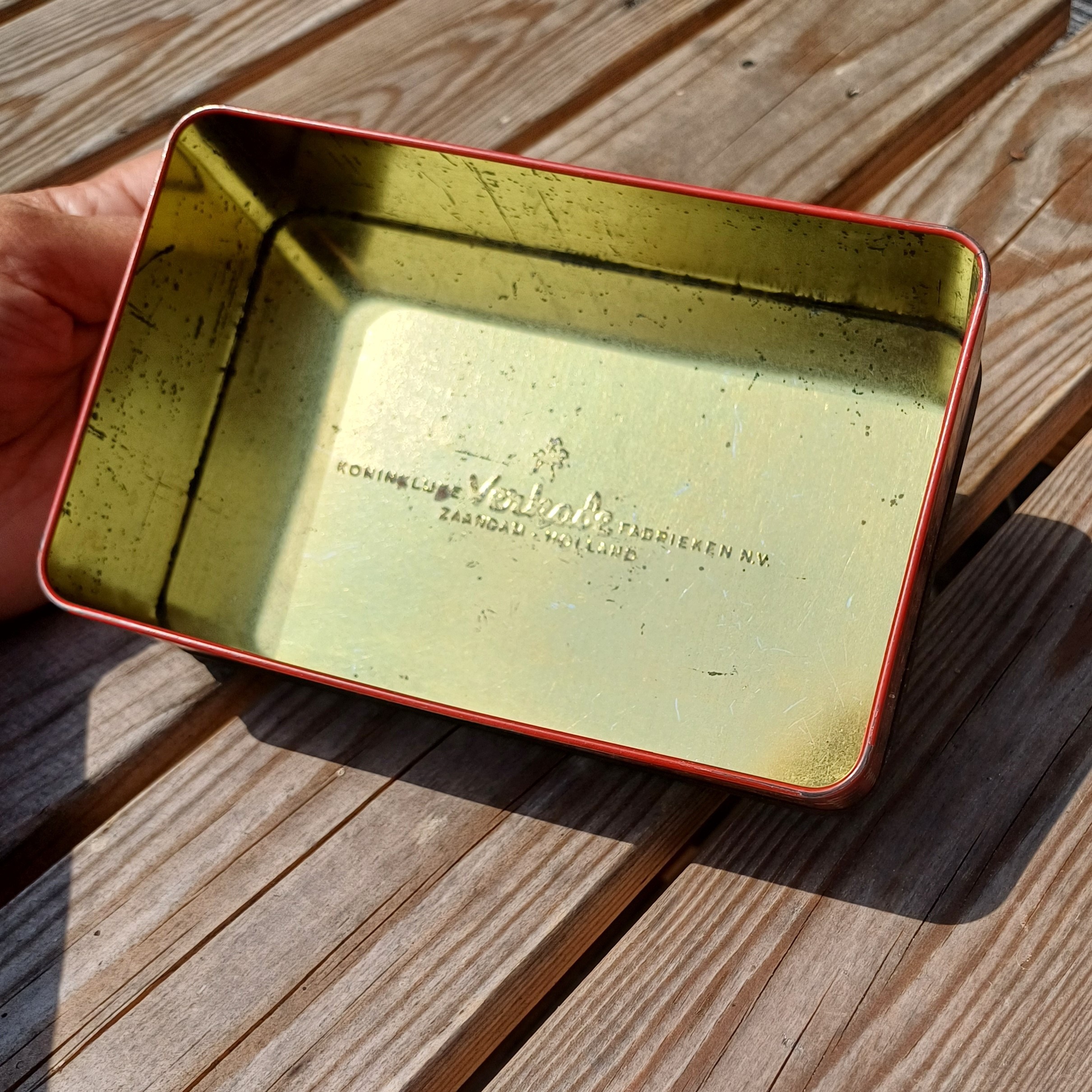 Vintage Verkade blik met bloemen. Dit blik is in 1965 gemaakt door het Nederlandse bedrijf Koninklijke Verkade Fabrieken N.V. Zaandam, Holland, zoals gedrukt langs de onderkant. Het was bedoeld voor Nederlandse koekjes genaamd ‘Langetjes’ en is slechts een zeer korte periode geproduceerd. Het is in de stijl van Hindeloopen schilderwerk, met bloemen erop en een vogel aan de voor- en achterkant.