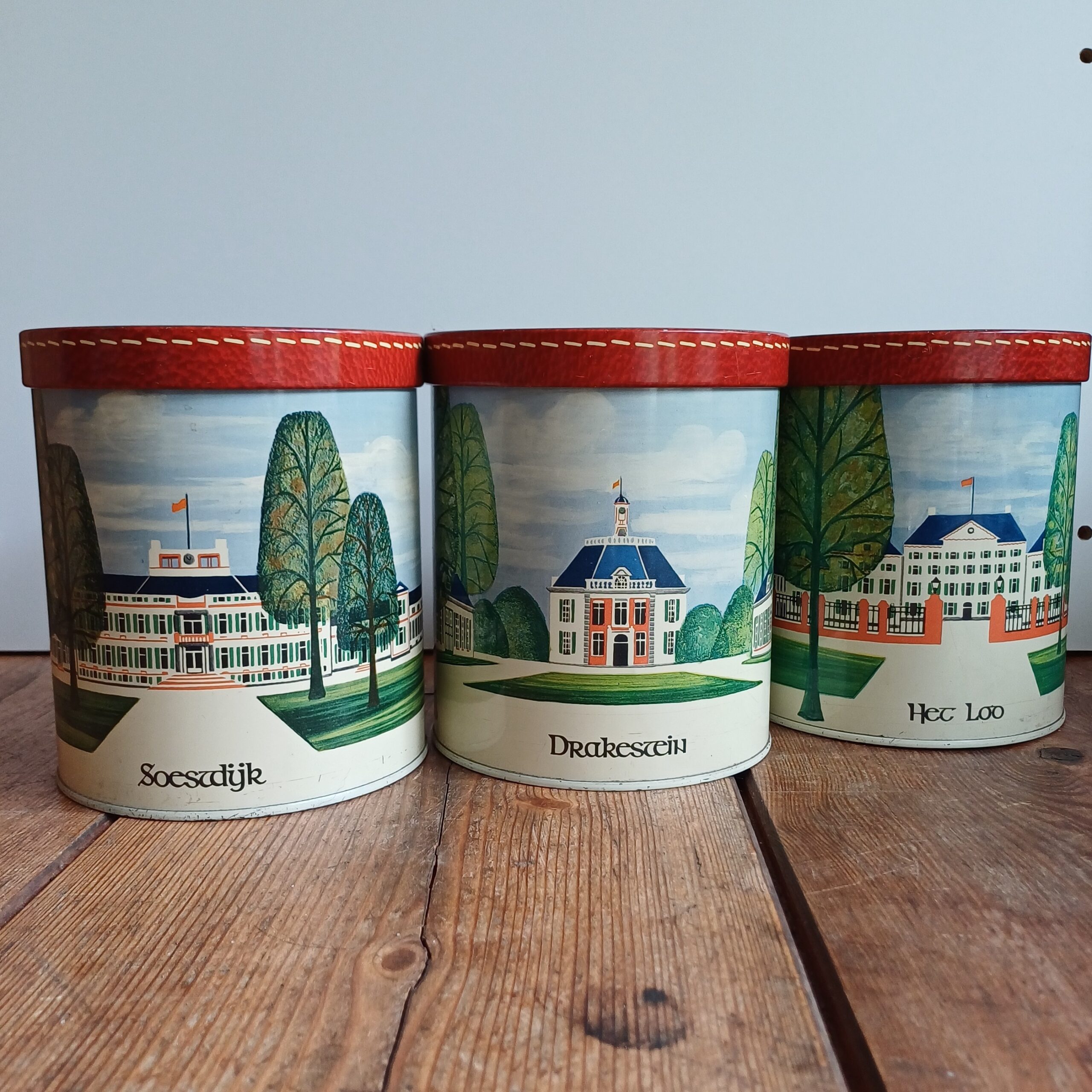 Toffe set van 3 blikken met de Paleis het Loo, Kasteel Drakestein en Paleis Soestdijk. Mooie blikken in nette vintage staat.