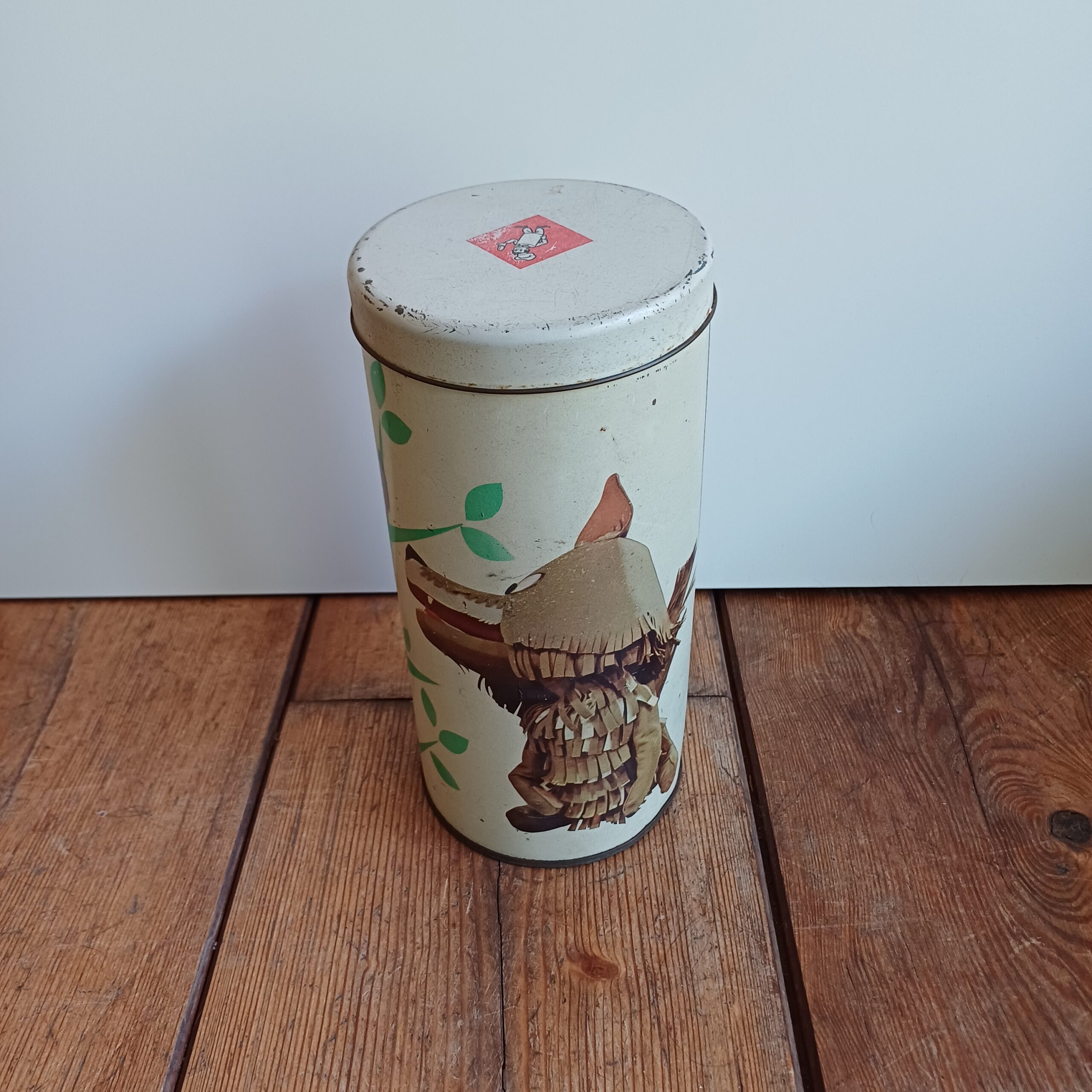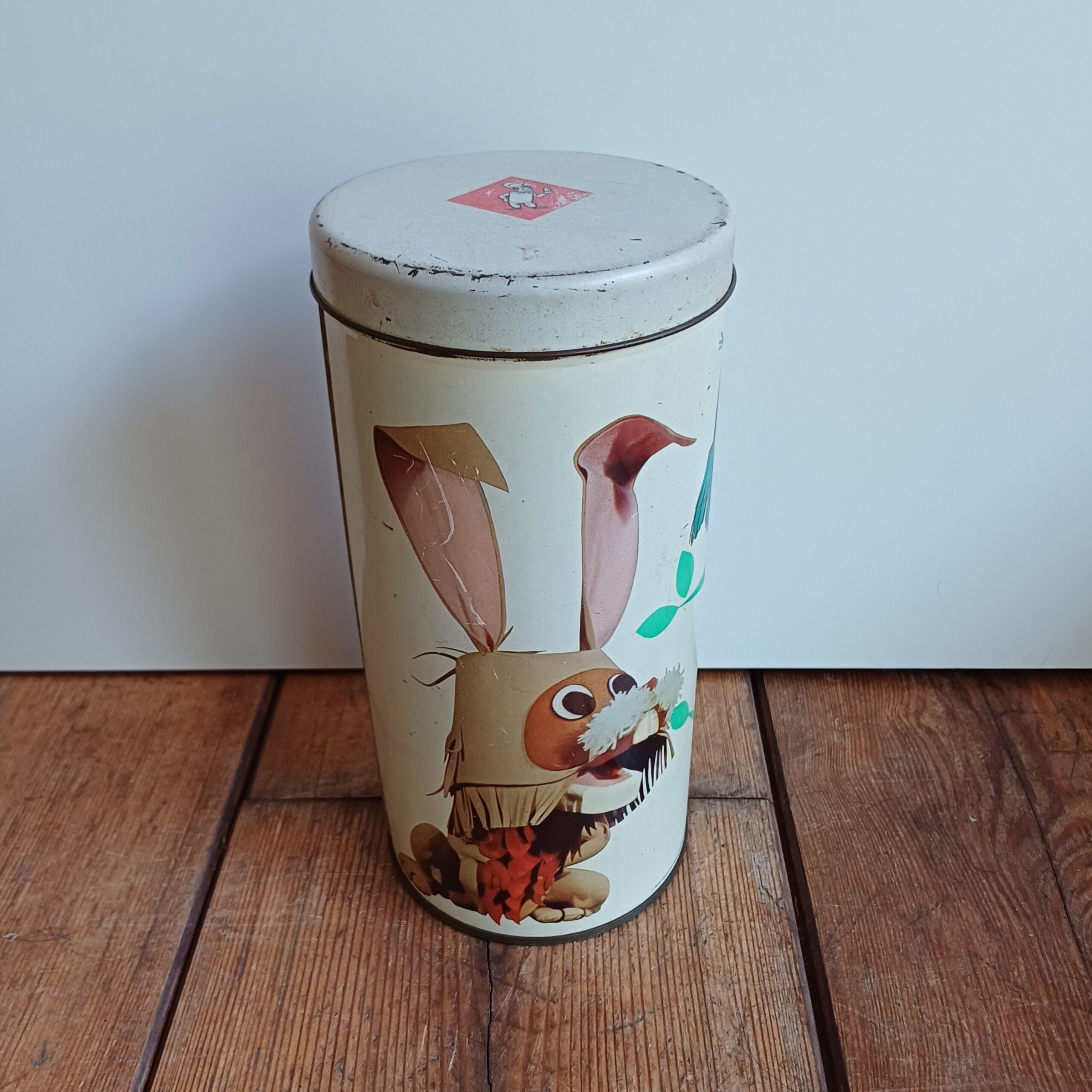 Vintage beschuitblik van de Fabeltjeskrant. Met afbeelding van Meneer de Uil, Zoef de Haas en Bor de Wolf. In goede vintage staat.