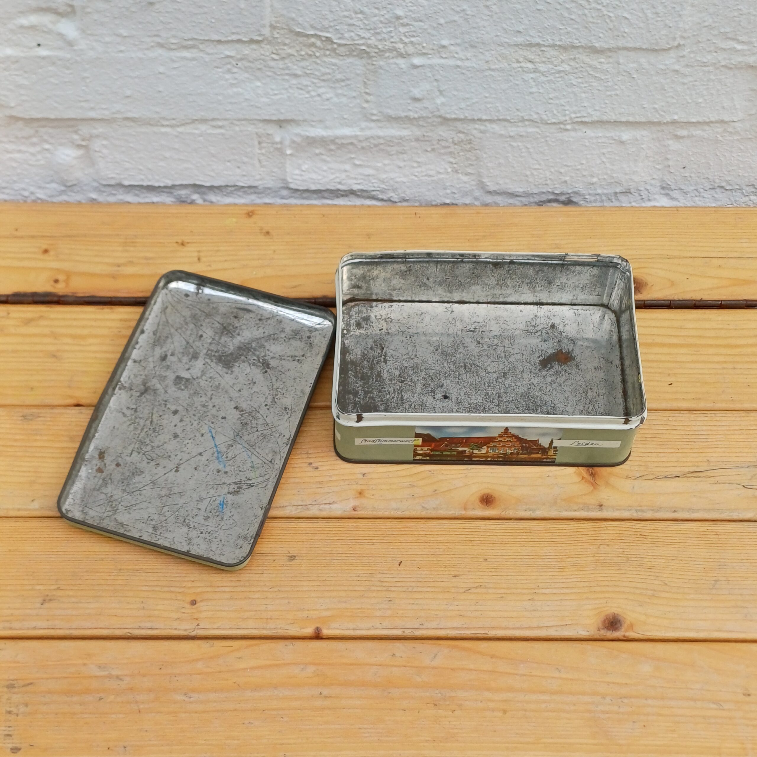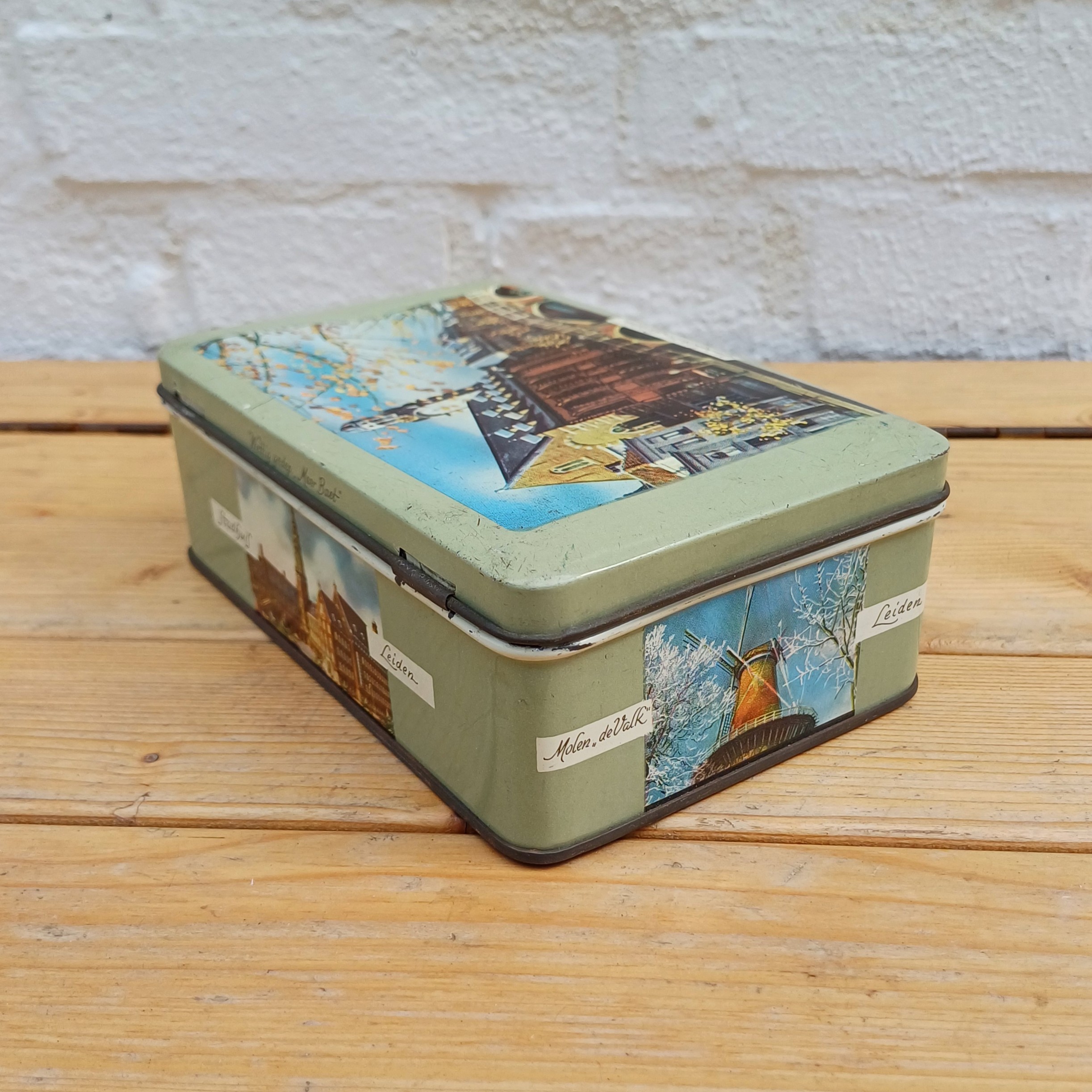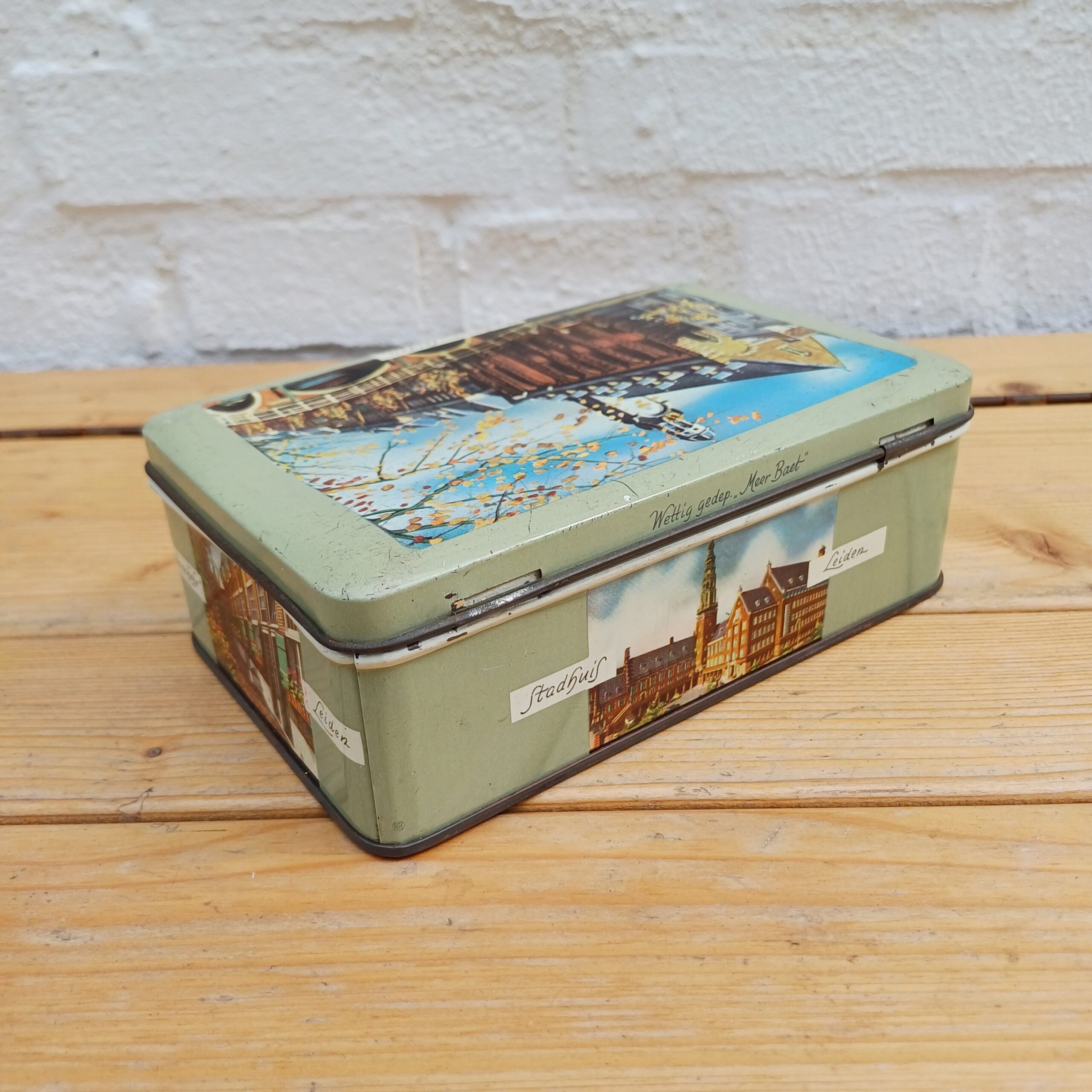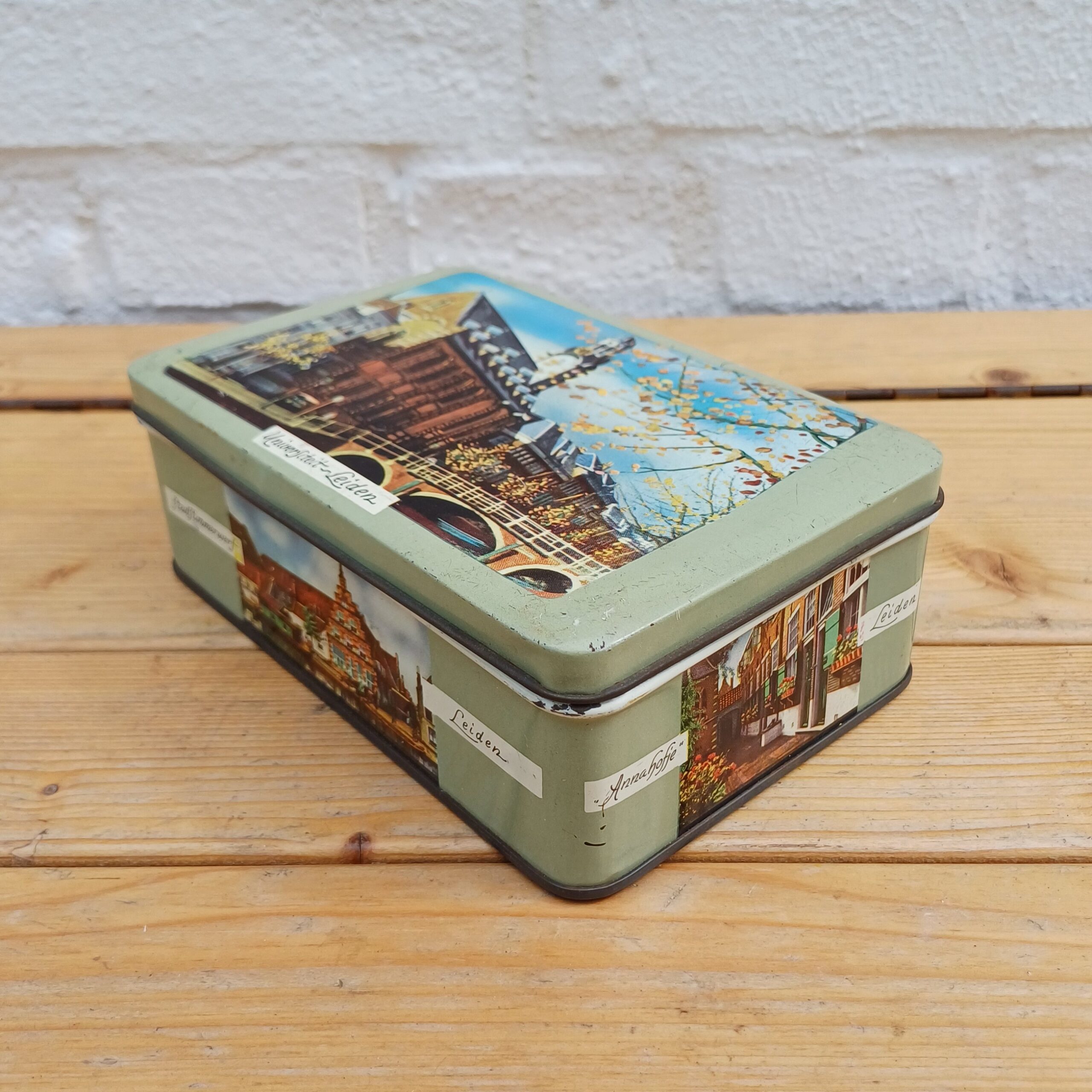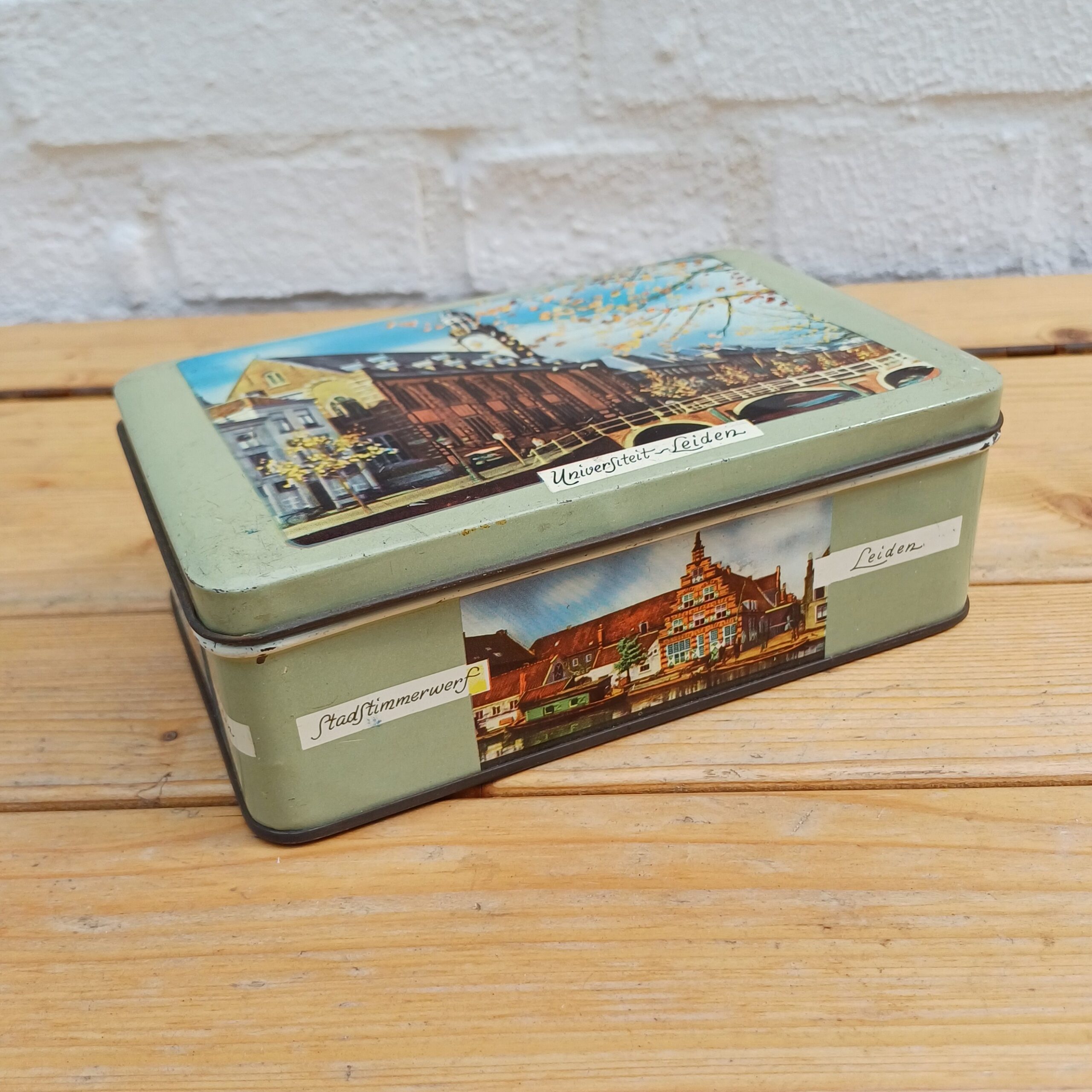 Vintage blik met afbeeldingen van Leiden uit de jaren ‘50. We zien foto’s van de Universiteit, Stadstimmerwerf, molen ‘De Valk’, het Stadhuis en het Annahofje. Scharnierdeksel is los.