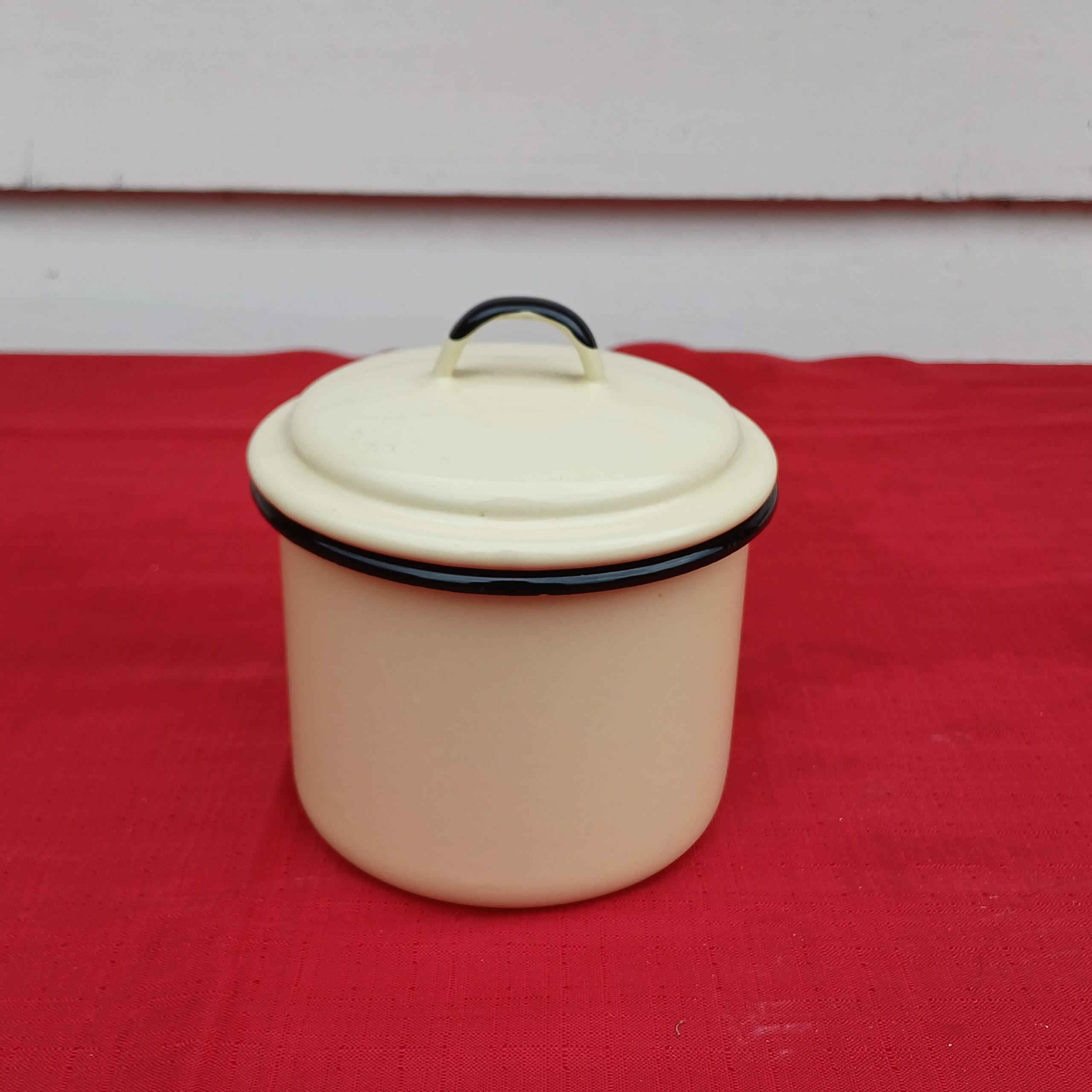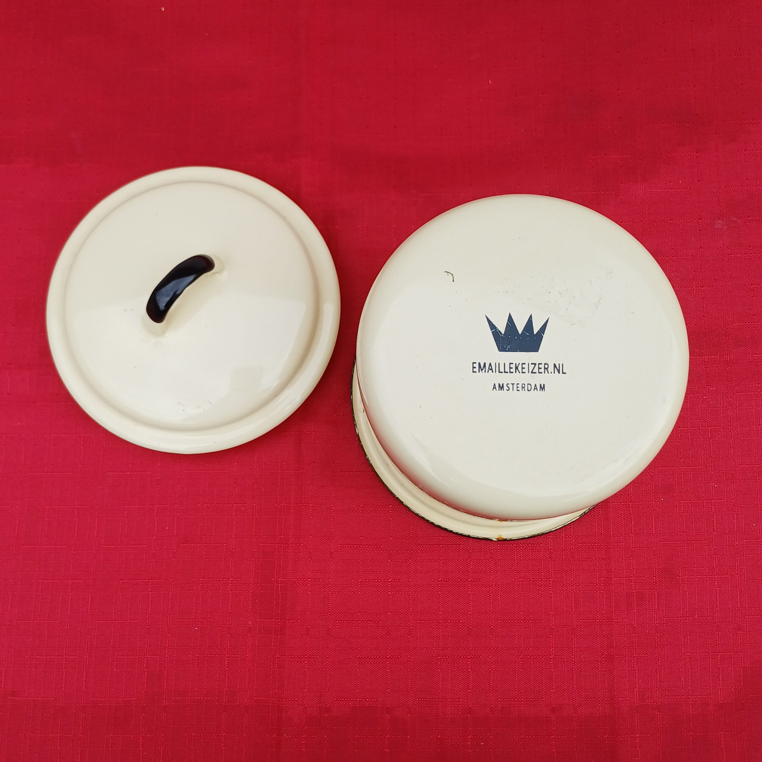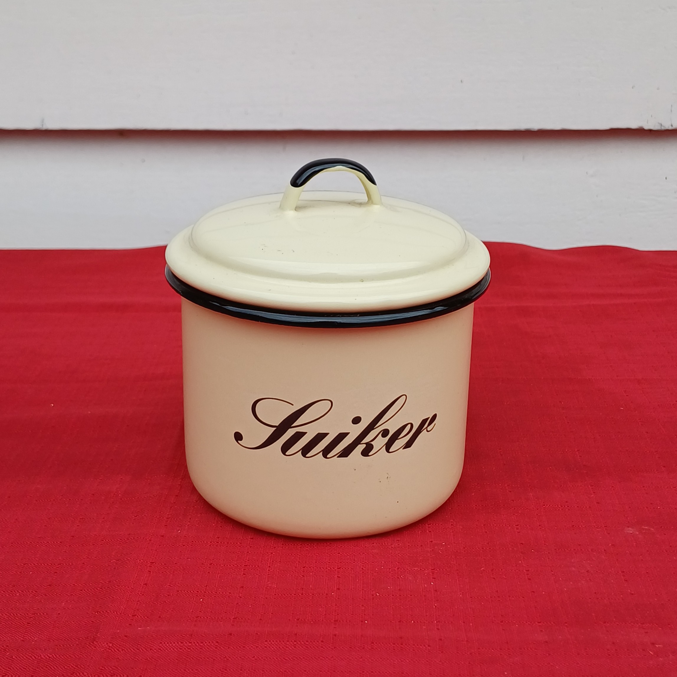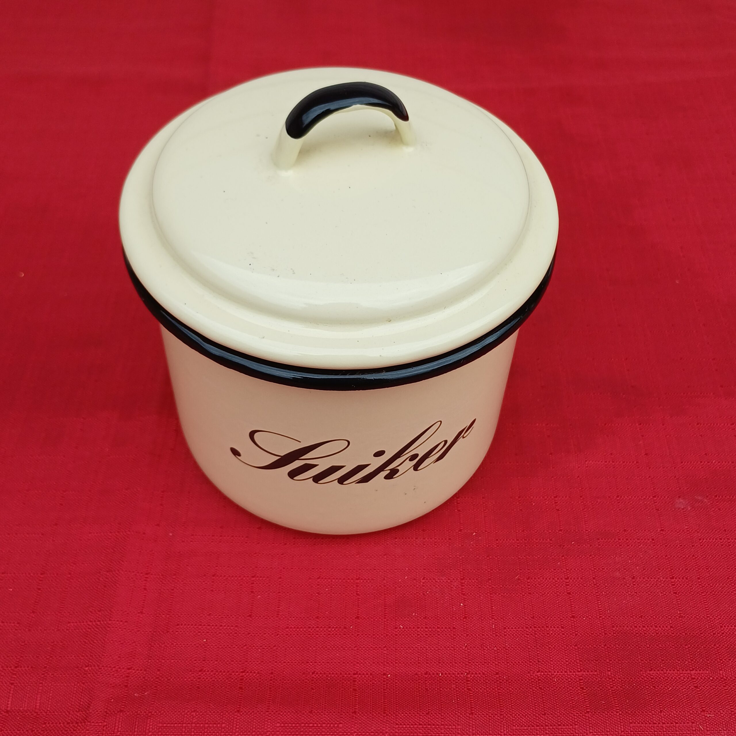Zeer mooie emaille suikerpot. Roomwit met een zwarte rand, zwart accent op het greepje en zwarte tekst. Onderop staat ‘emaillekeizer.nl’.