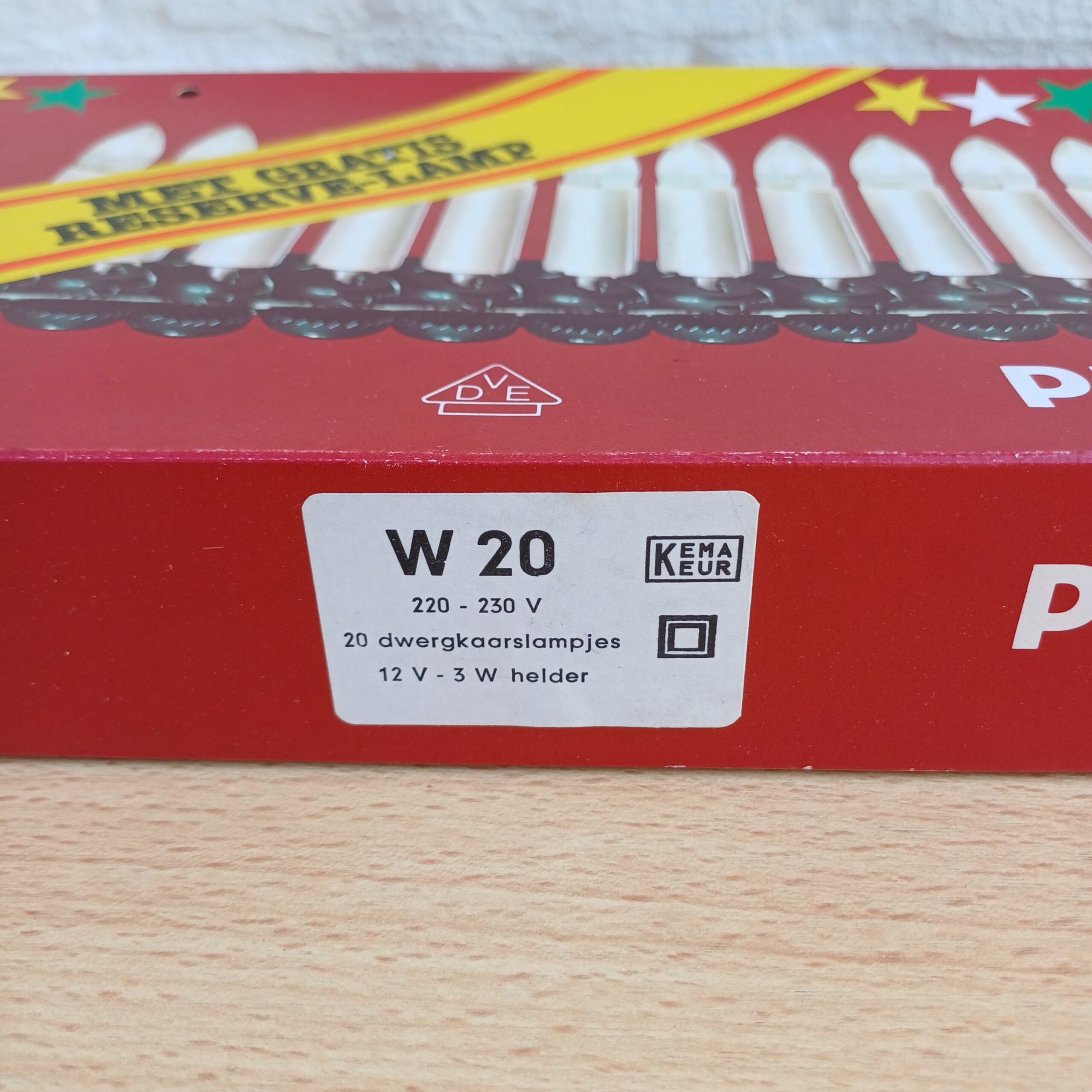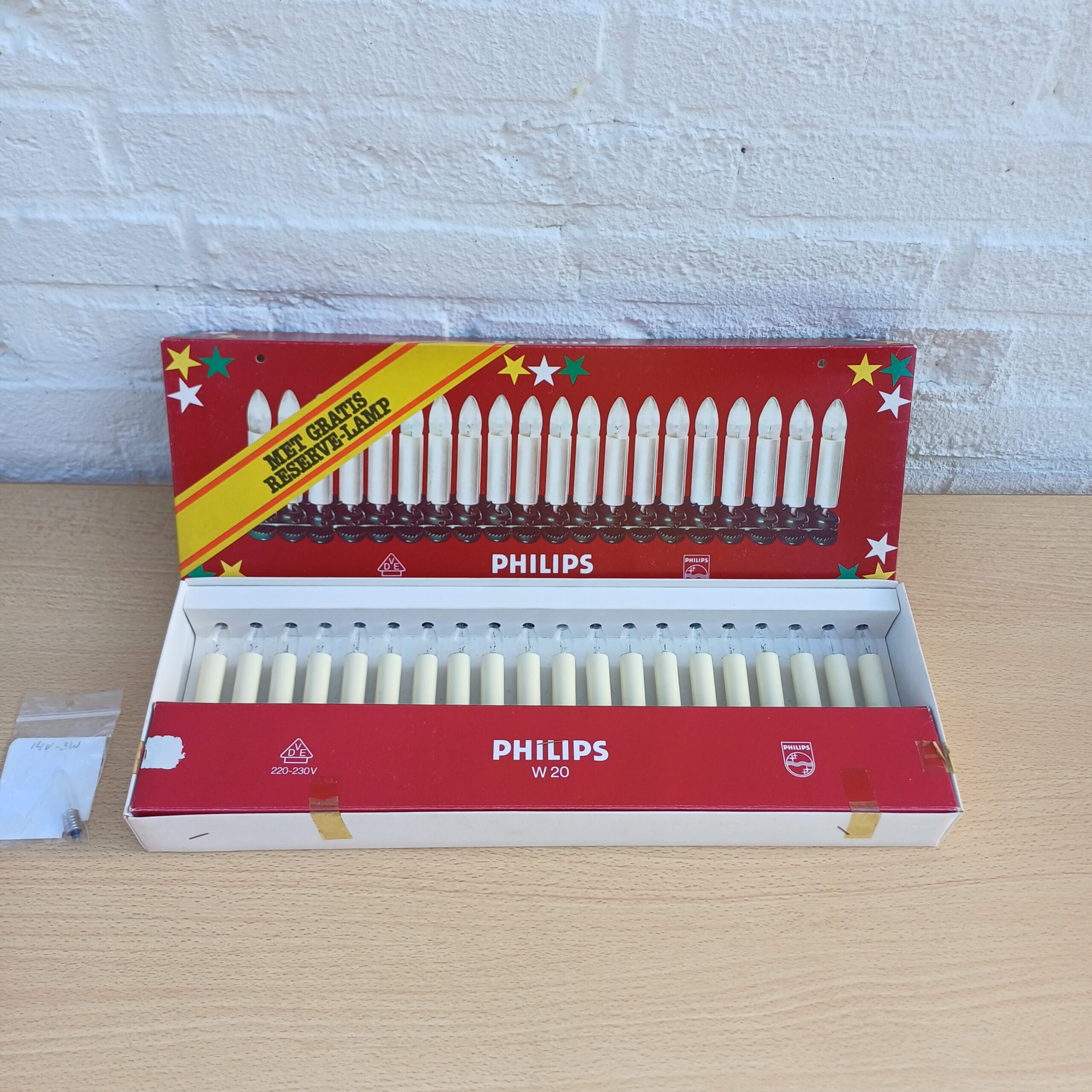 Een doos met kerstverlichting uit de jaren 60. Merk Philips. De doos bevat 20 dwergkaarslampjes van 15 watt, allemaal goed werkend. 220-230 volt. Inclusief reservelampje.