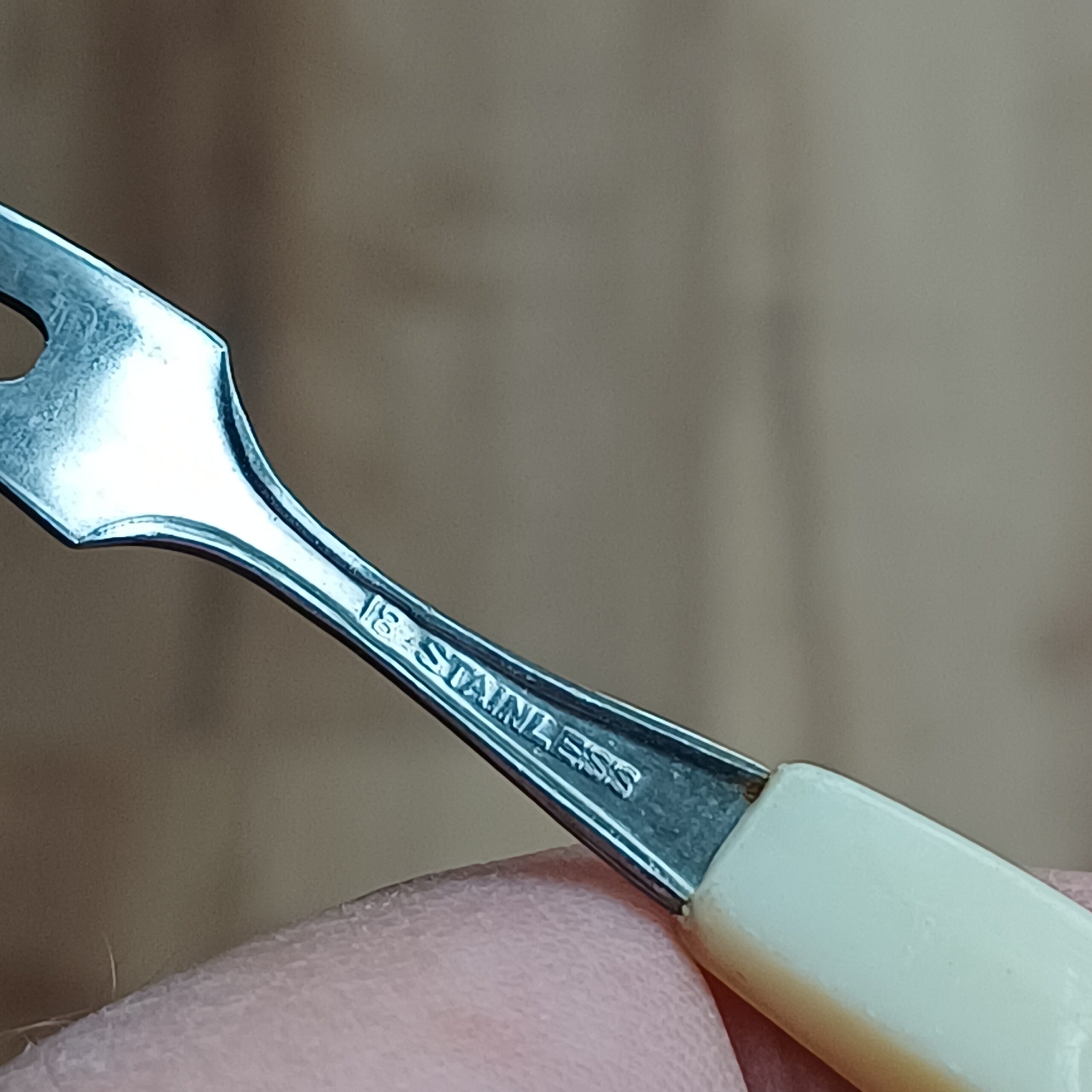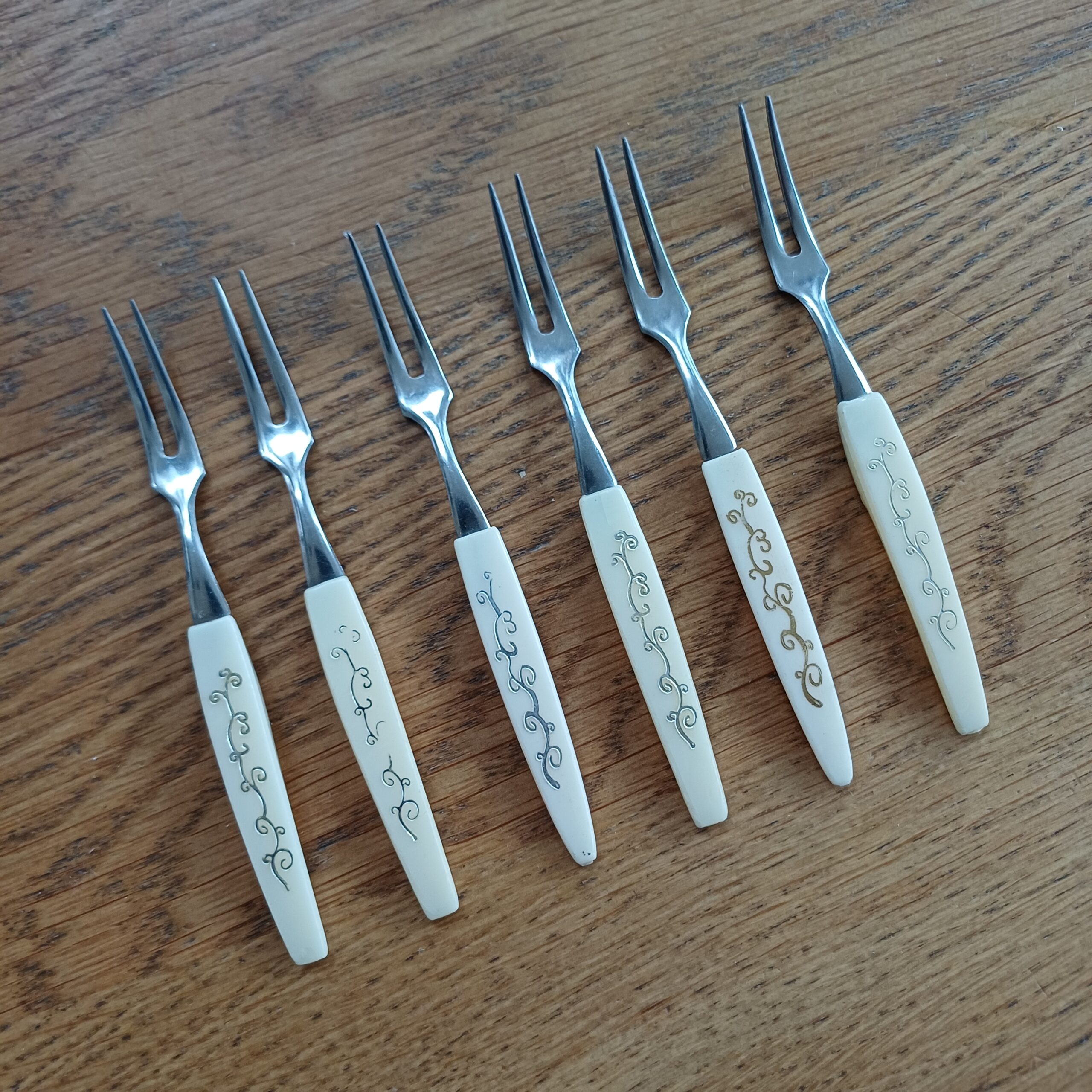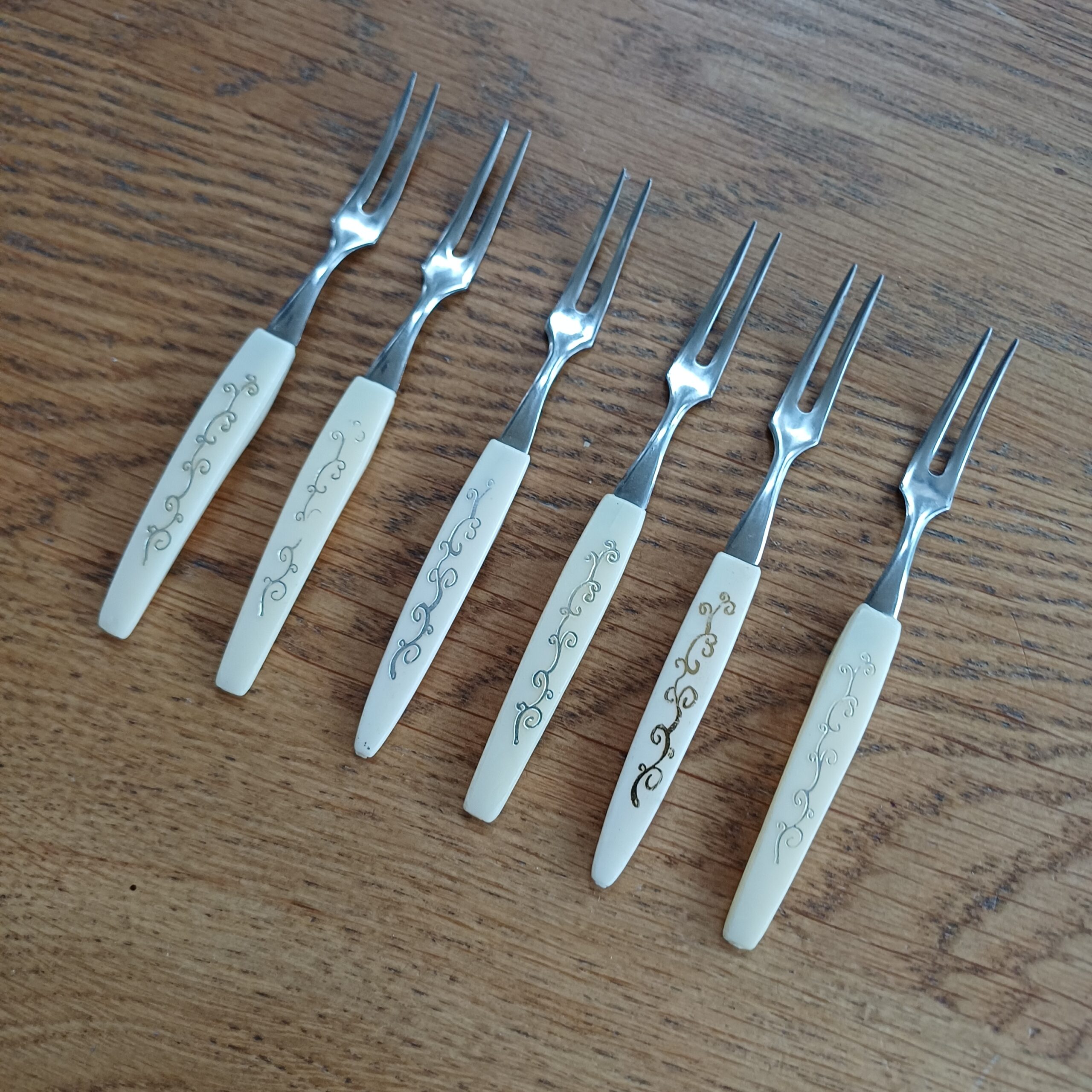 Setje van 6 crèmekleurige cocktailvorkjes met patroontje. Handig voor bij de tapas, maar ook bij de borrel, met kerst of bij een buffet.