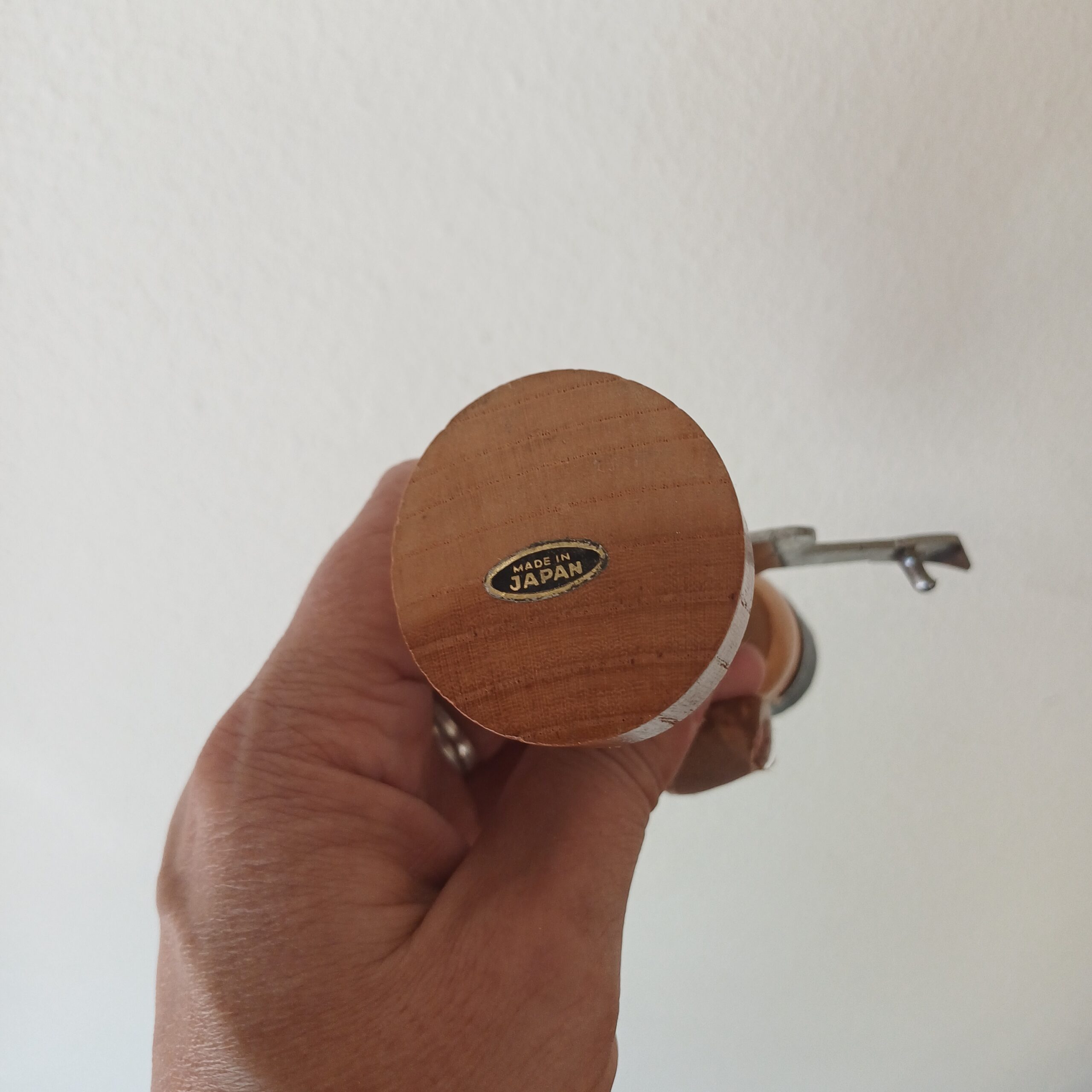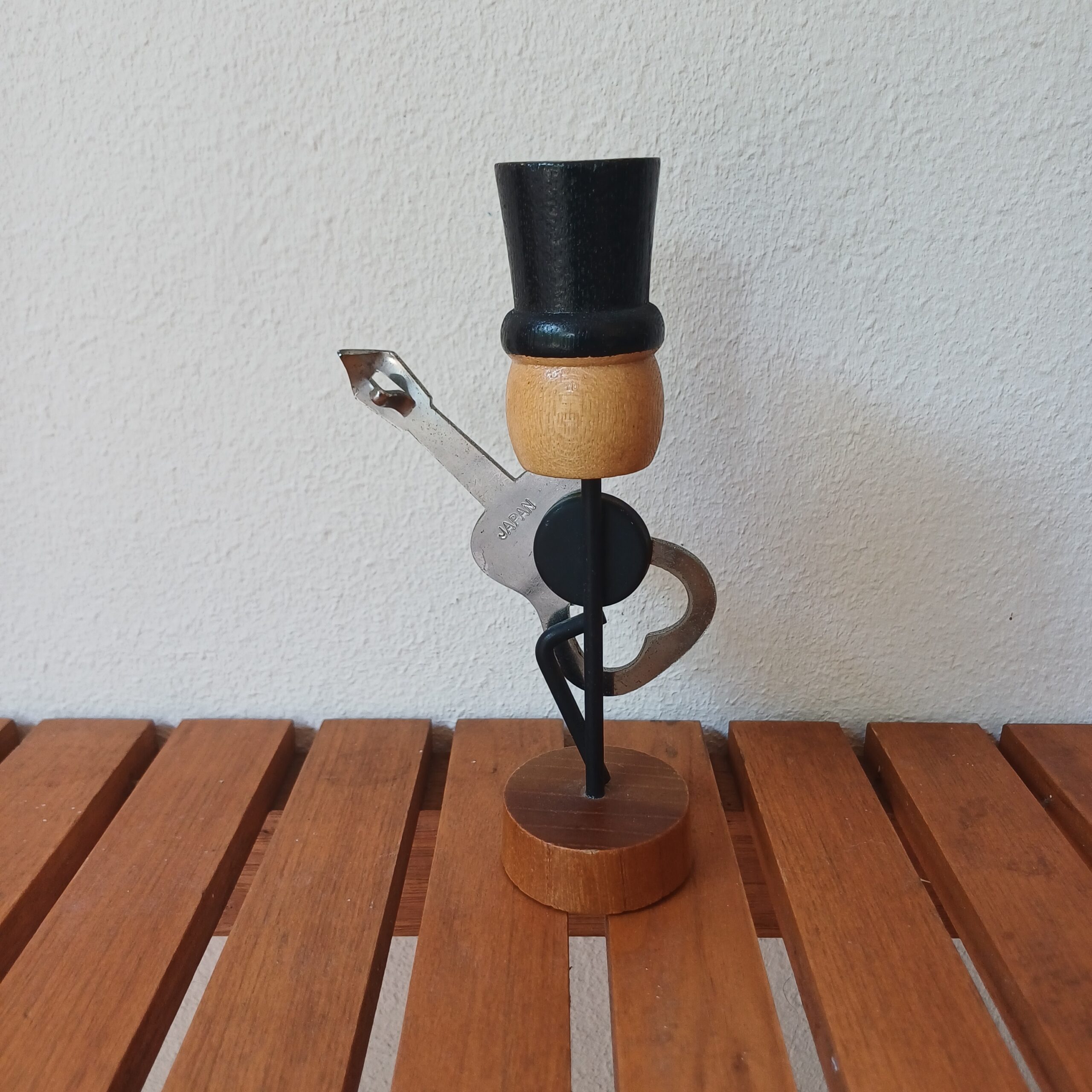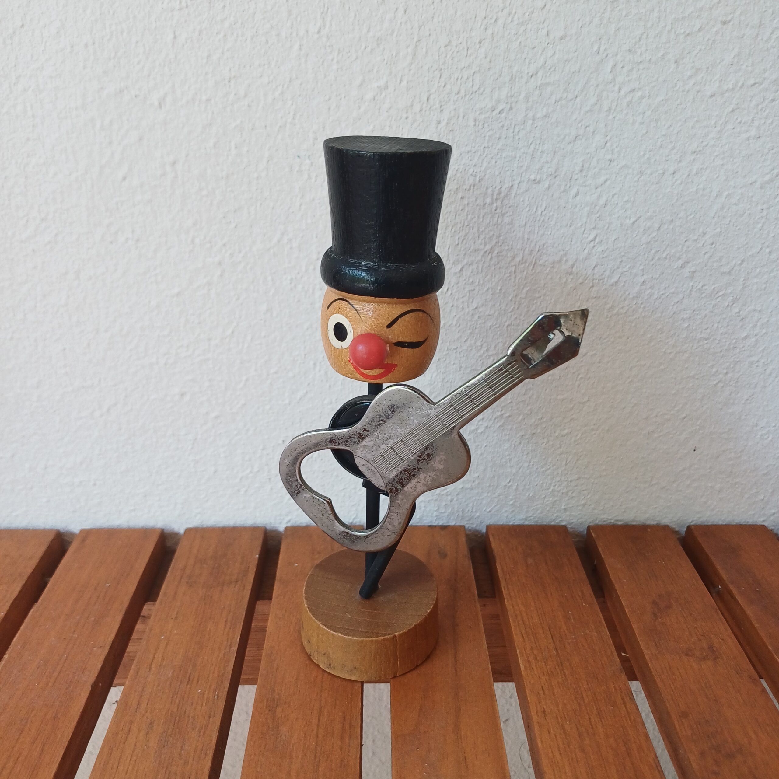 Magnetische flesopener Johnny Guitar, uit de jaren 50. Van hout en metaal, met een magneet waardoor het poppetje de gitaar vast kan houden en los kan laten. Johnny heeft een mooie rode neus en een zwarte hoge hoed.