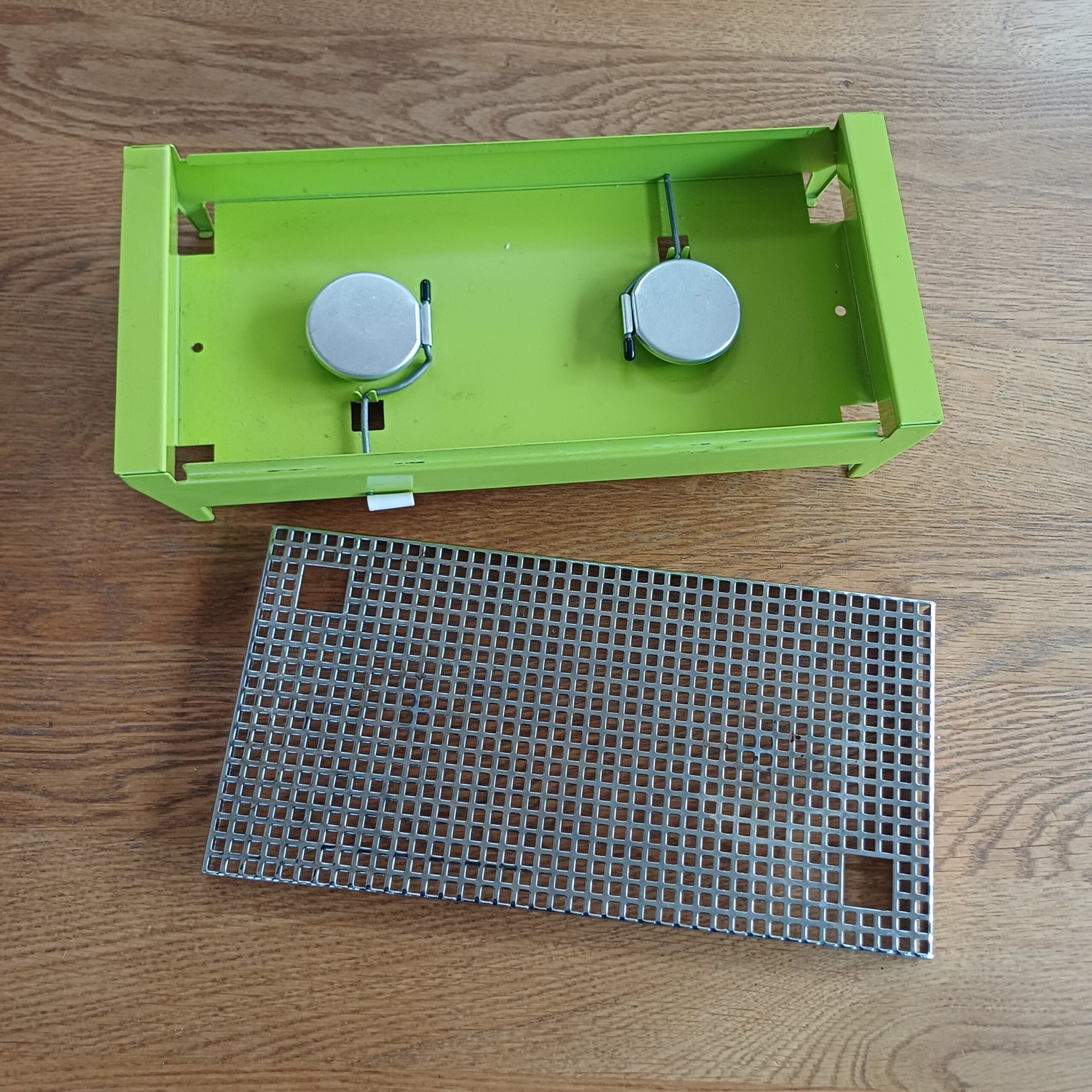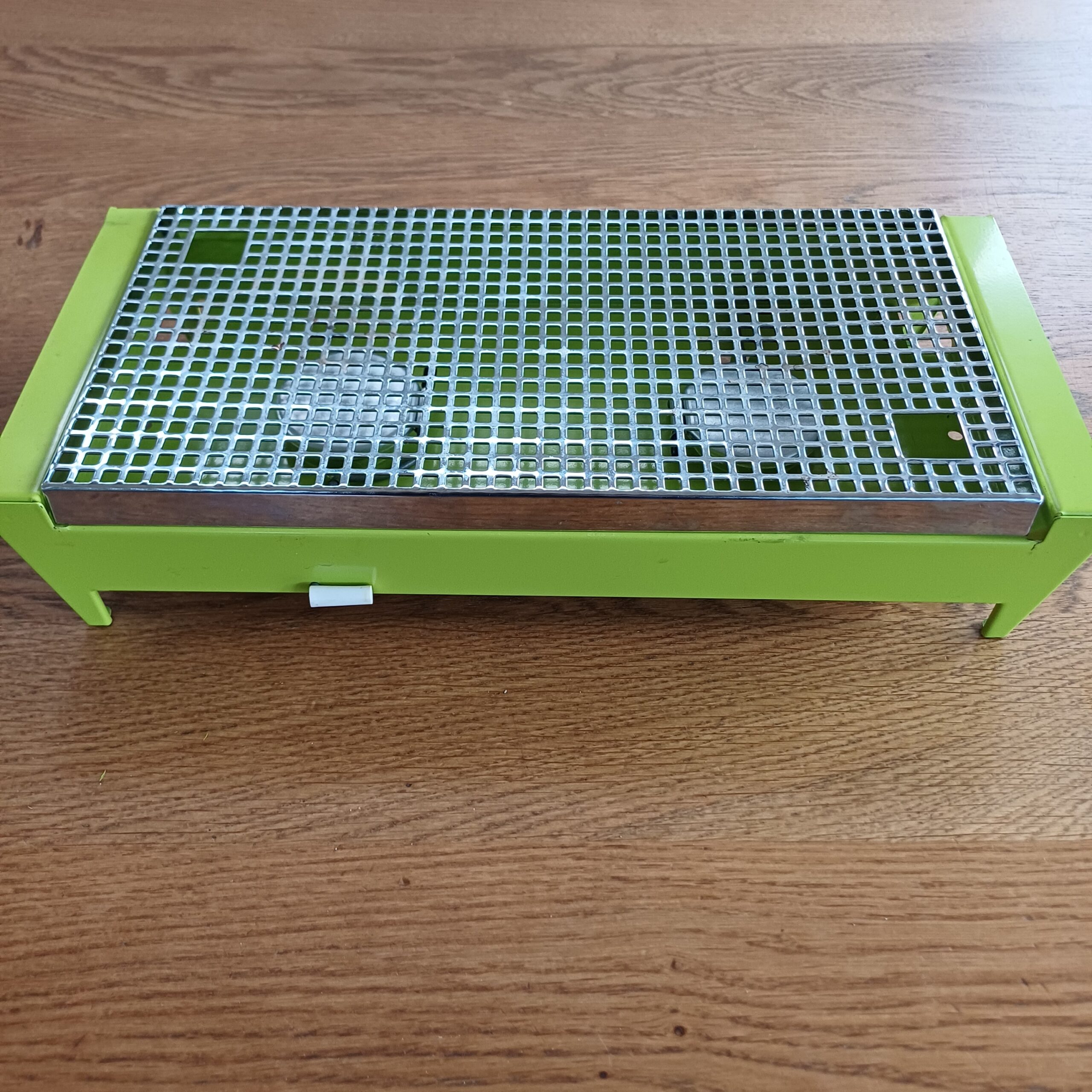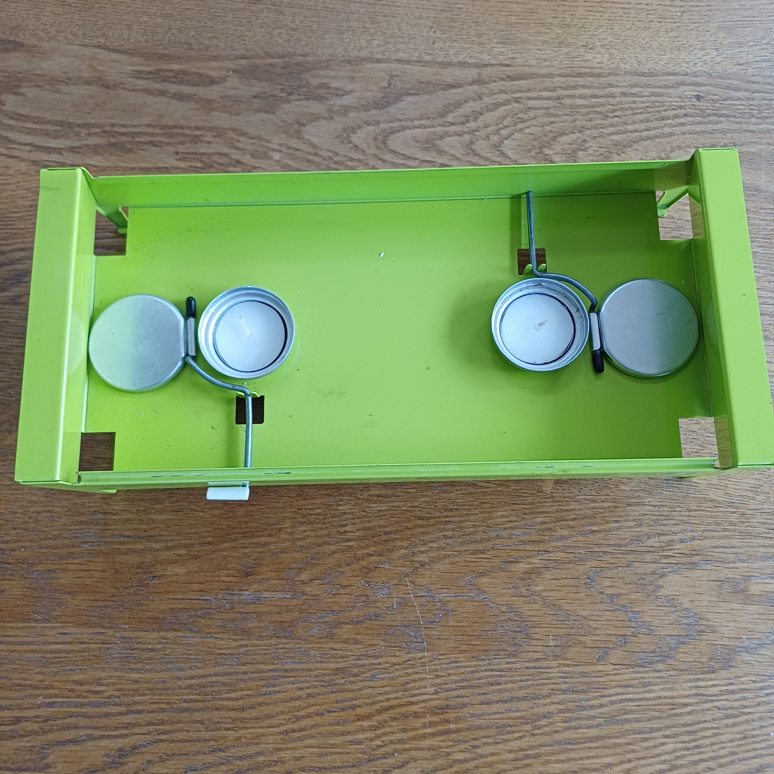 Mooie groene rechaud. Dit warmhoudplaatje heeft twee warmtebronnen en is bedoeld voor twee kleinere potten of pannen of bijvoorbeeld voor een langwerpige ovenschaal.
