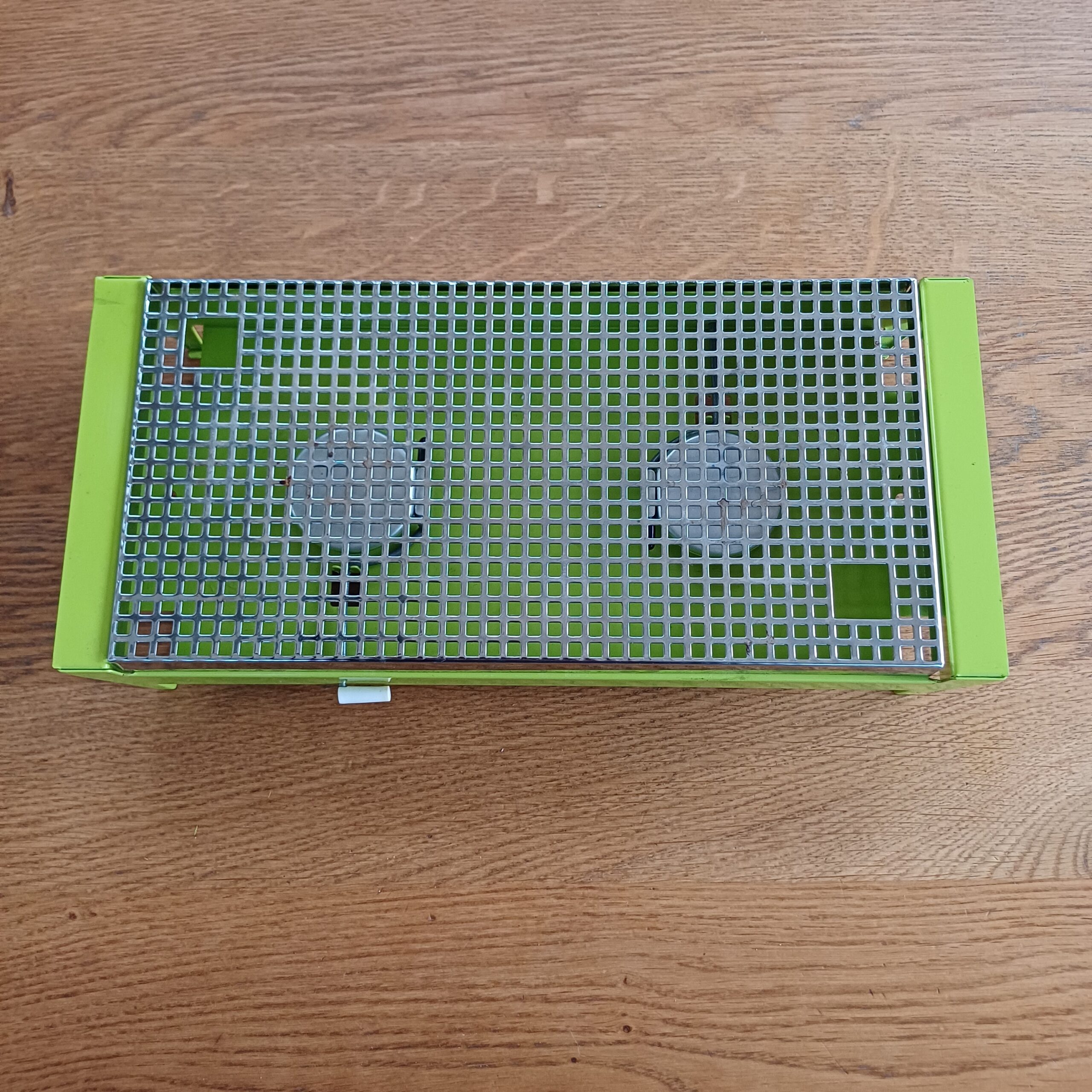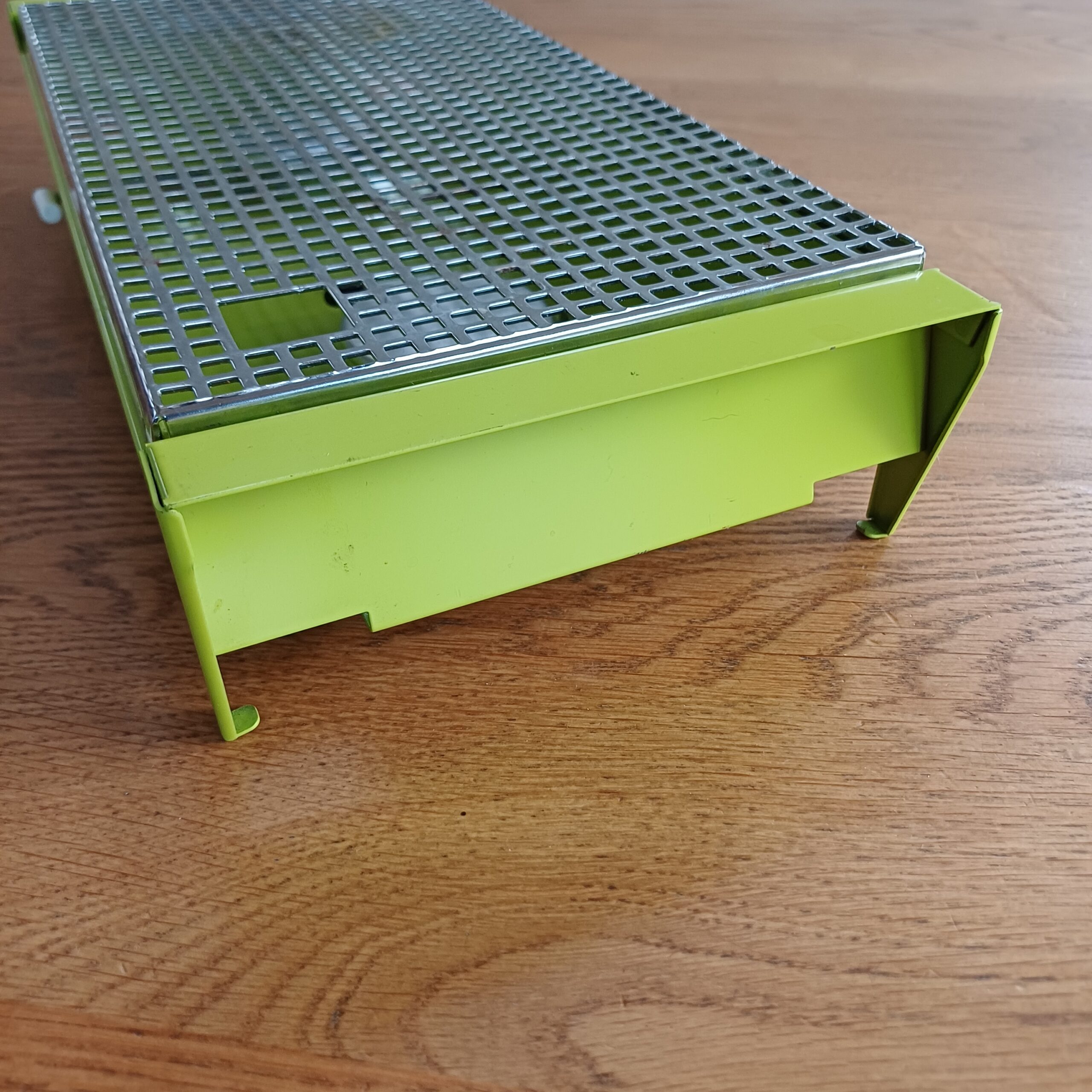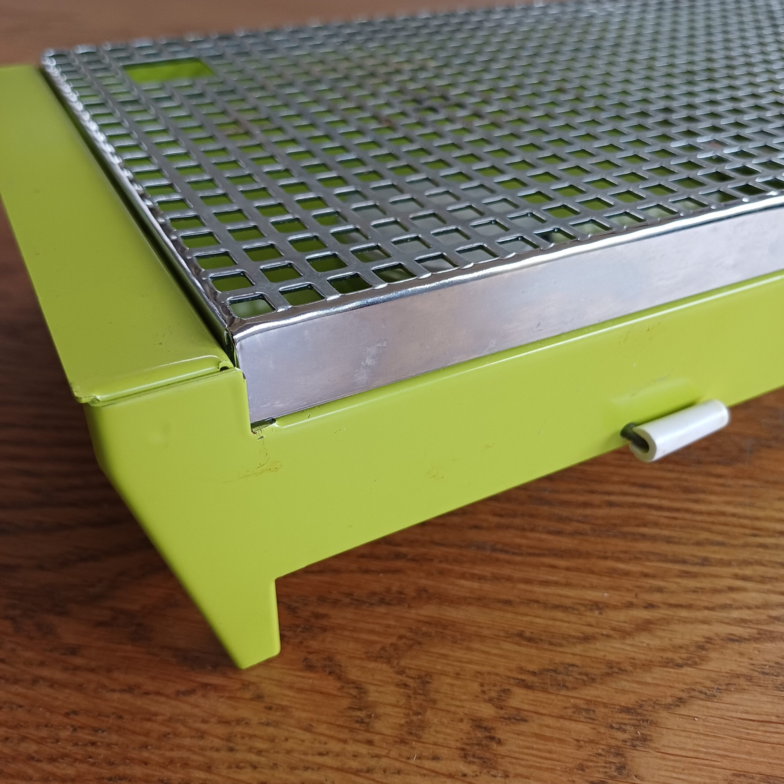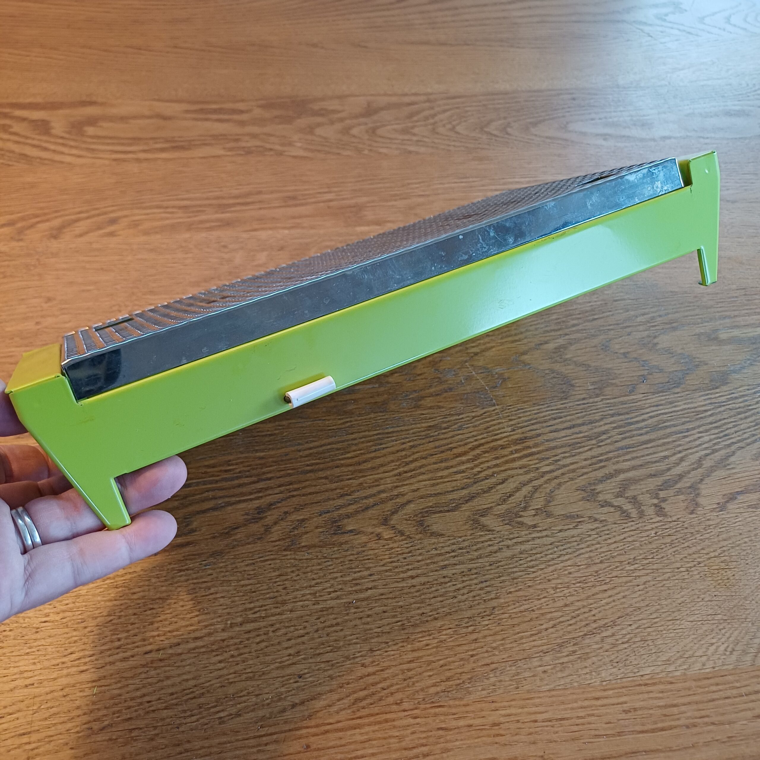 Mooie groene rechaud. Dit warmhoudplaatje heeft twee warmtebronnen en is bedoeld voor twee kleinere potten of pannen of bijvoorbeeld voor een langwerpige ovenschaal.
