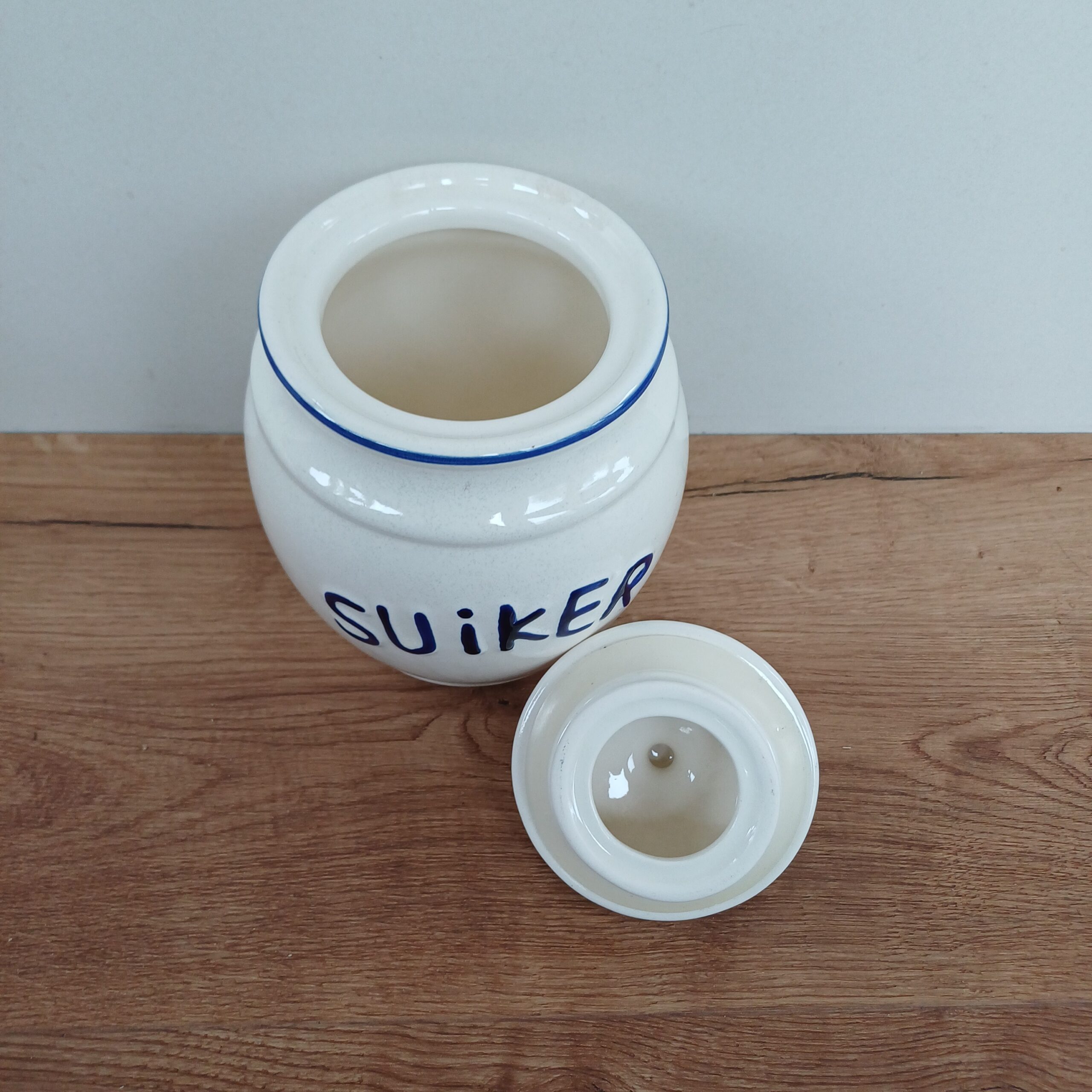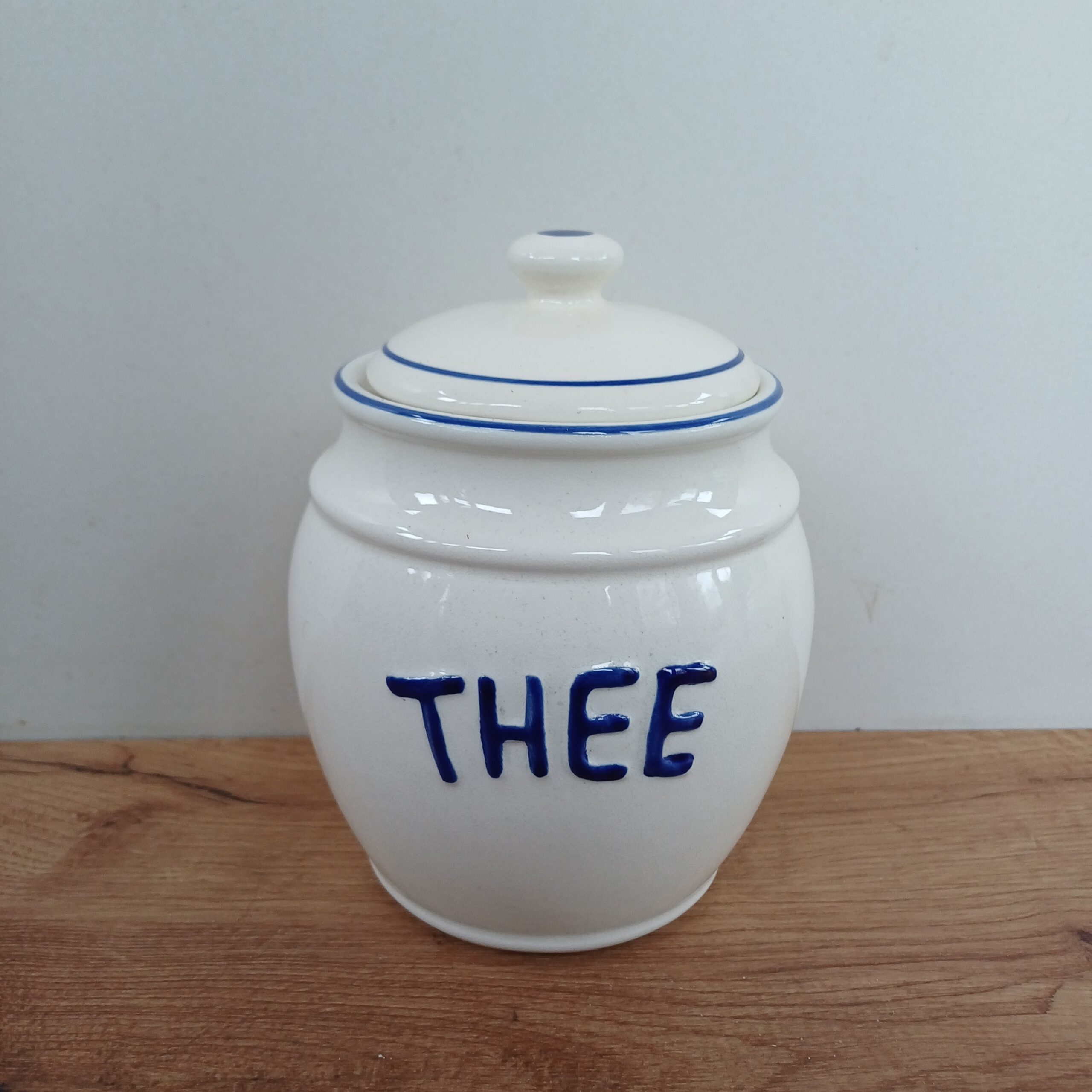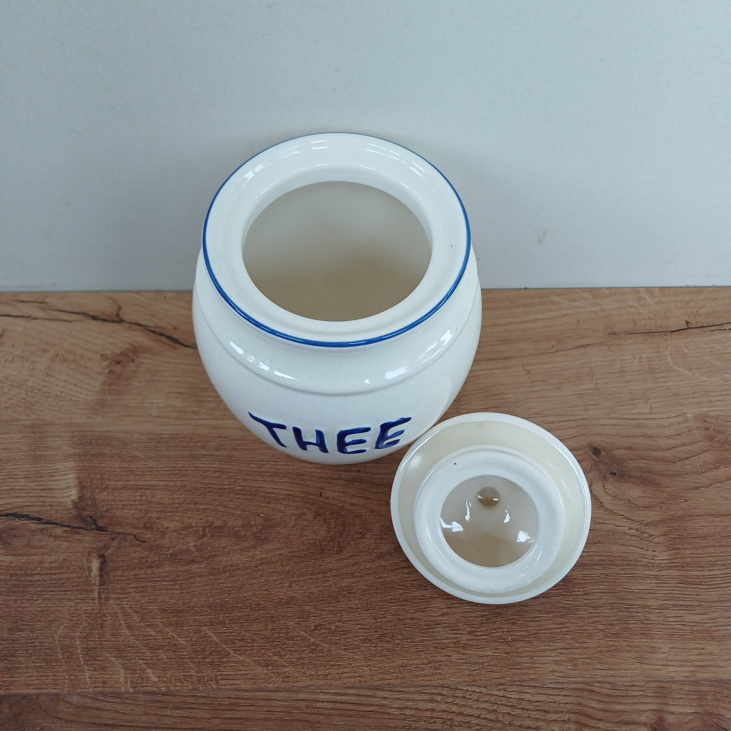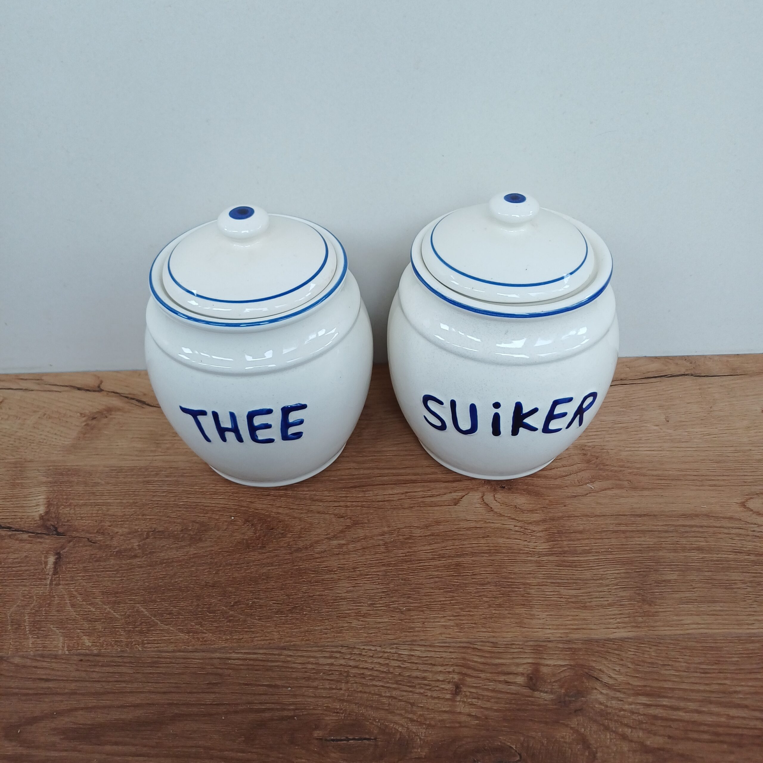 Twee witte, keramische voorraadpotten voor thee en suiker. Met blauwe lijnen en blauwe tekst.