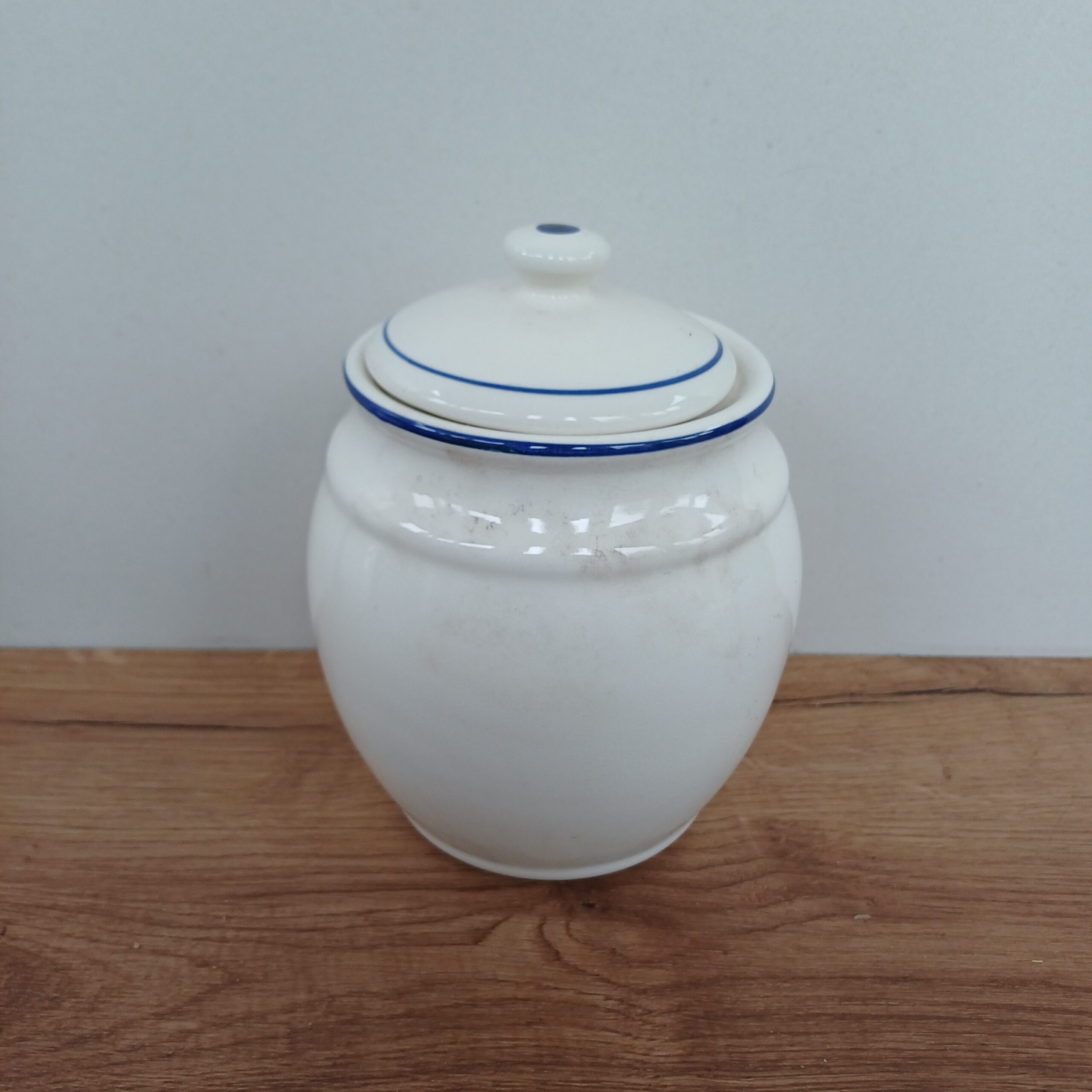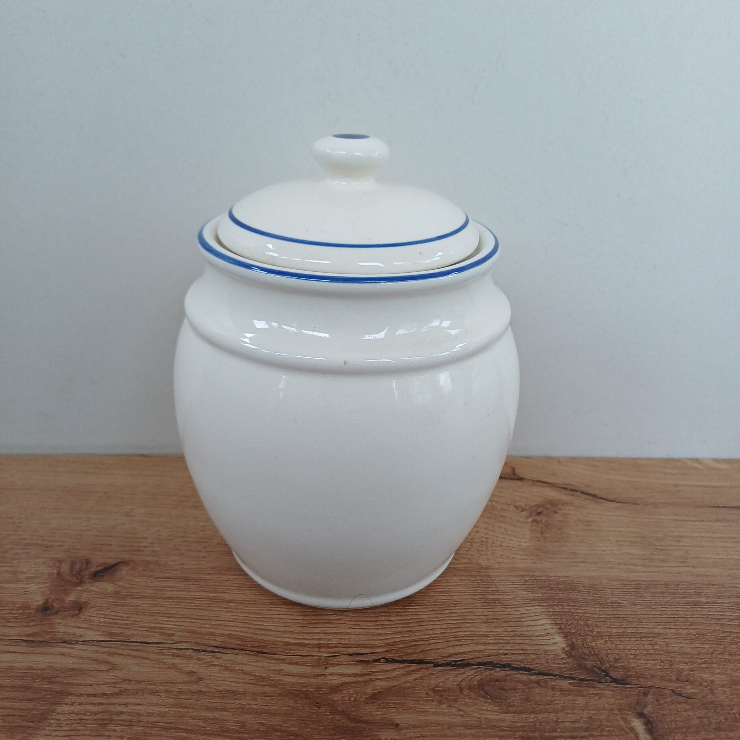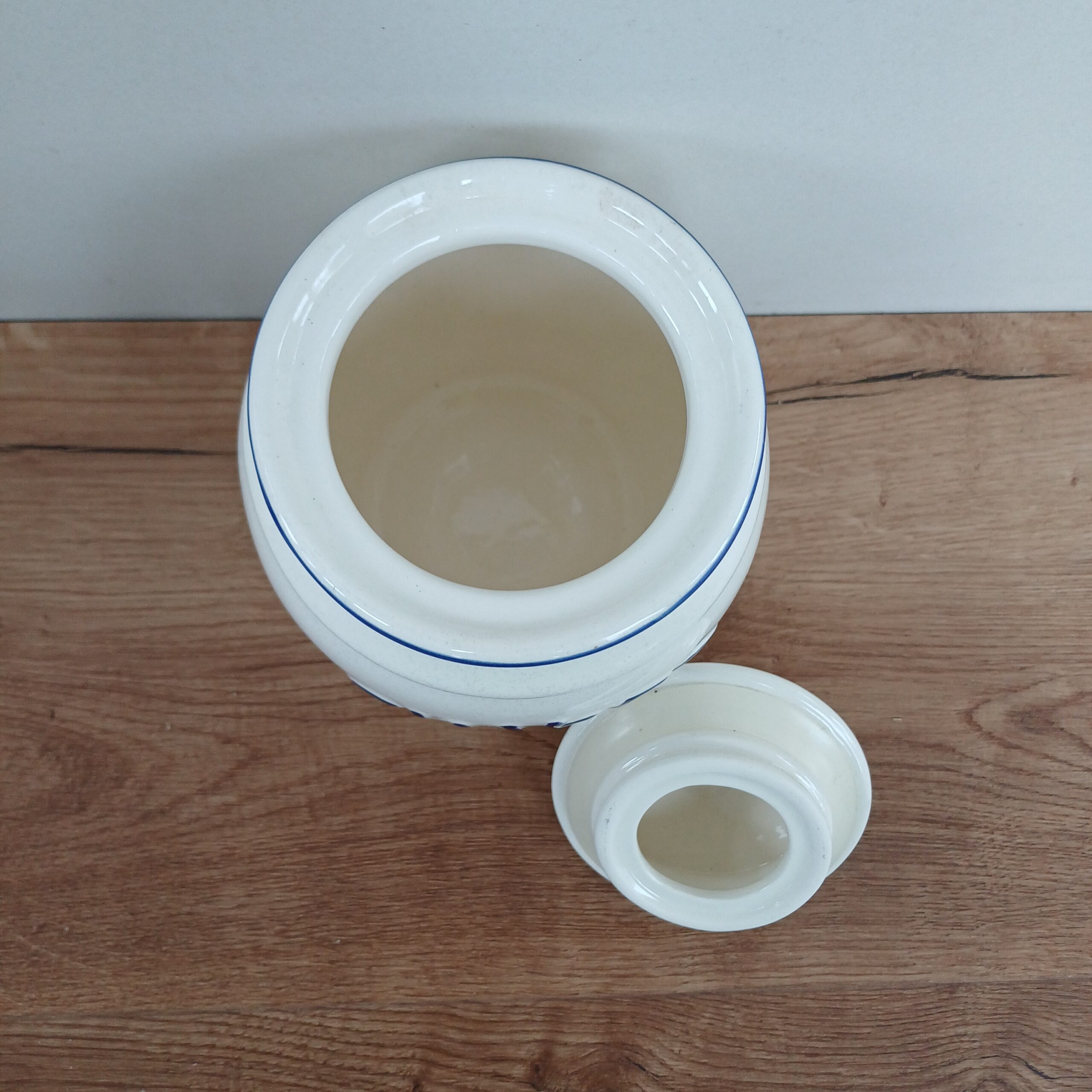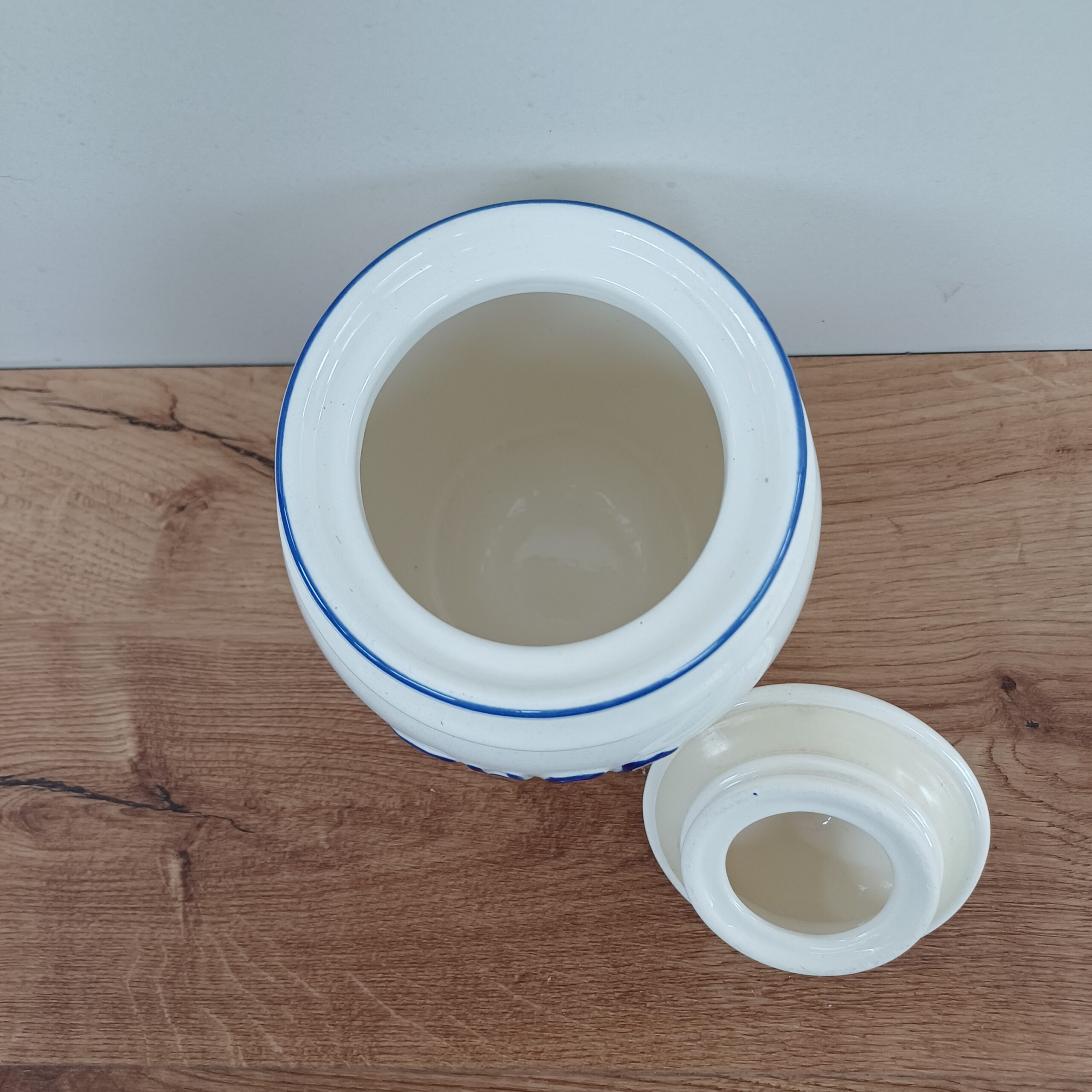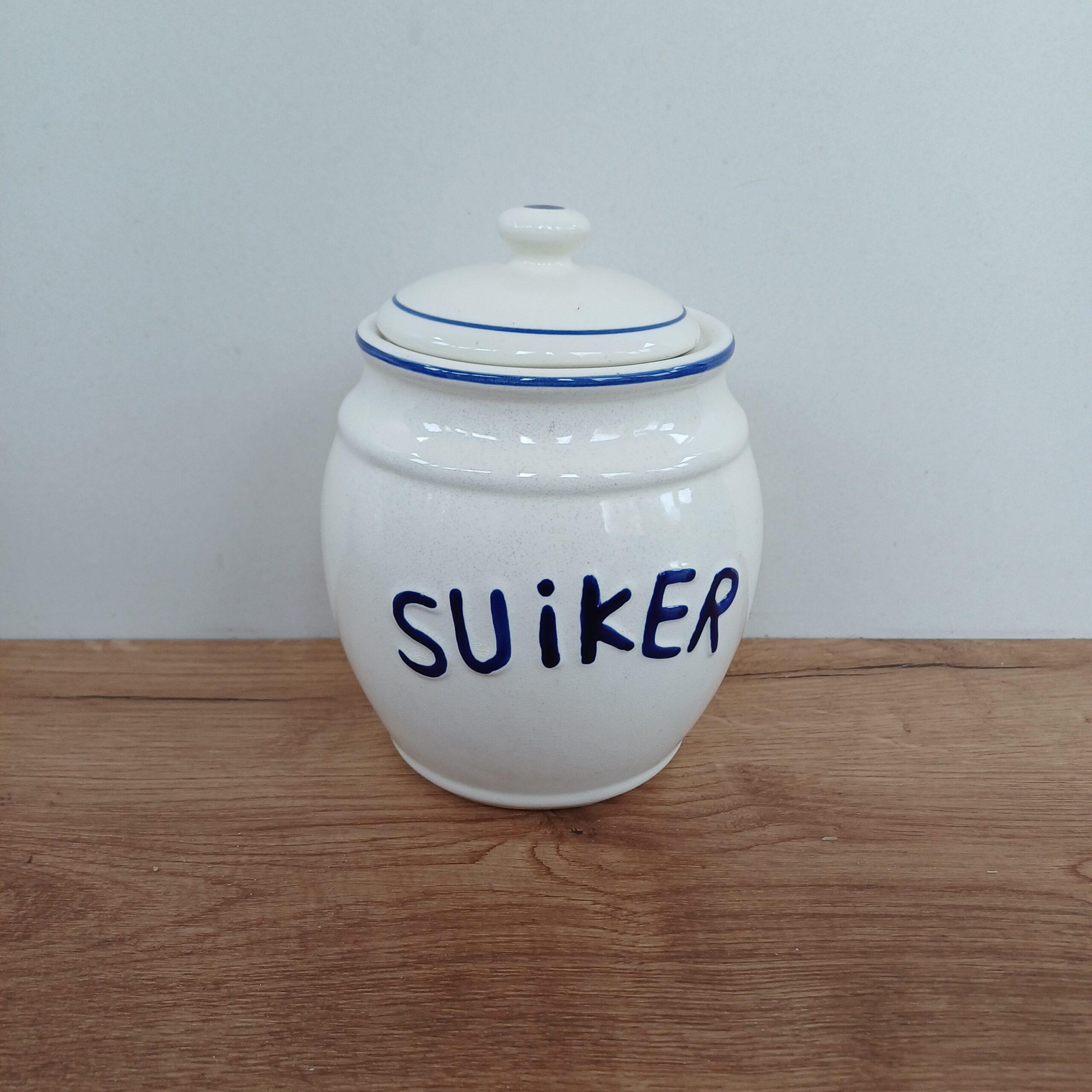 Twee witte, keramische voorraadpotten voor thee en suiker. Met blauwe lijnen en blauwe tekst.