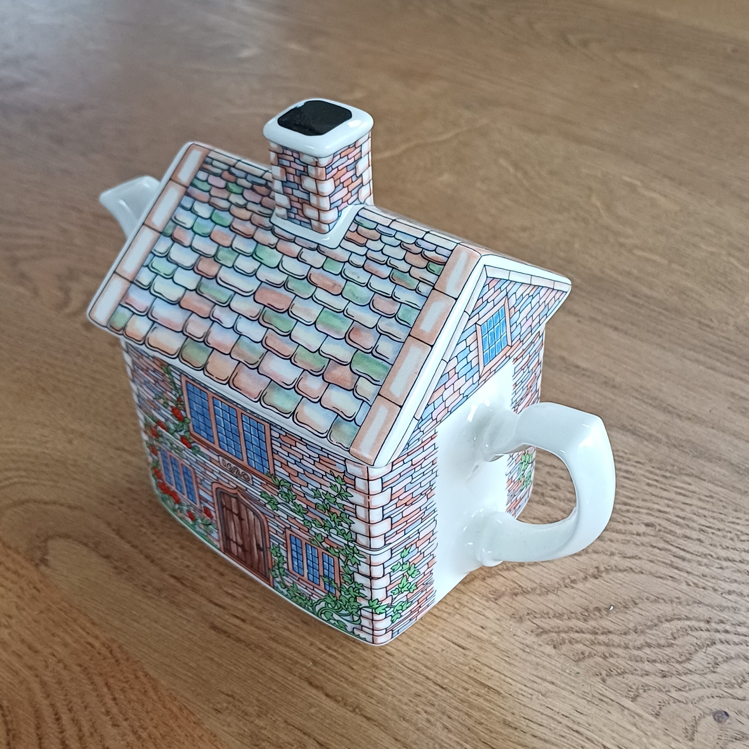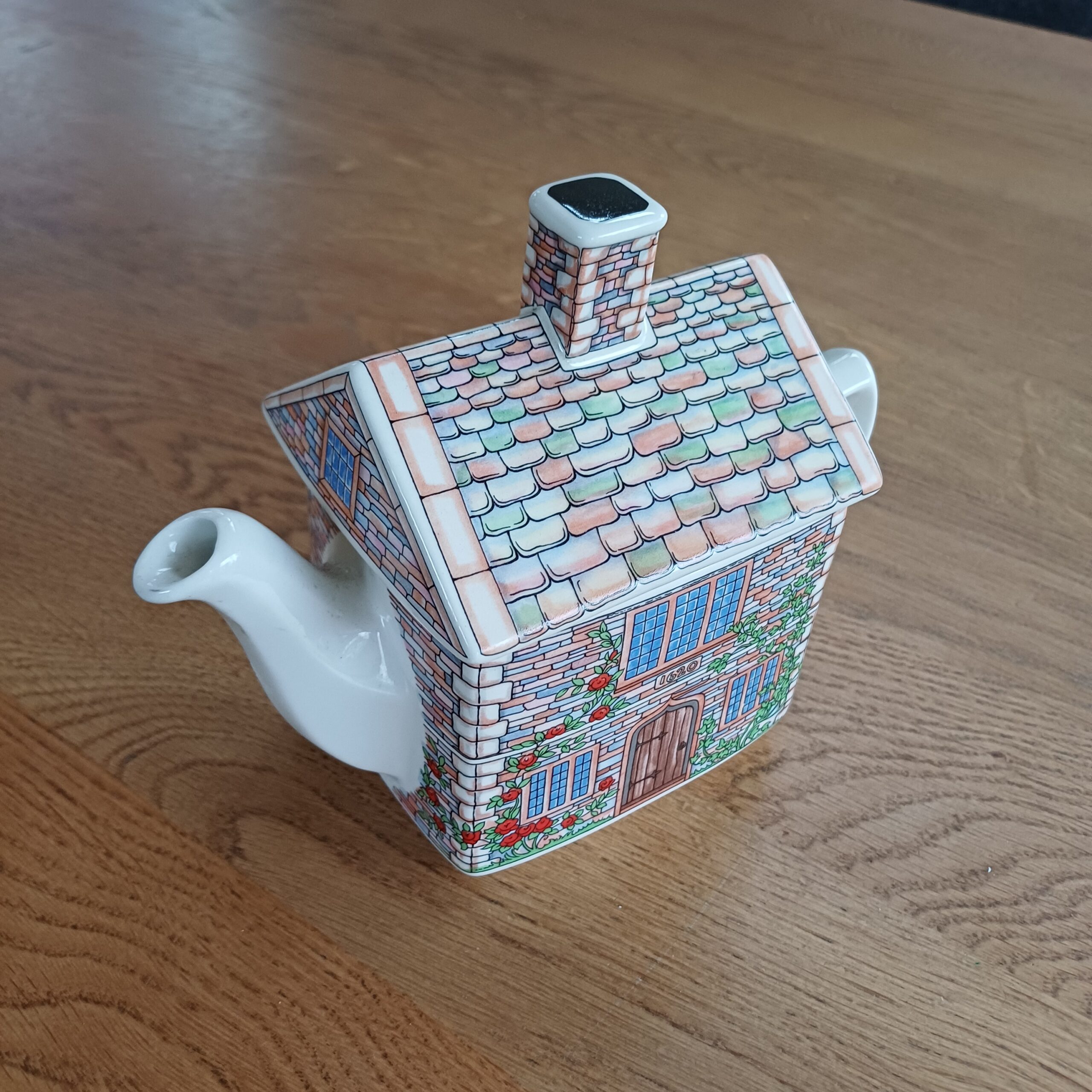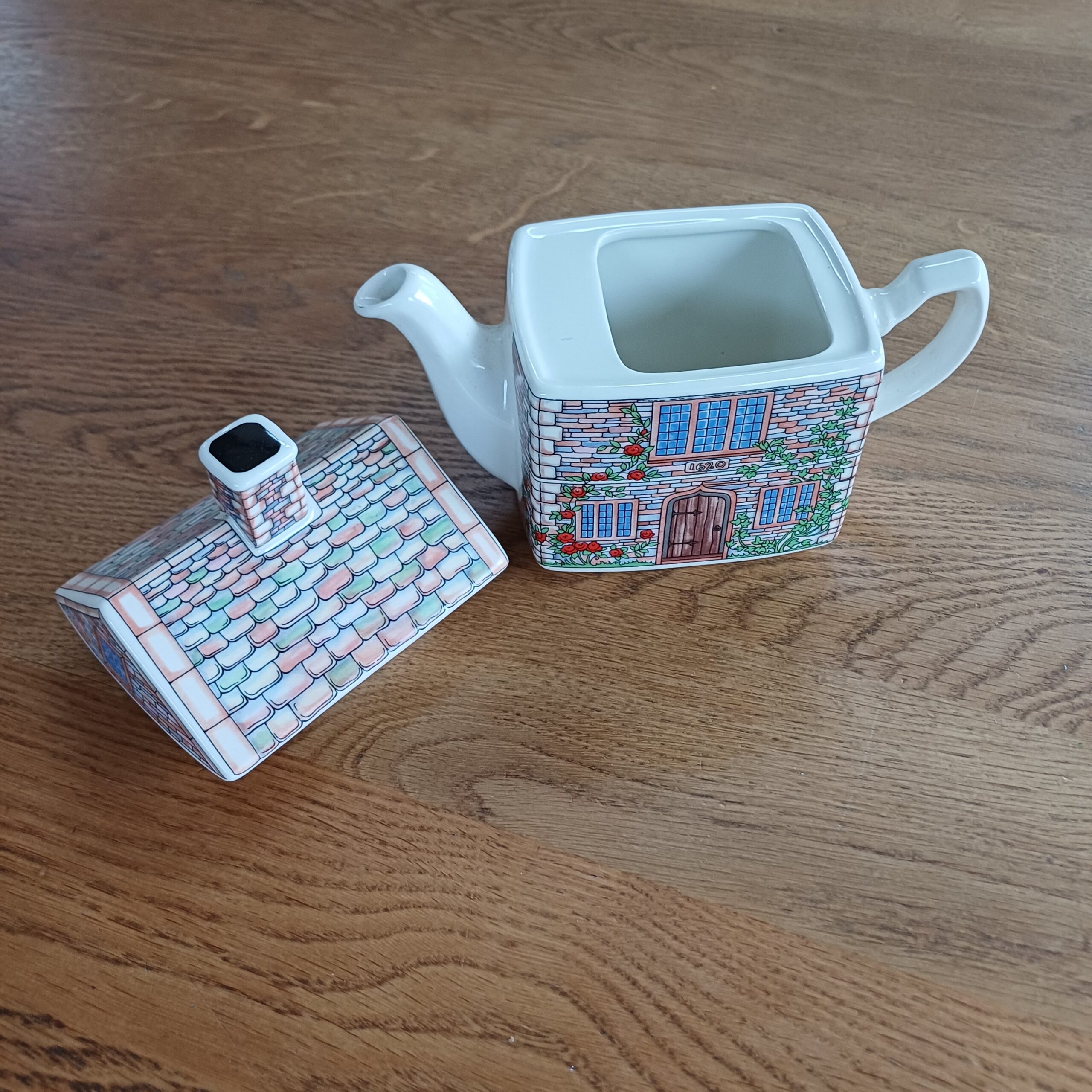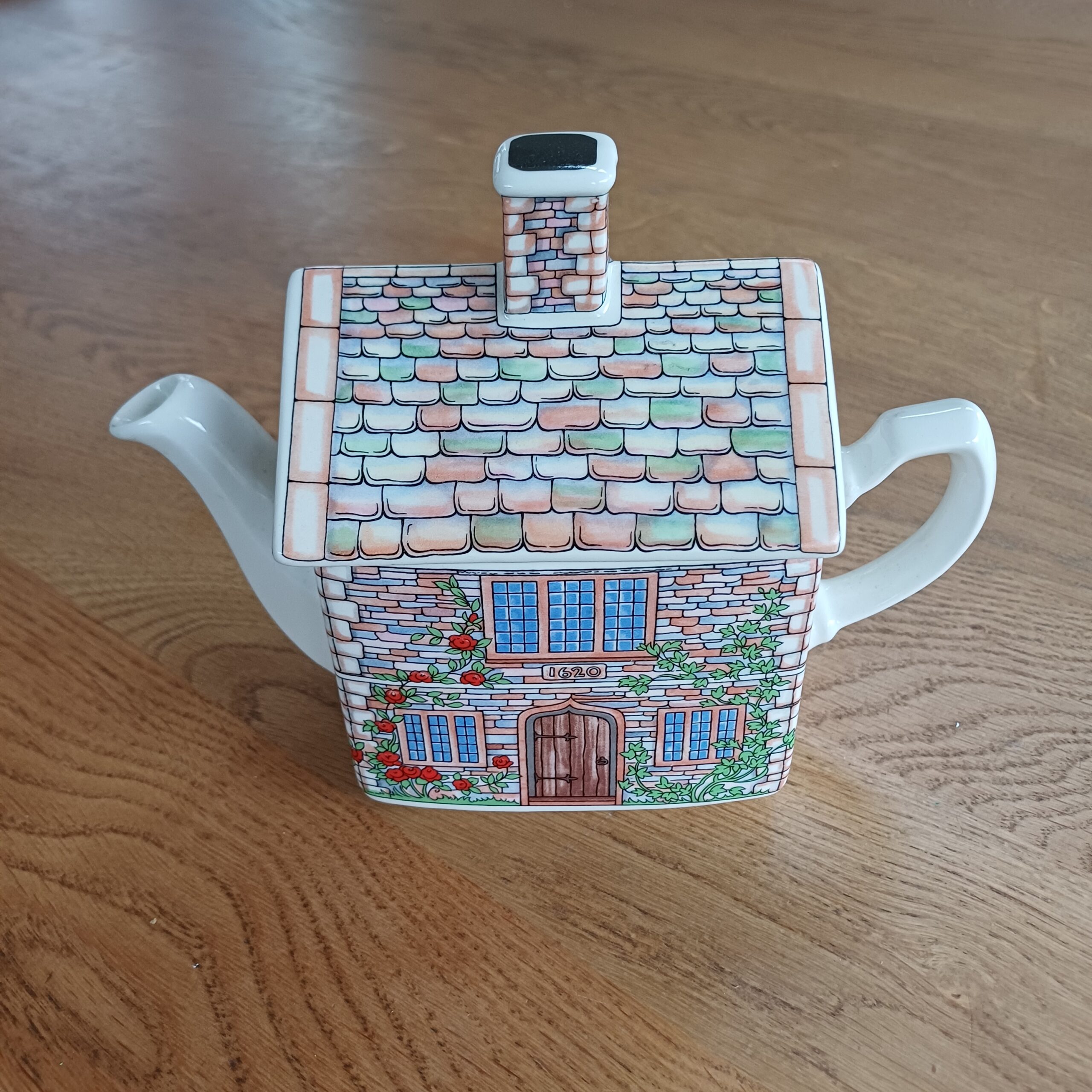 17th Century Cottage theepot van James Sadler, onderdeel van de English Country Houses-serie. De theepot beeldt een charmant Engels huisje uit, versierd met rozen en klimop. Het ontwerp toont het jaartal 1620 boven de deur, verwijzend naar de bouwperiode tijdens de regeerperiode van koning James I (1603-1625). Made in Engeland.