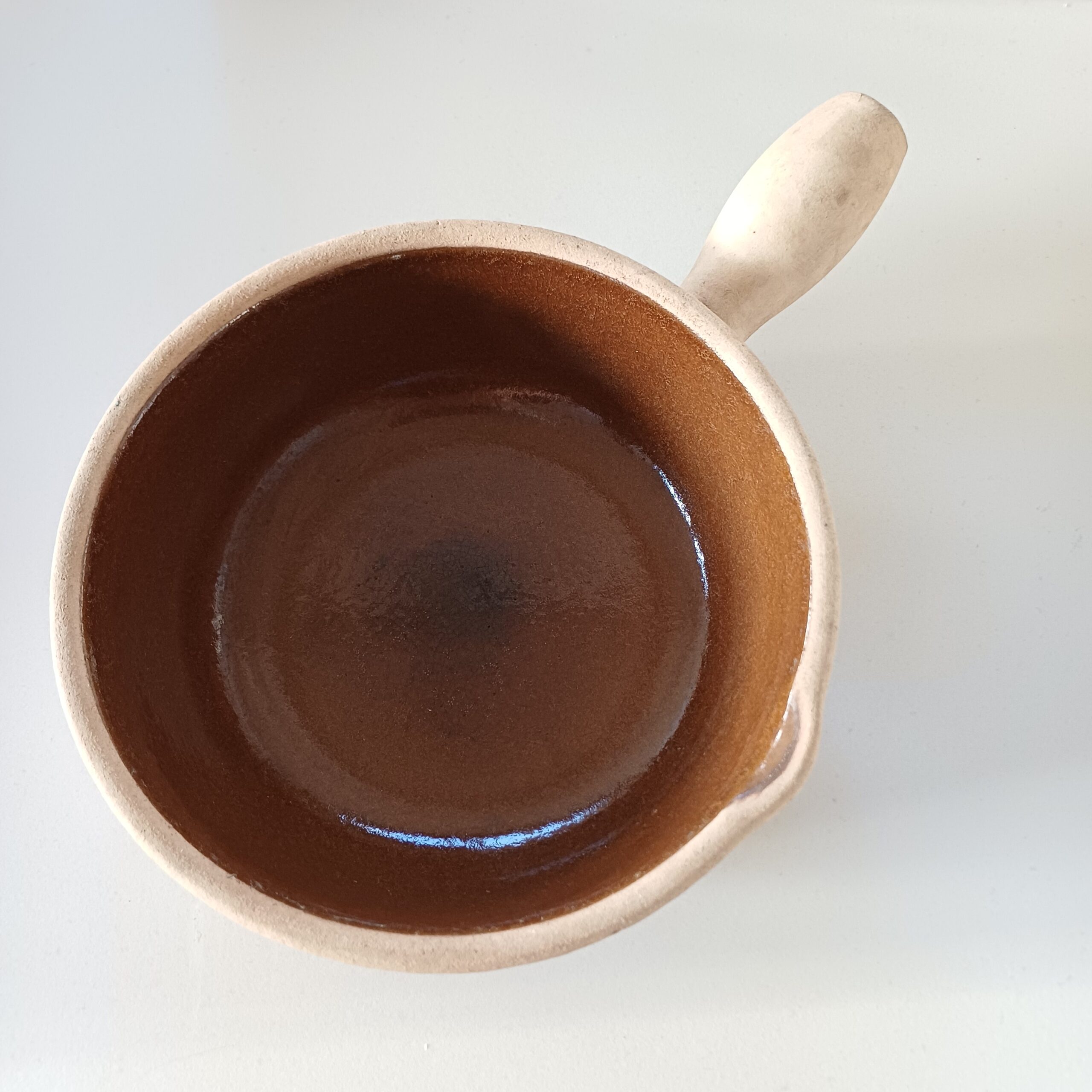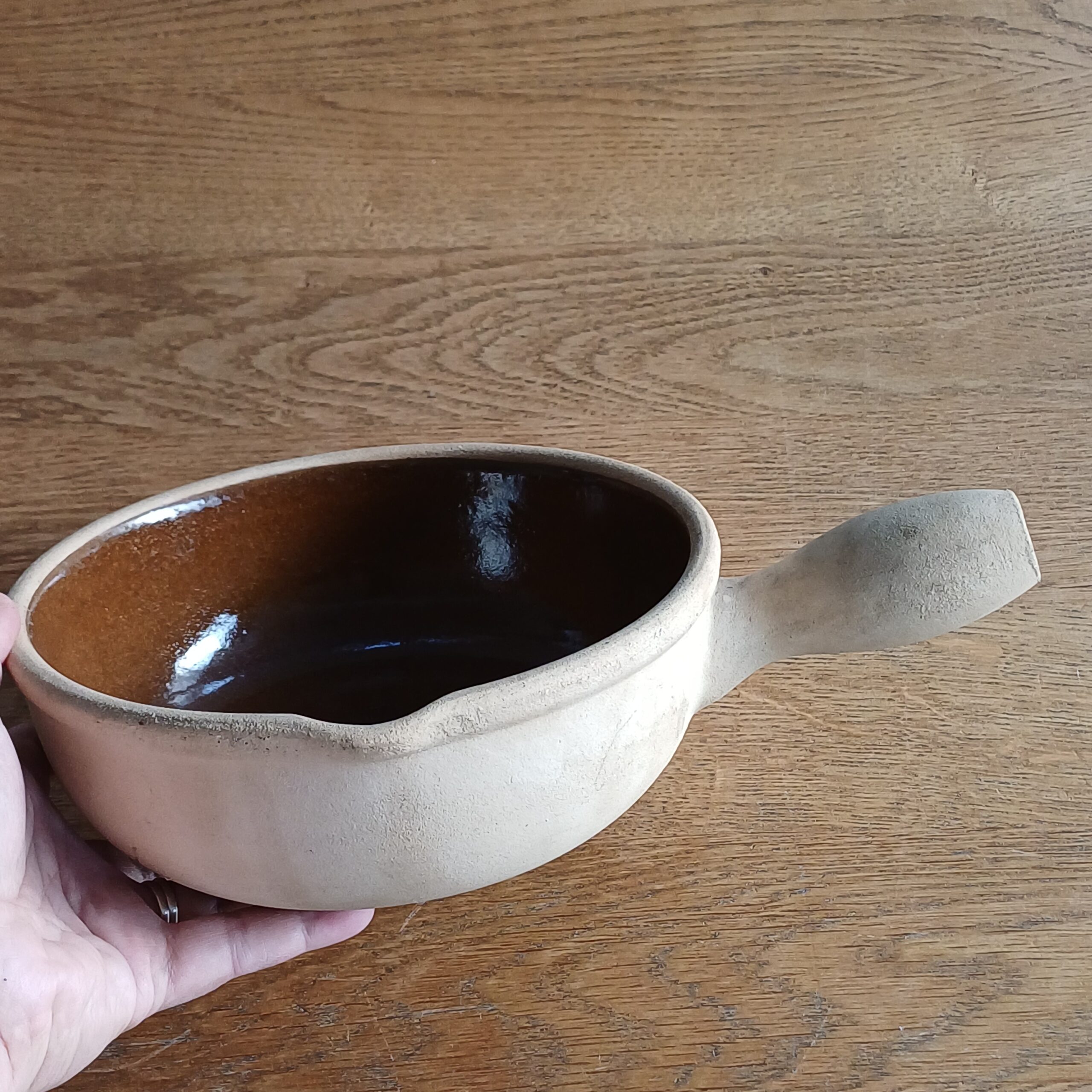 Vintage Zwitserse fonduepan (ook wel caquelon genoemd) van het merk Landert Keramik. Landert was een bekend Zwitsers aardewerkbedrijf dat rond de jaren zestig en zeventig van de vorige eeuw populair was. De pot is gemaakt van zwaar, geglazuurd aardewerk of steengoed, met een karakteristieke bruine binnenzijde en een ongeglazuurde, lichtgekleurde buitenzijde en steel. Dit type fonduepan werd vaak gebruikt voor kaasfondue. De steel is hol om koel te blijven tijdens gebruik. De pot is gemerkt aan de zijkant. Met gebruiksaanwijzing.