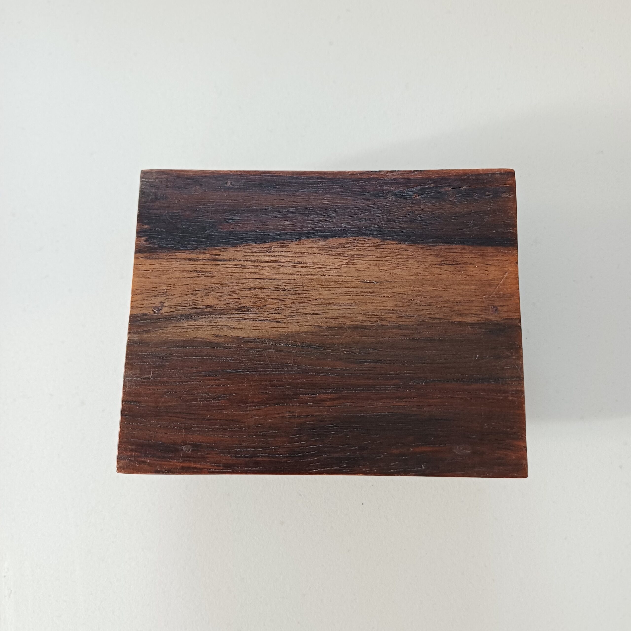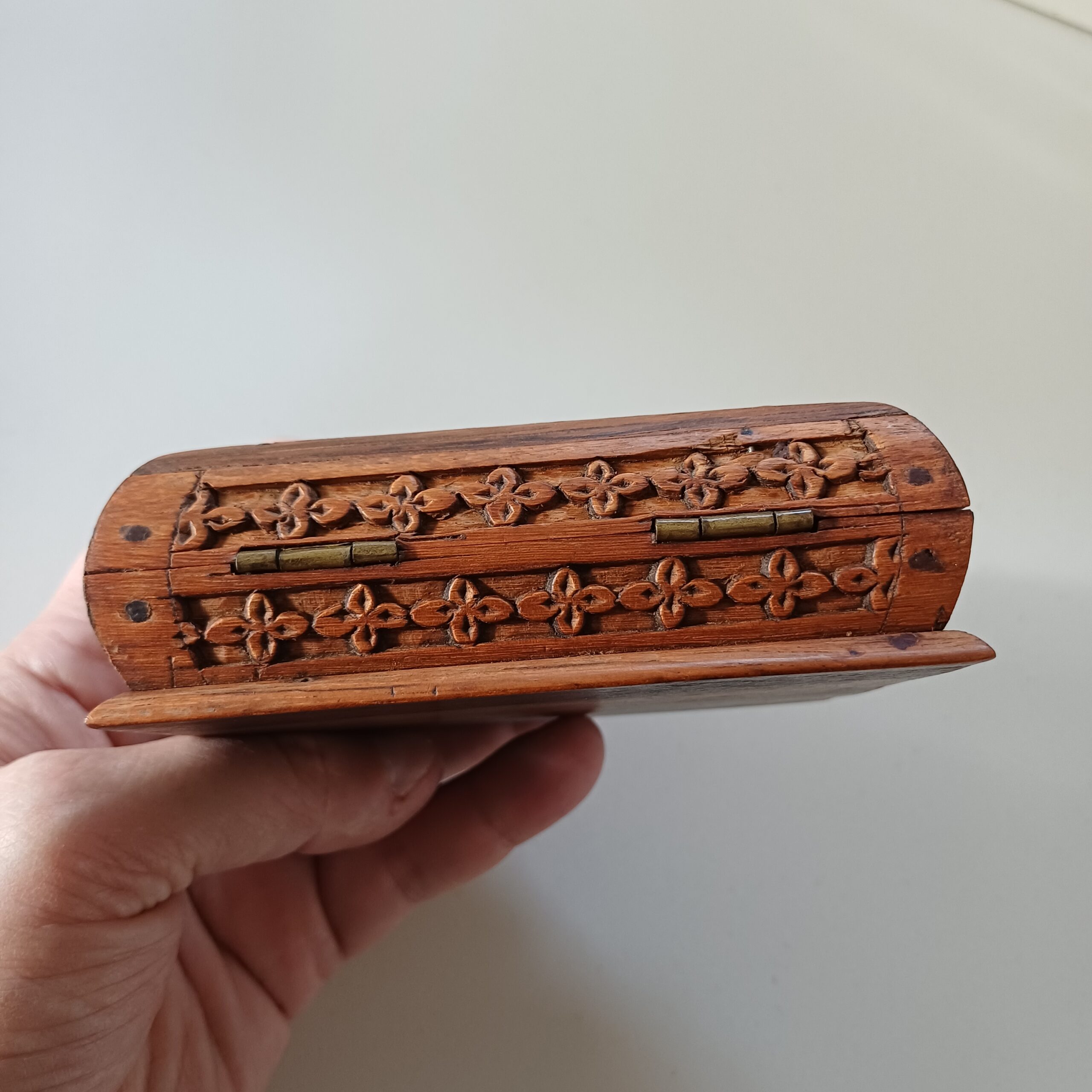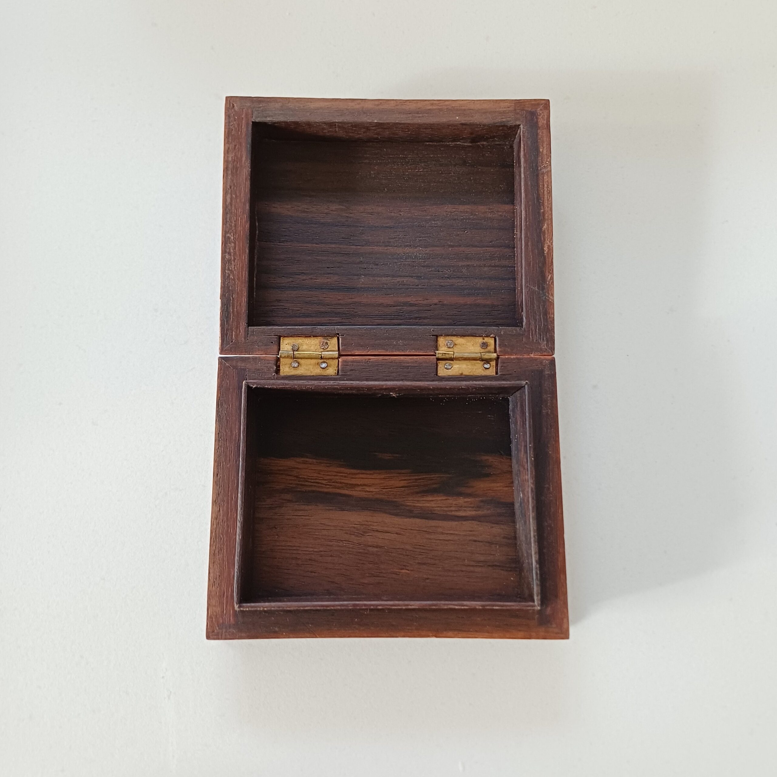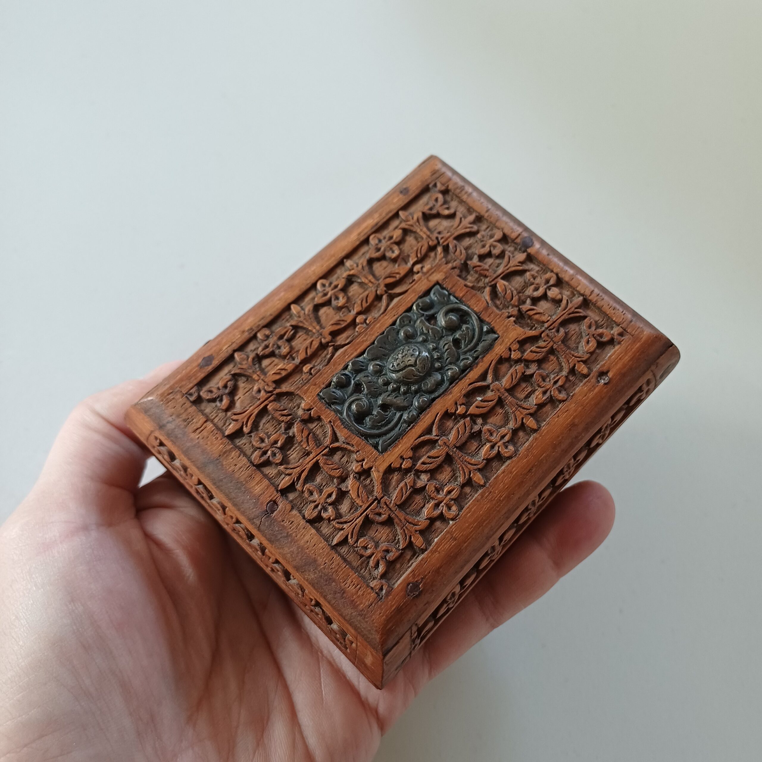 Decoratief houten doosje, ook wel een snuisterijendoosje of juwelendoosje genoemd. Het doosje is handgemaakt en heeft houtsnijwerk met bloemmotieven. In het midden van het deksel bevindt zich een metalen plaat met een reliëf van een bloem.