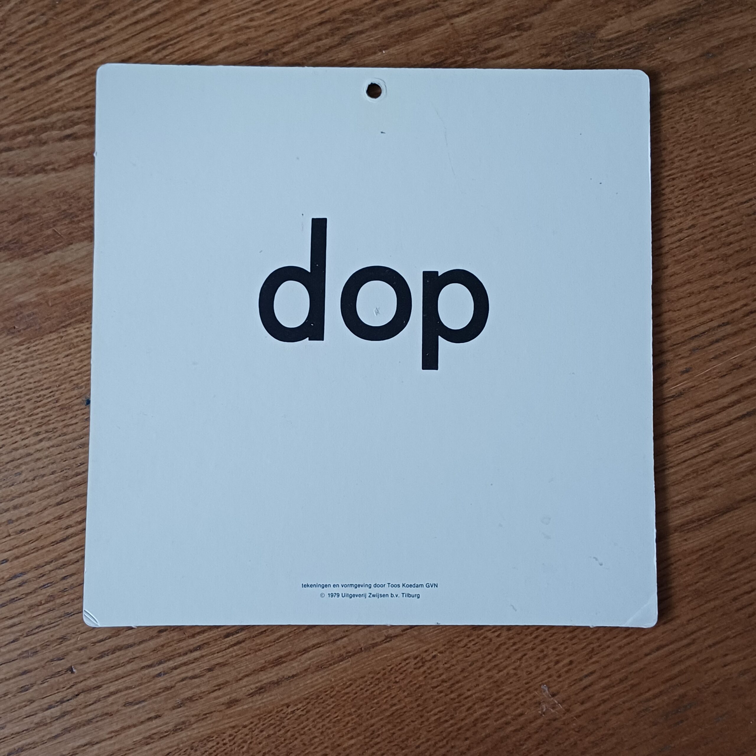 Mooie vintage wandplaat van de Veilig Leren Lezen methode van Zwijsen uit 1979. Deze wandplaat beeldt het woord dop uit. Zo leuk als decoratie in de kinderkamer! De schoolkaart is gemaakt van stevig karton en in goede vintage staat. Tekeningen en vormgeving door Toos Koedam.