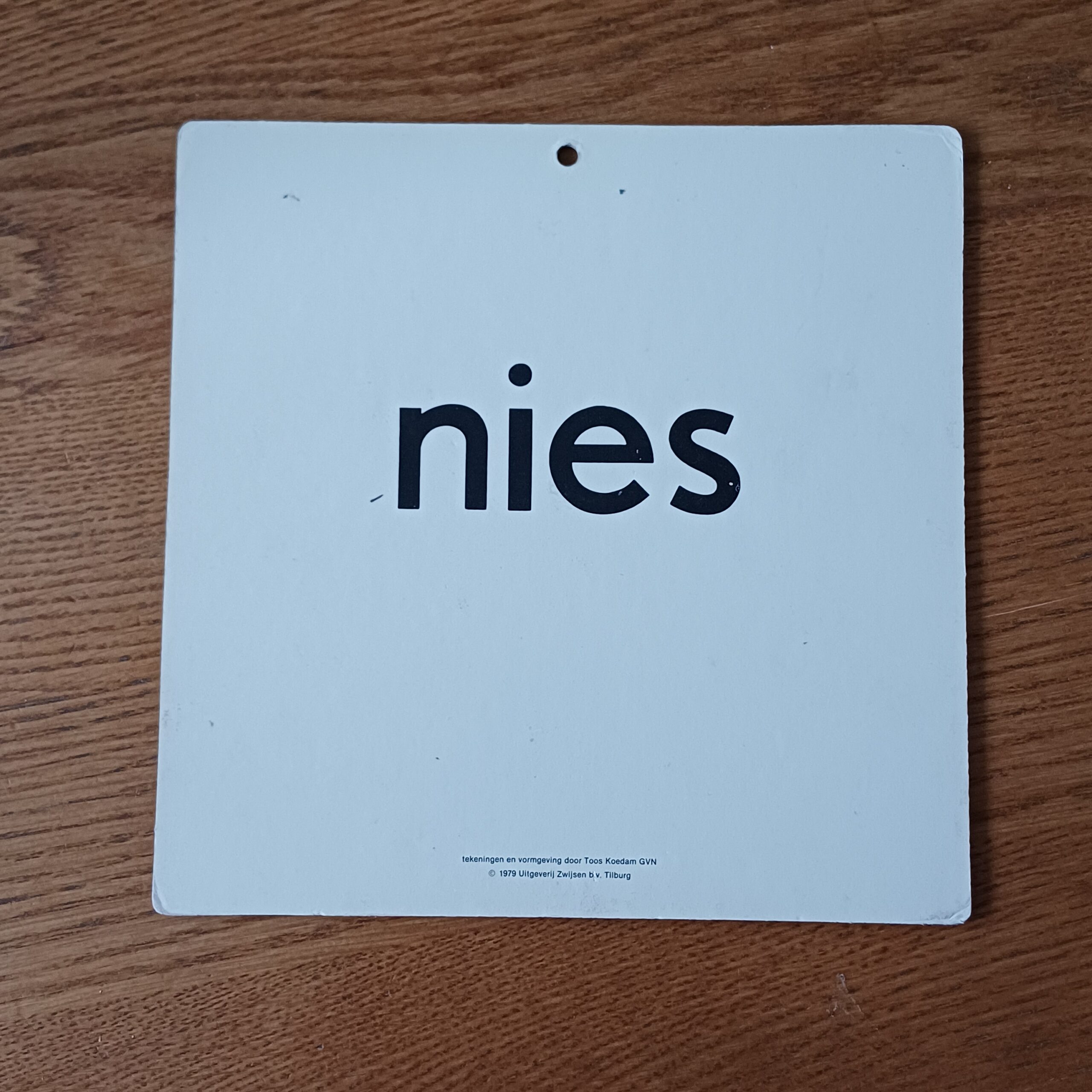 Mooie vintage wandplaat van de Veilig Leren Lezen methode van Zwijsen uit 1979. Deze wandplaat beeldt het woord nies uit. Zo leuk als decoratie in de kinderkamer of op een andere plek aan de wand! De schoolkaart is gemaakt van stevig karton en in goede vintage staat. Tekeningen en vormgeving door Toos Koedam.