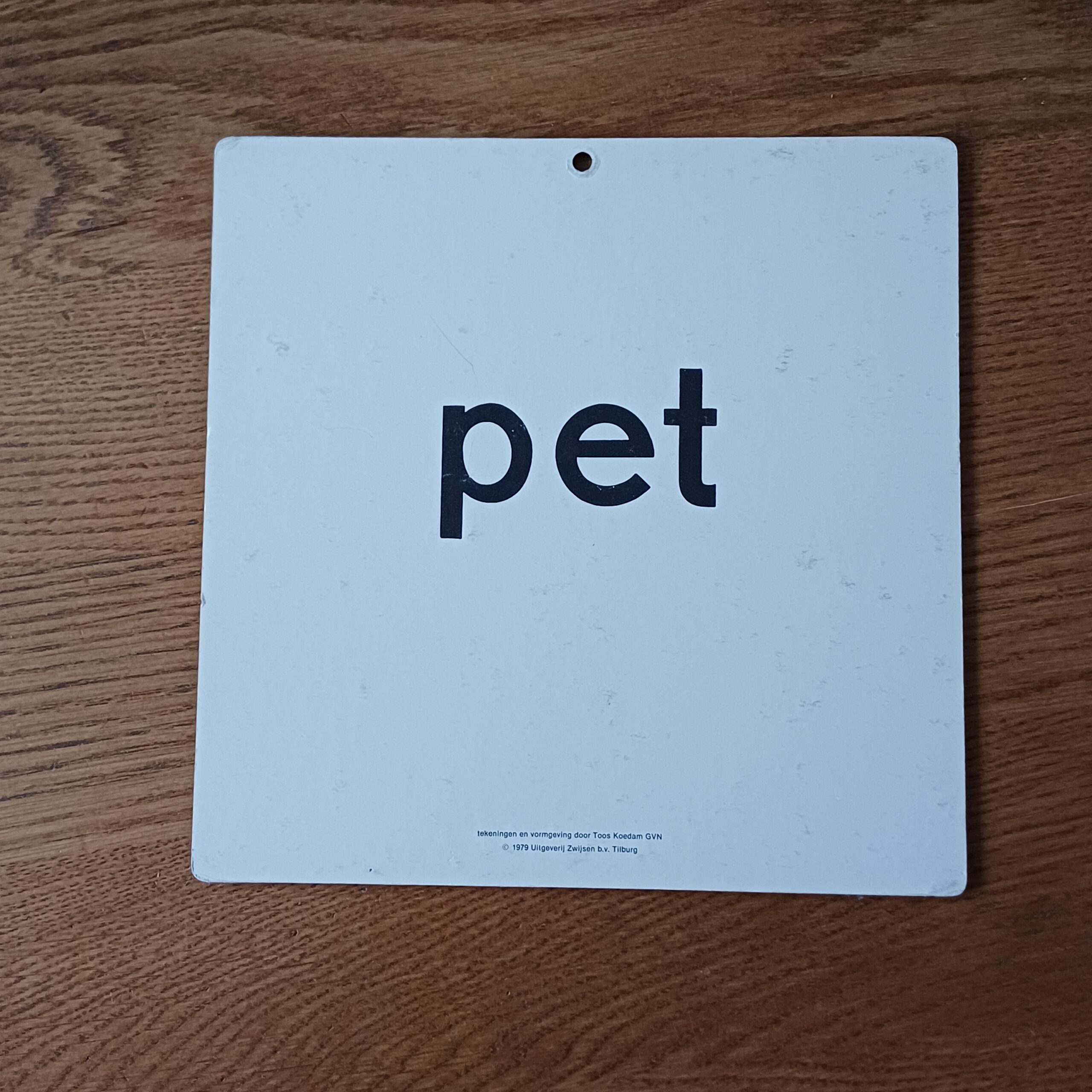 Prachtige vintage wandplaat van de Veilig Leren Lezen methode van Zwijsen uit 1979. Deze wandplaat beeldt het woord pet uit. Zo leuk als decoratie in de kinderkamer! De schoolkaart is gemaakt van stevig karton en in goede vintage staat. Tekeningen en vormgeving door Toos Koedam.