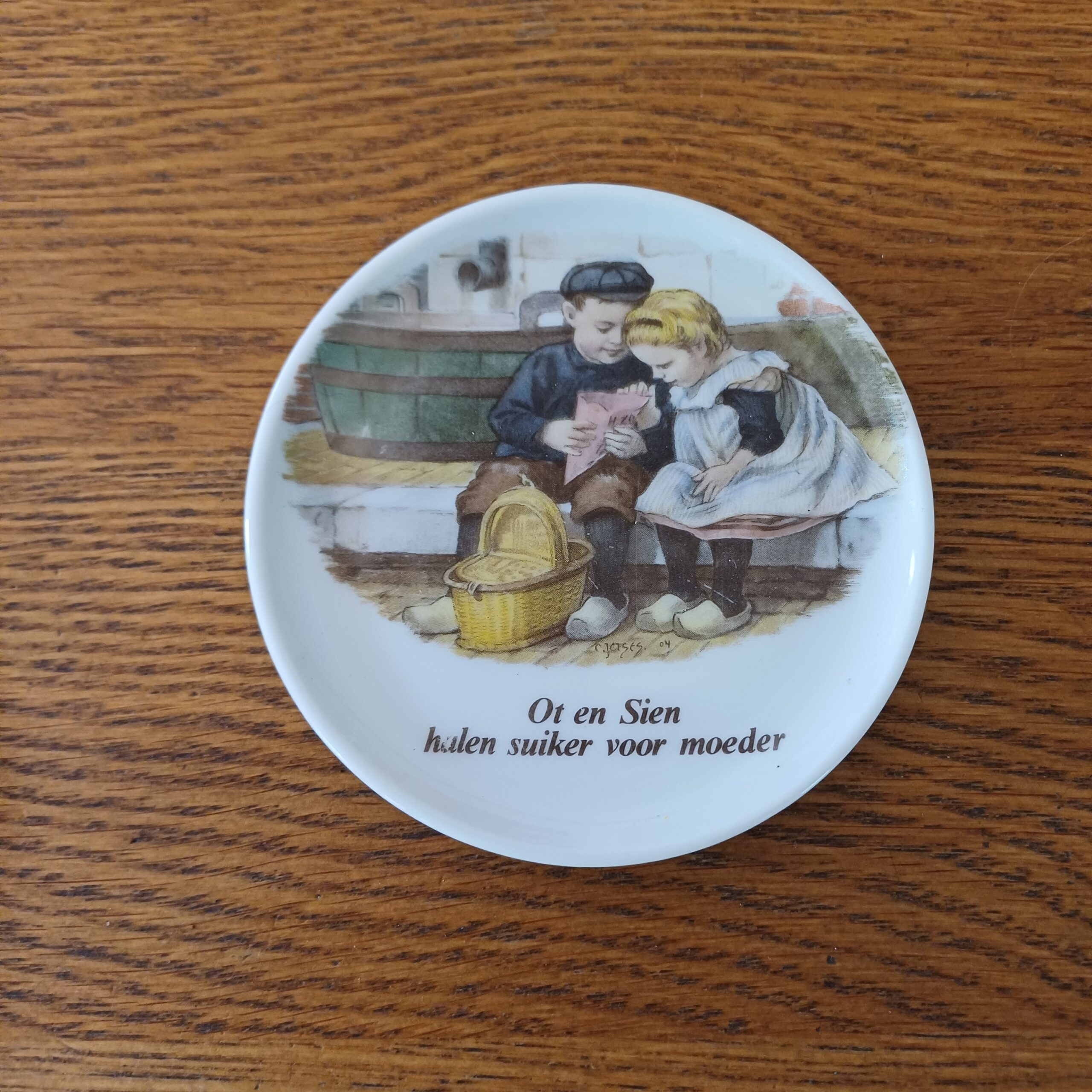 Set van 3 wandbordjes van Ot en Sien. Trui leert Ot en Sien hinkelen, Ot en Sien halen suiker voor moeder en Wat doet poes? Onderop staat: 1984 Ter Steege.