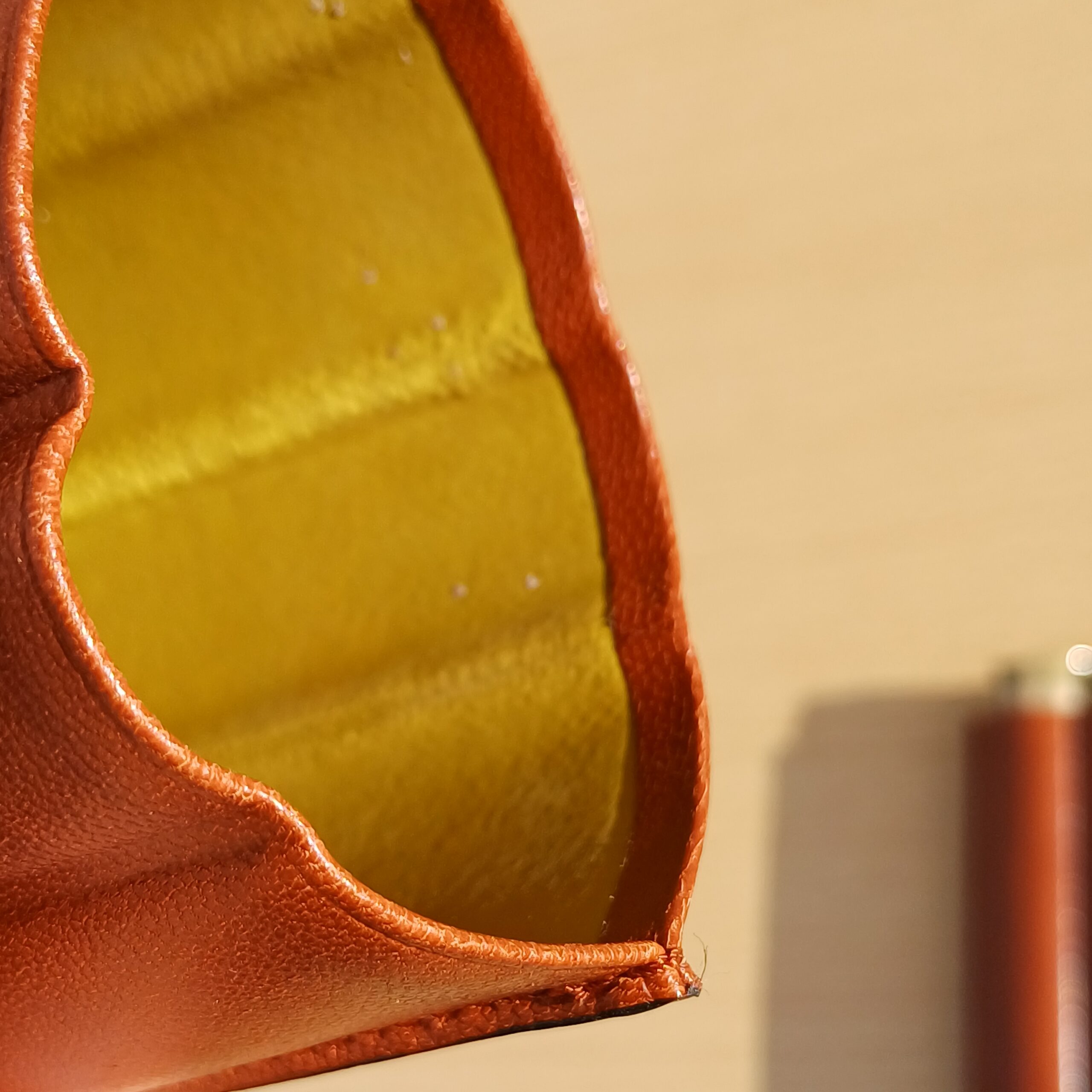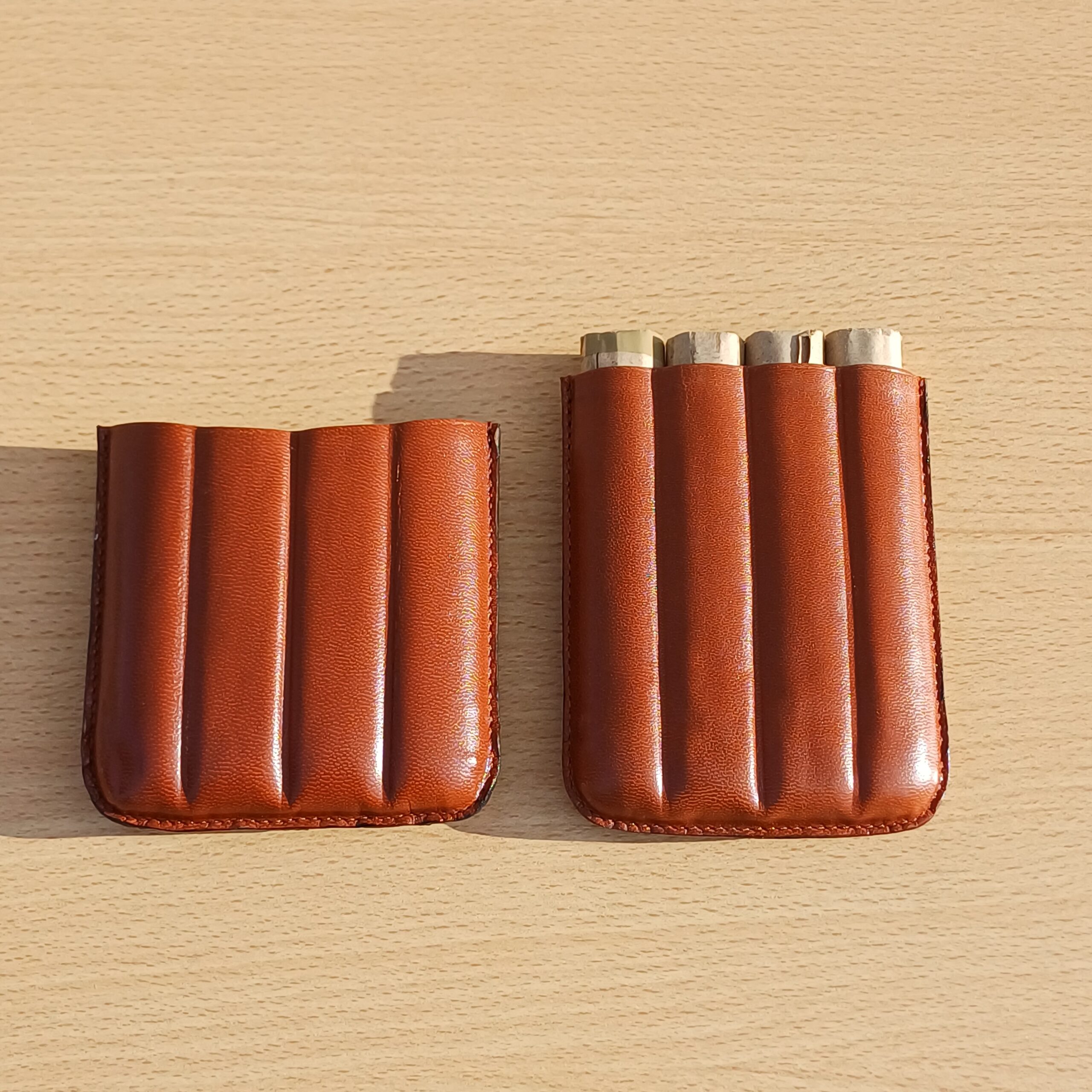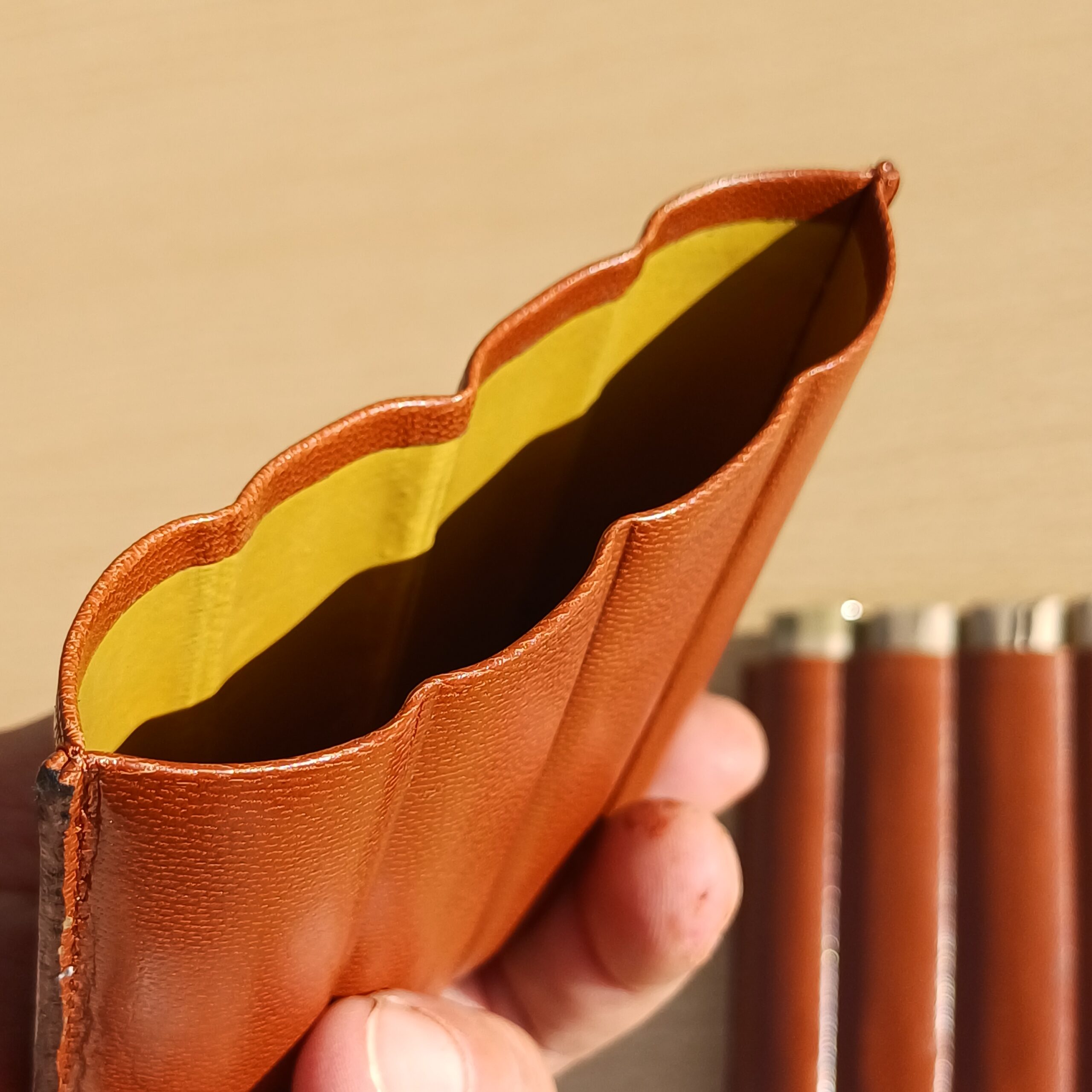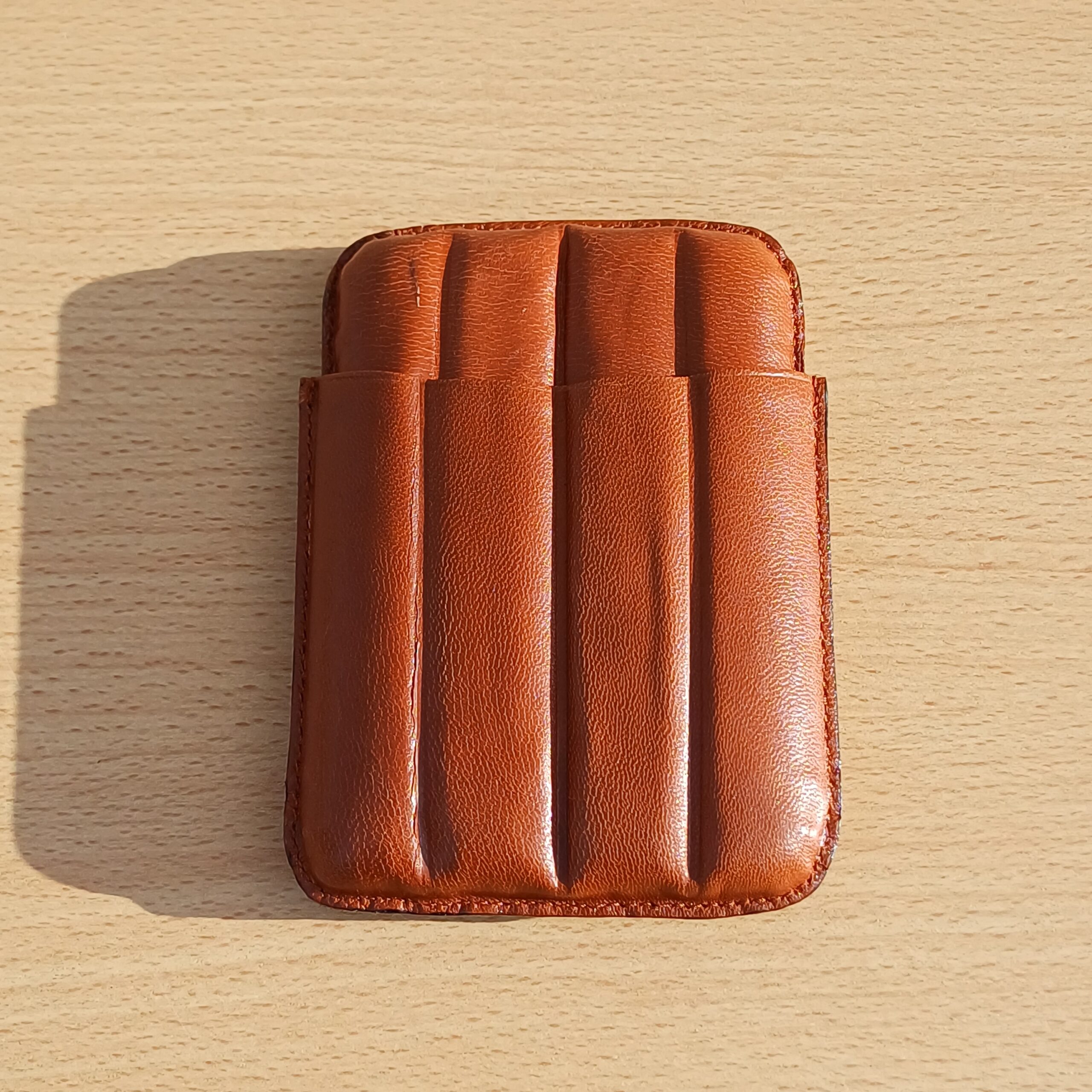 Prachtige bruin leren sigarenkoker voor 4 sigaren. De  warme gele kleur aan de binnenkant past perfect bij de warme bruine kleur van de buitenkant. Zo goed als nieuw.