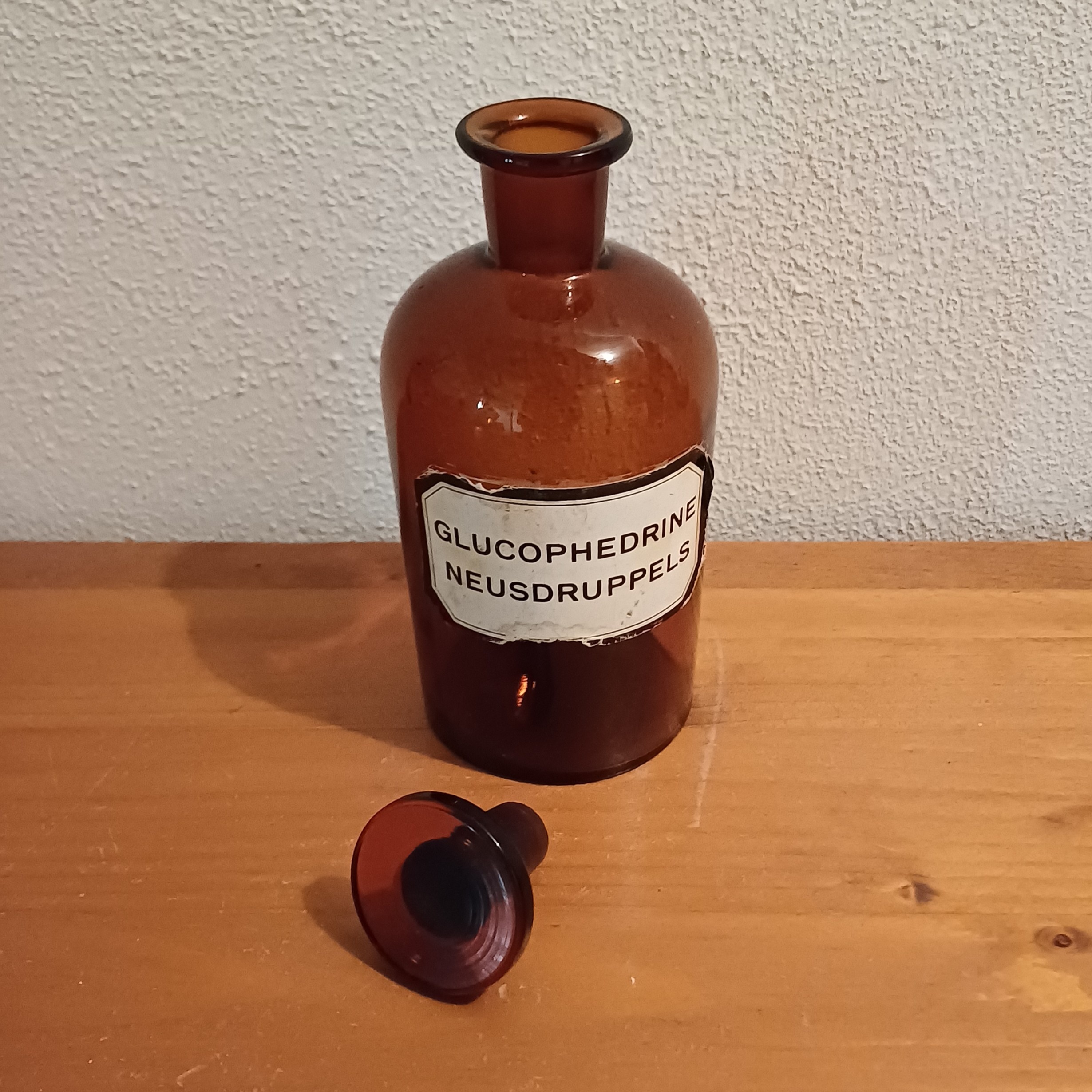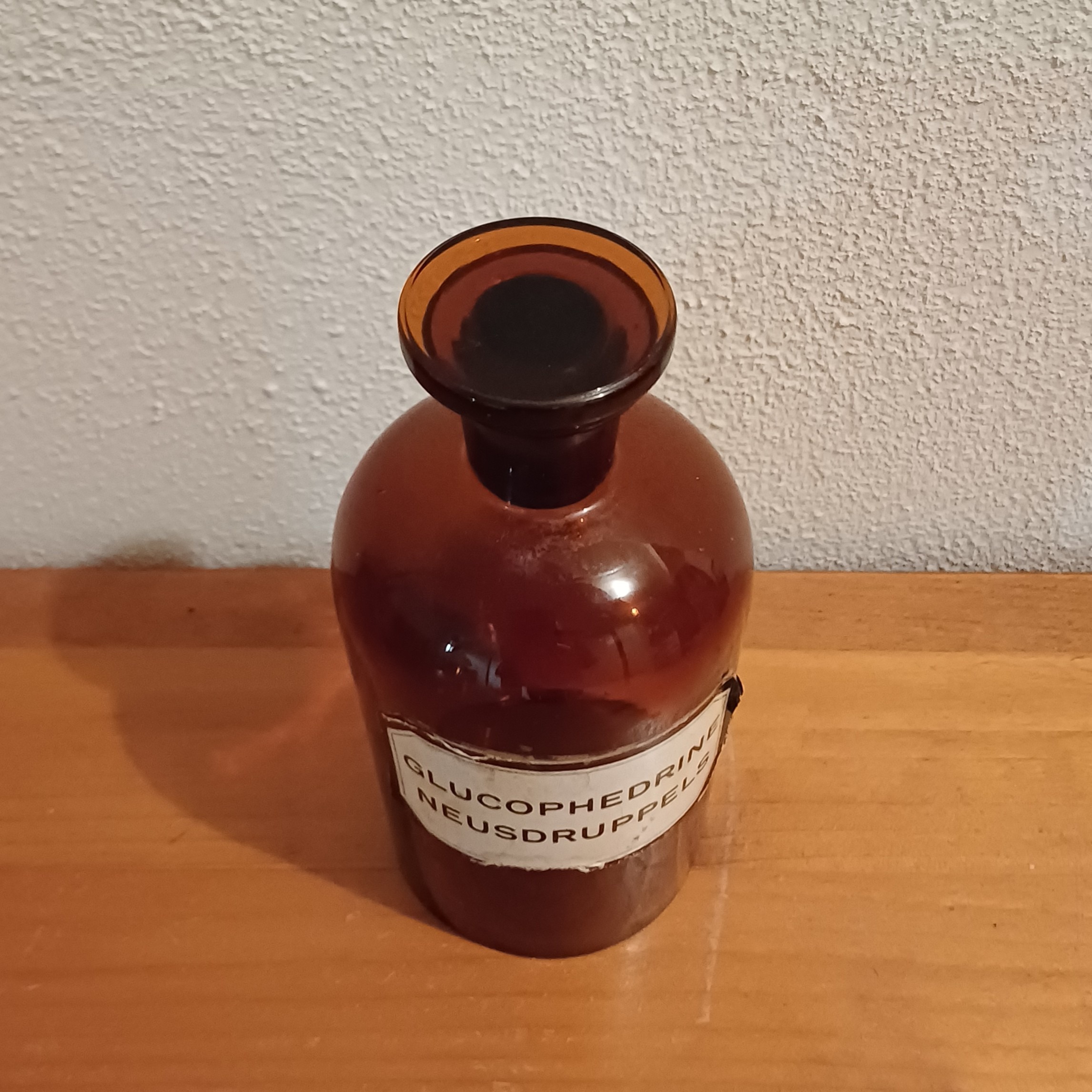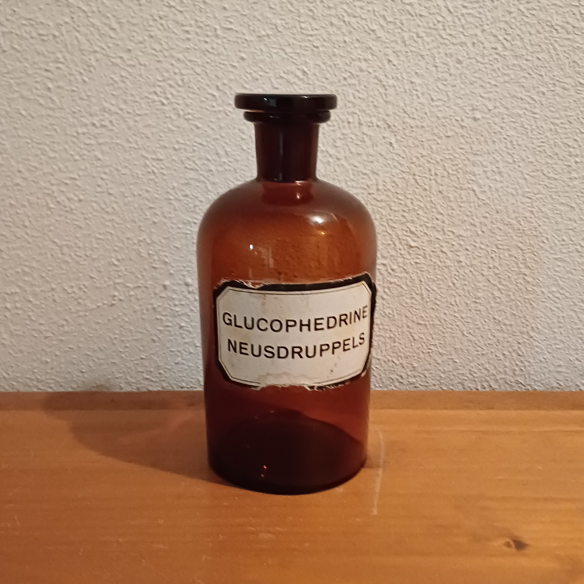 Mooie bruine apothekerspot met oud etiket voor glucophedrine (neusdruppels). Ronde vorm met een platte dop. Sluit goed af.