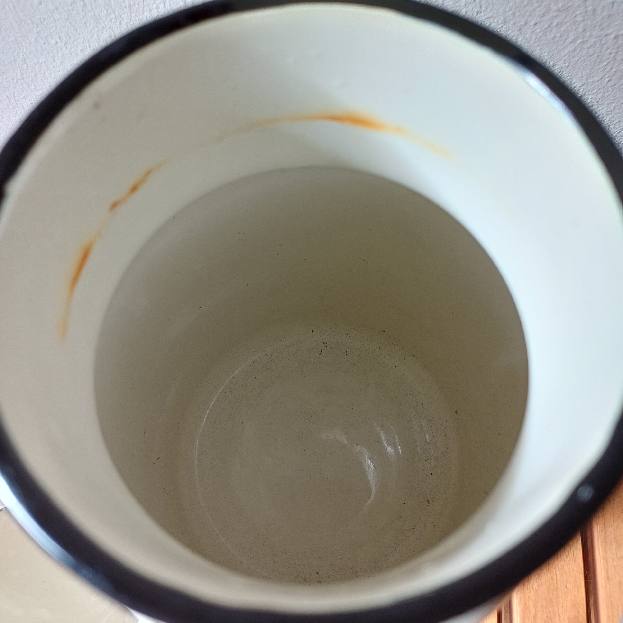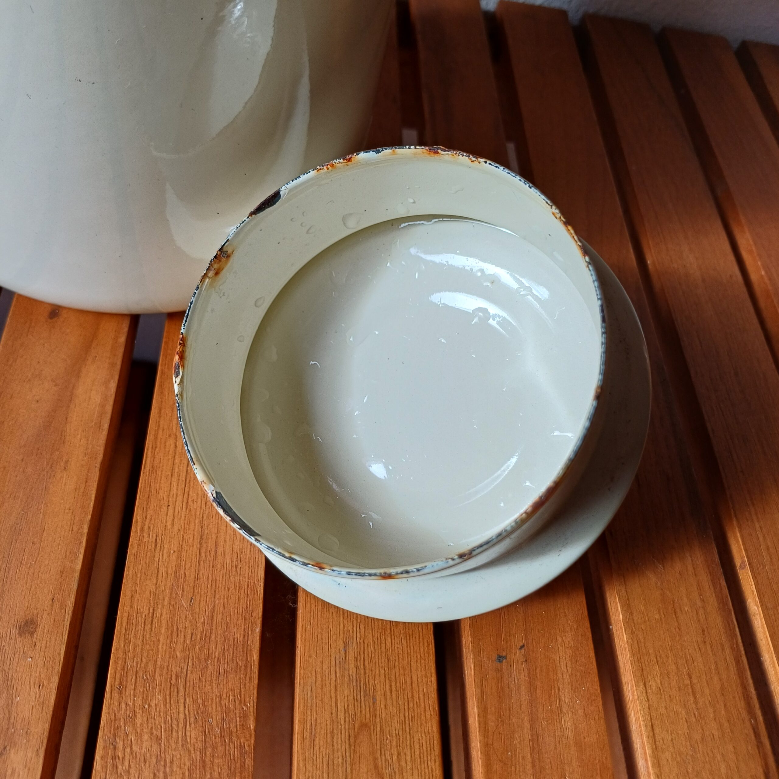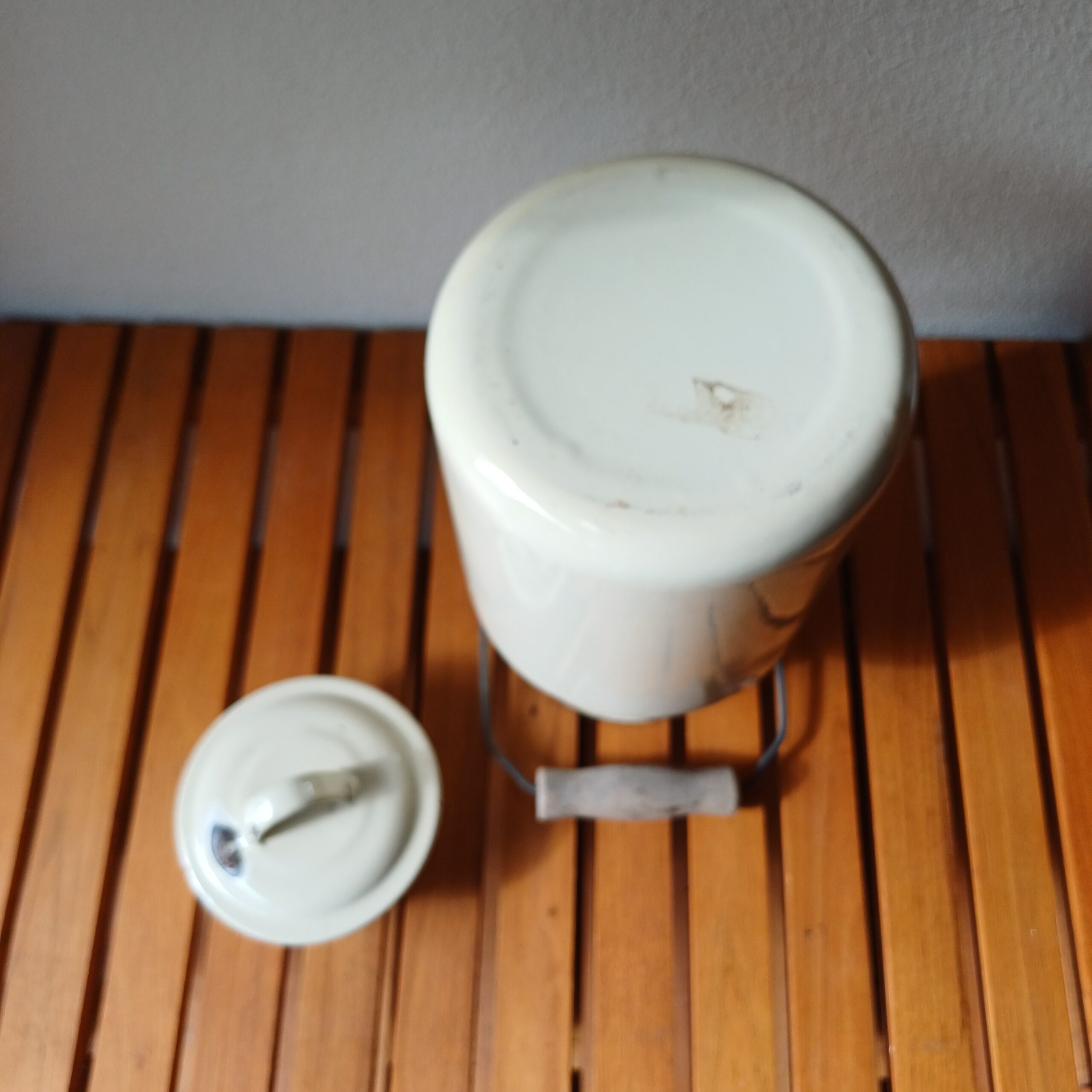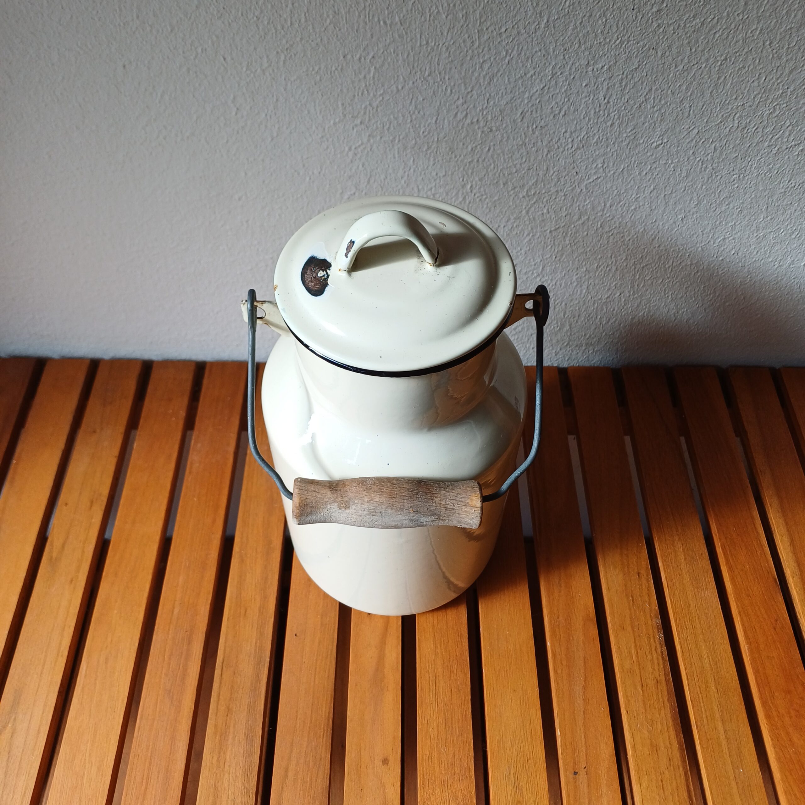 Superleuke vintage crème witte emaille melkbus. Nog compleet met deksel en houten handgreep. De bodem is nog heel goed.