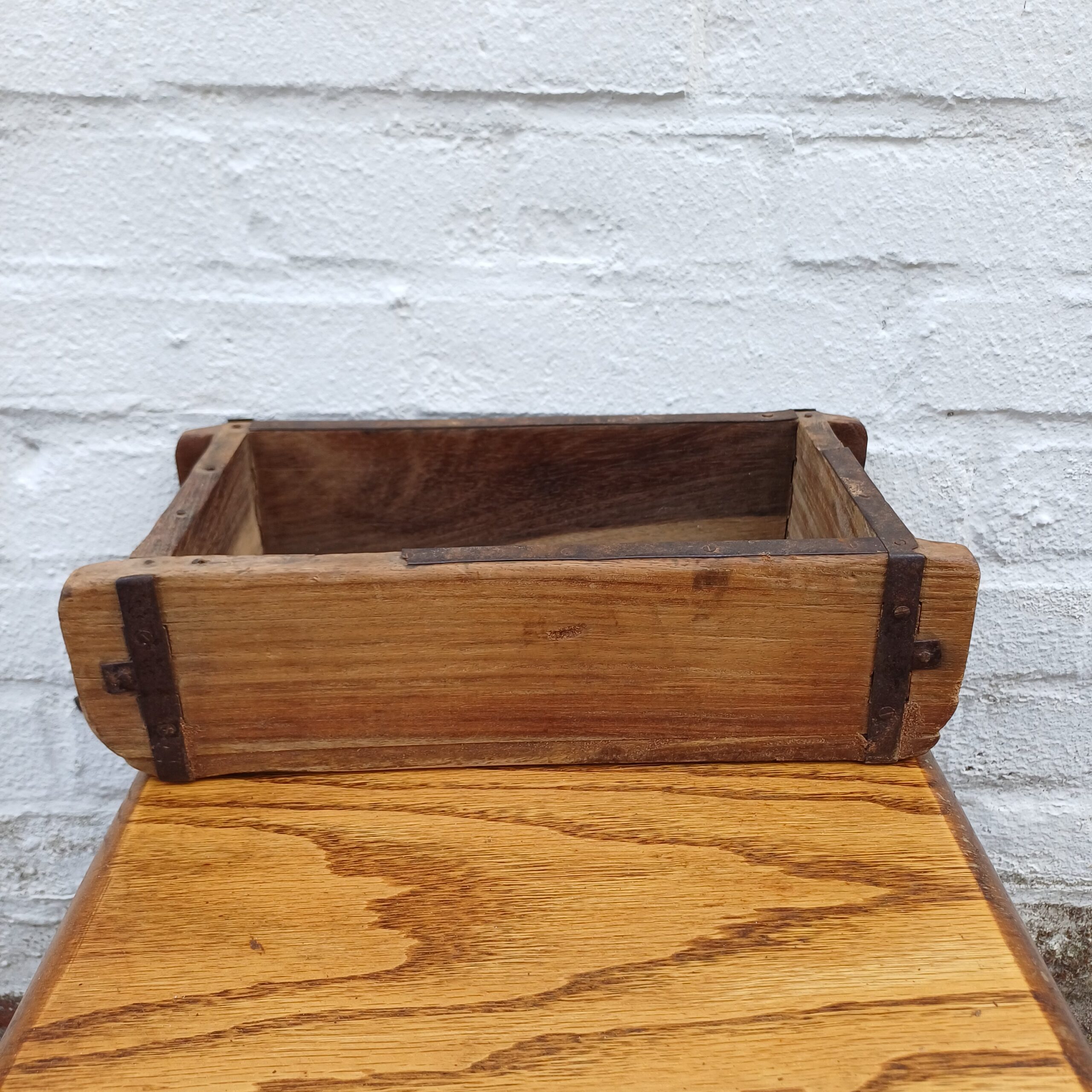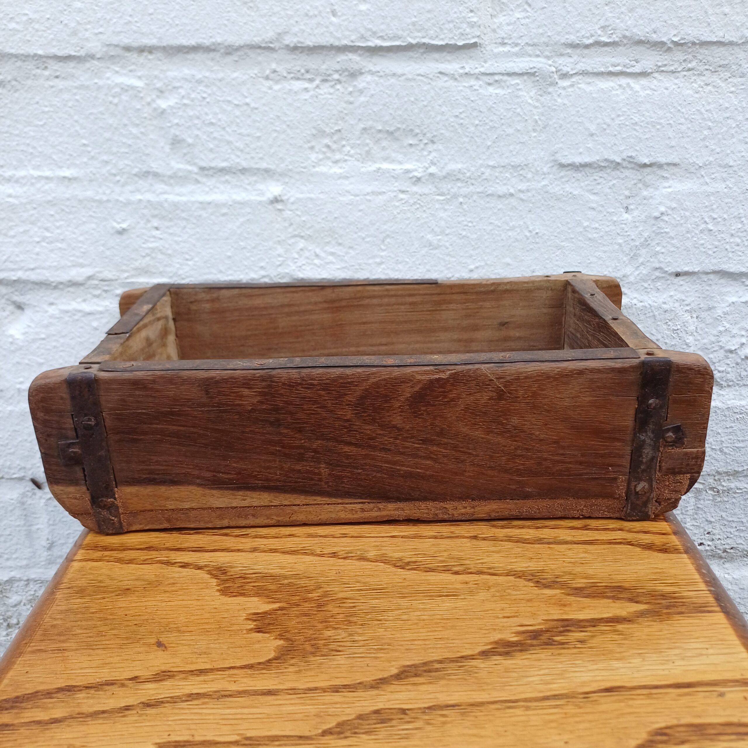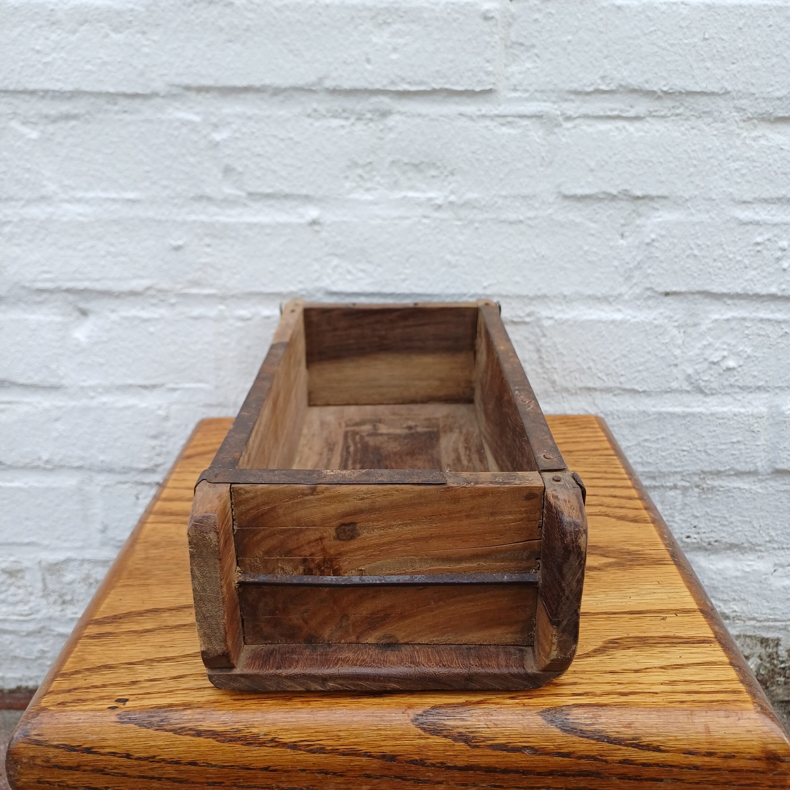 Vintage, houten steenmal. Vroeger werd dit type mal in landen als India gebruikt om handgevormde bakstenen van klei te maken. De mallen werden in de zon gedroogd voordat de stenen eruit werden gehaald en gebakken. Tegenwoordig worden deze rustieke houten bakstenen mallen vaak hergebruikt als decoratieve opbergbakjes of plantenbakken. Het verweerde uiterlijk en het authentieke karakter maken het gewilde decoratiestukken.