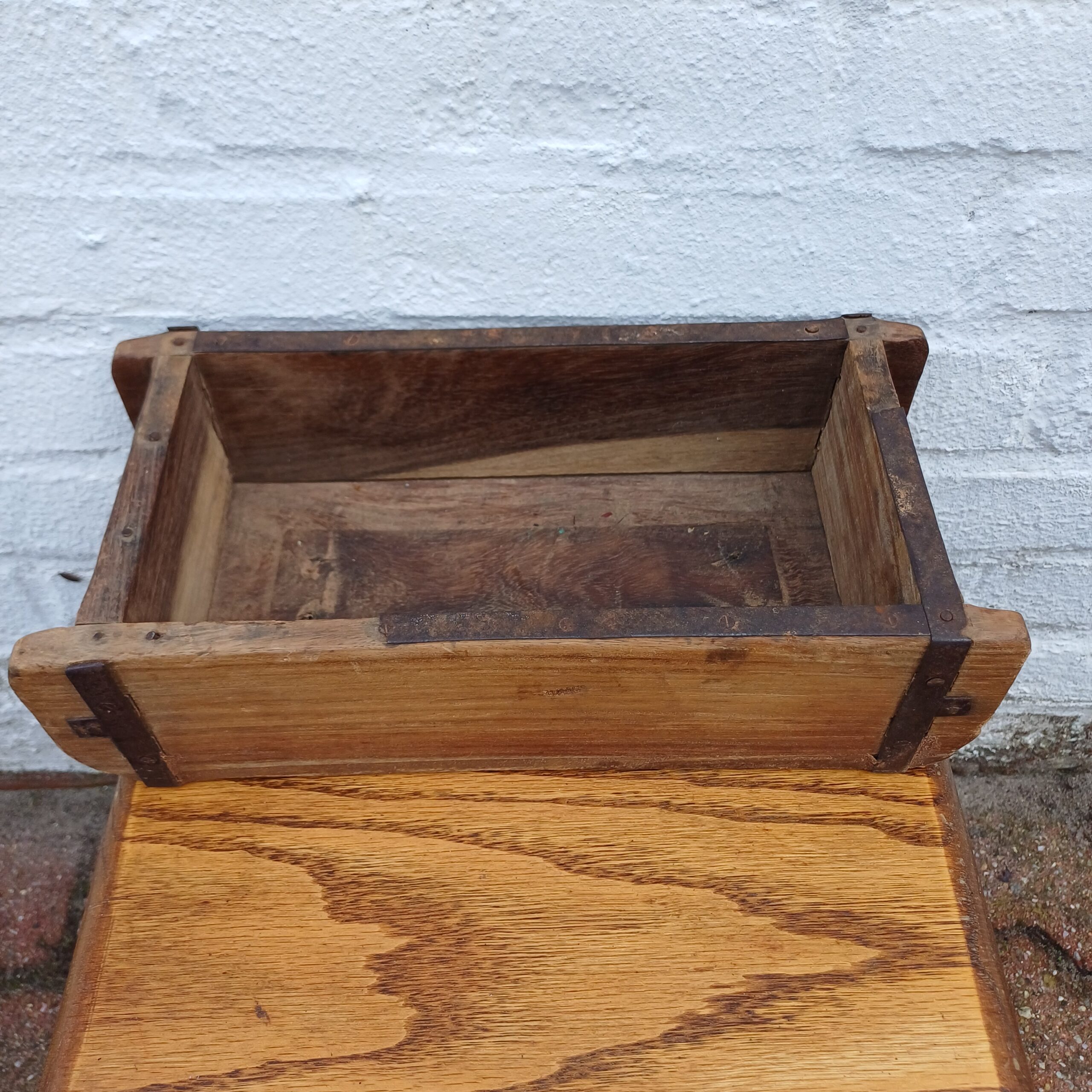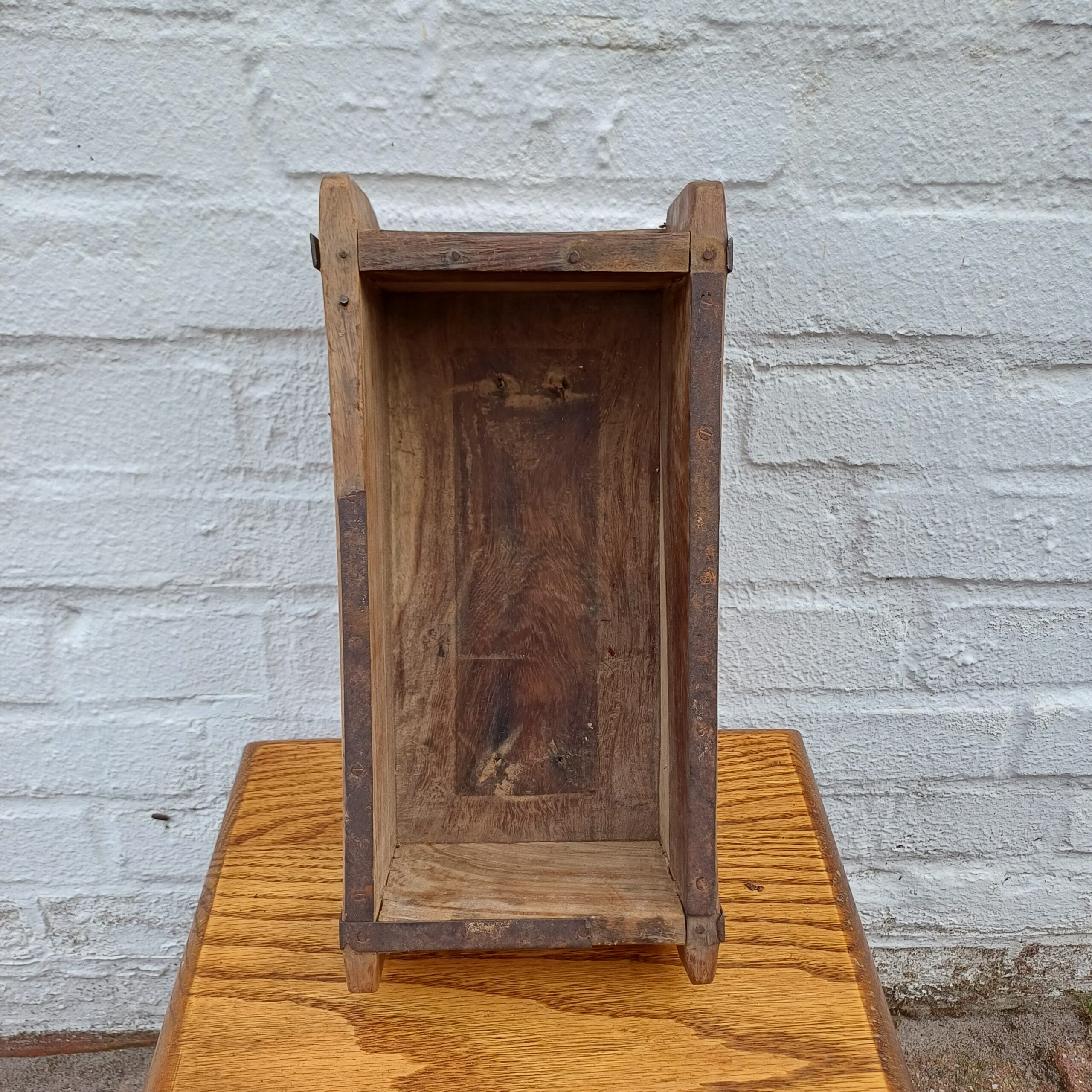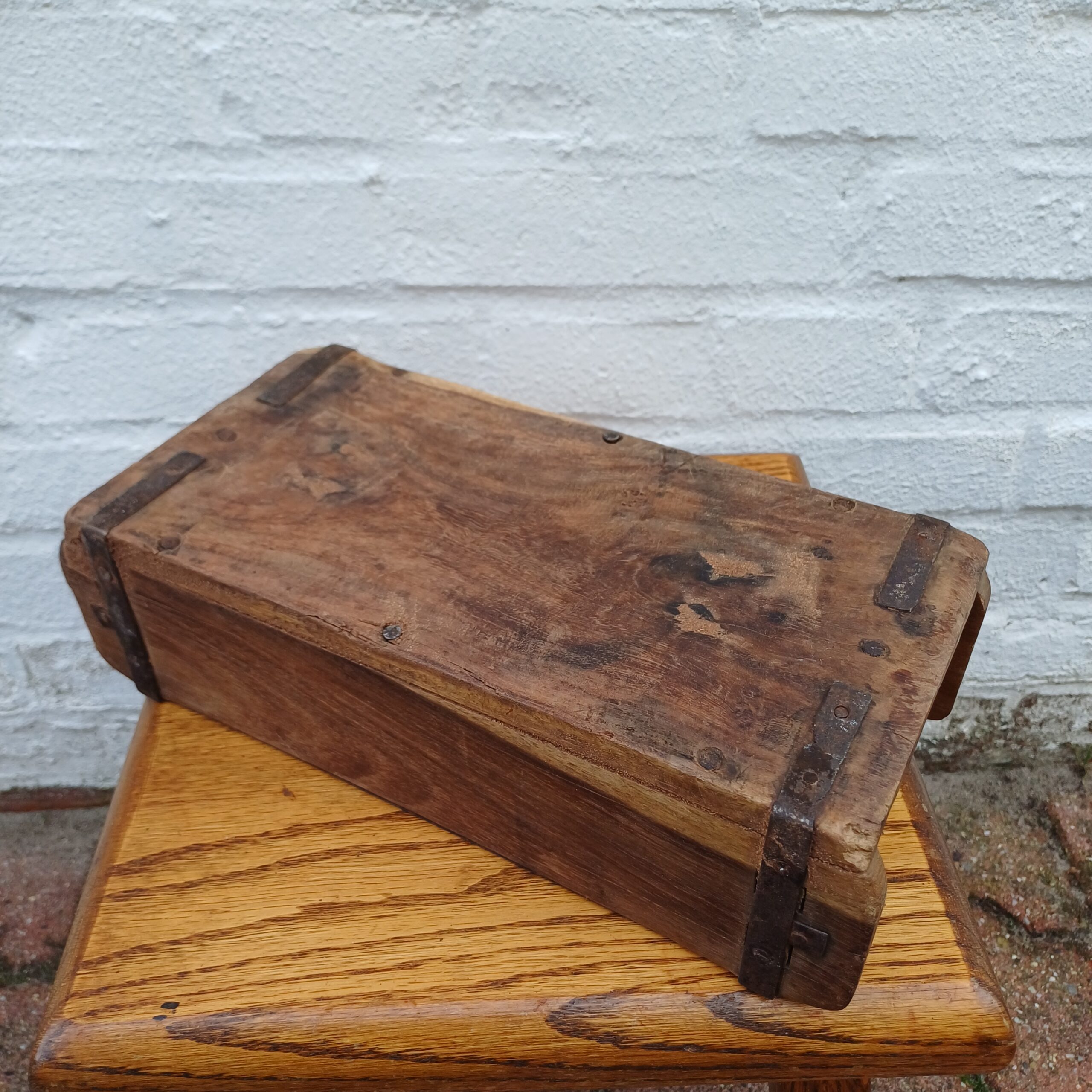 Vintage, houten steenmal. Vroeger werd dit type mal in landen als India gebruikt om handgevormde bakstenen van klei te maken. De mallen werden in de zon gedroogd voordat de stenen eruit werden gehaald en gebakken. Tegenwoordig worden deze rustieke houten bakstenen mallen vaak hergebruikt als decoratieve opbergbakjes of plantenbakken. Het verweerde uiterlijk en het authentieke karakter maken het gewilde decoratiestukken.