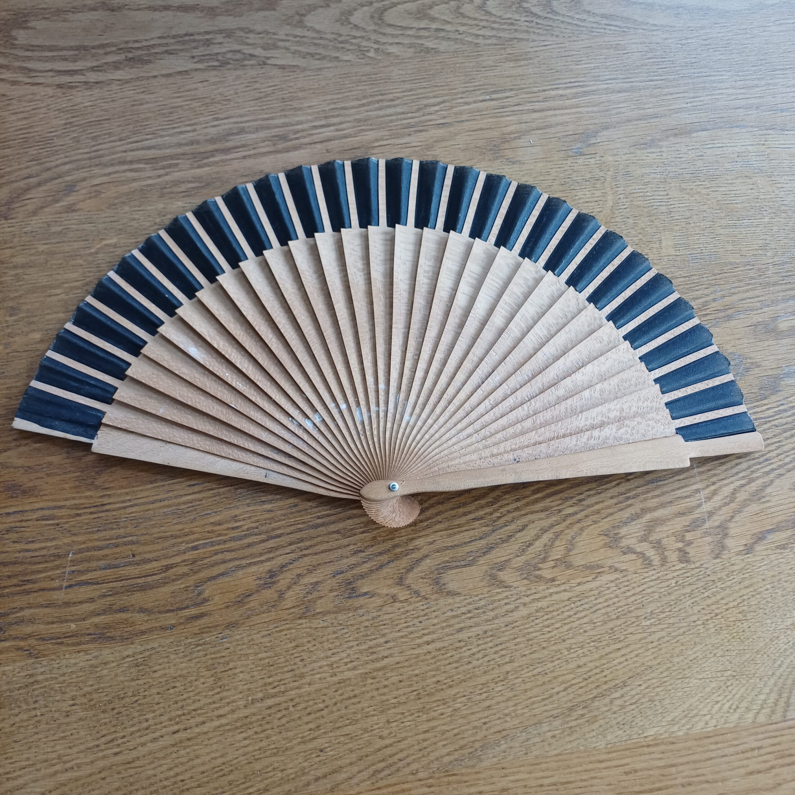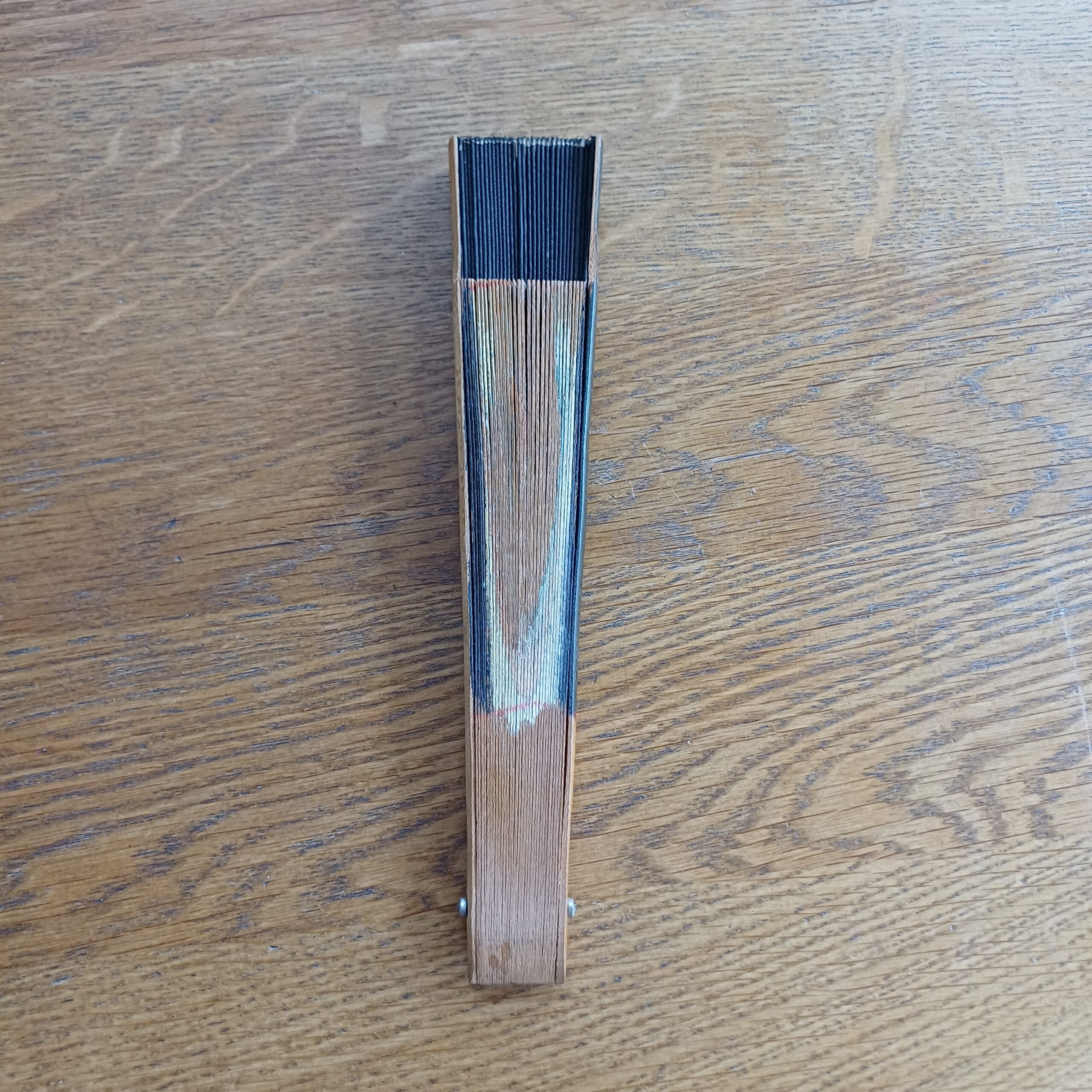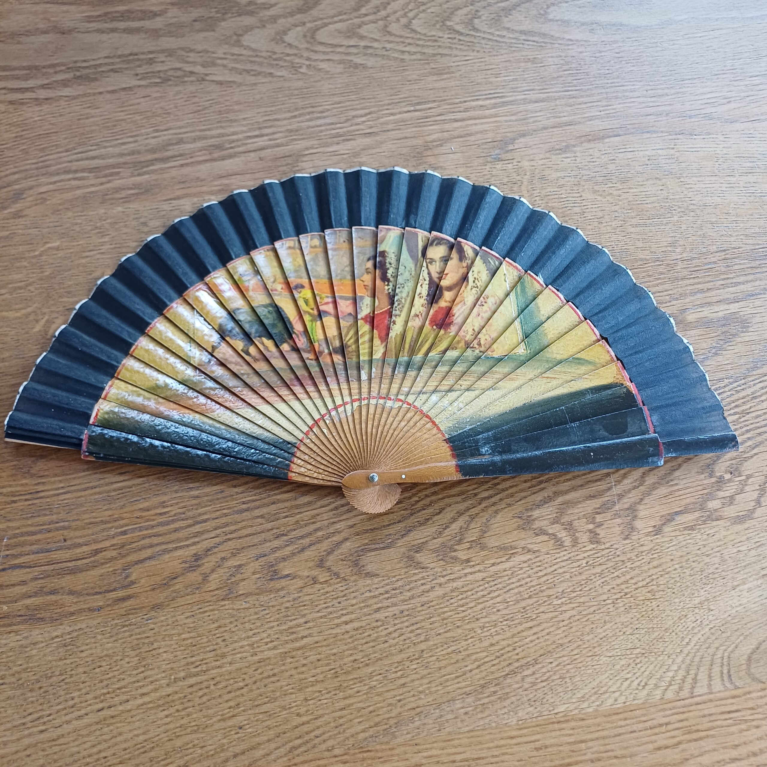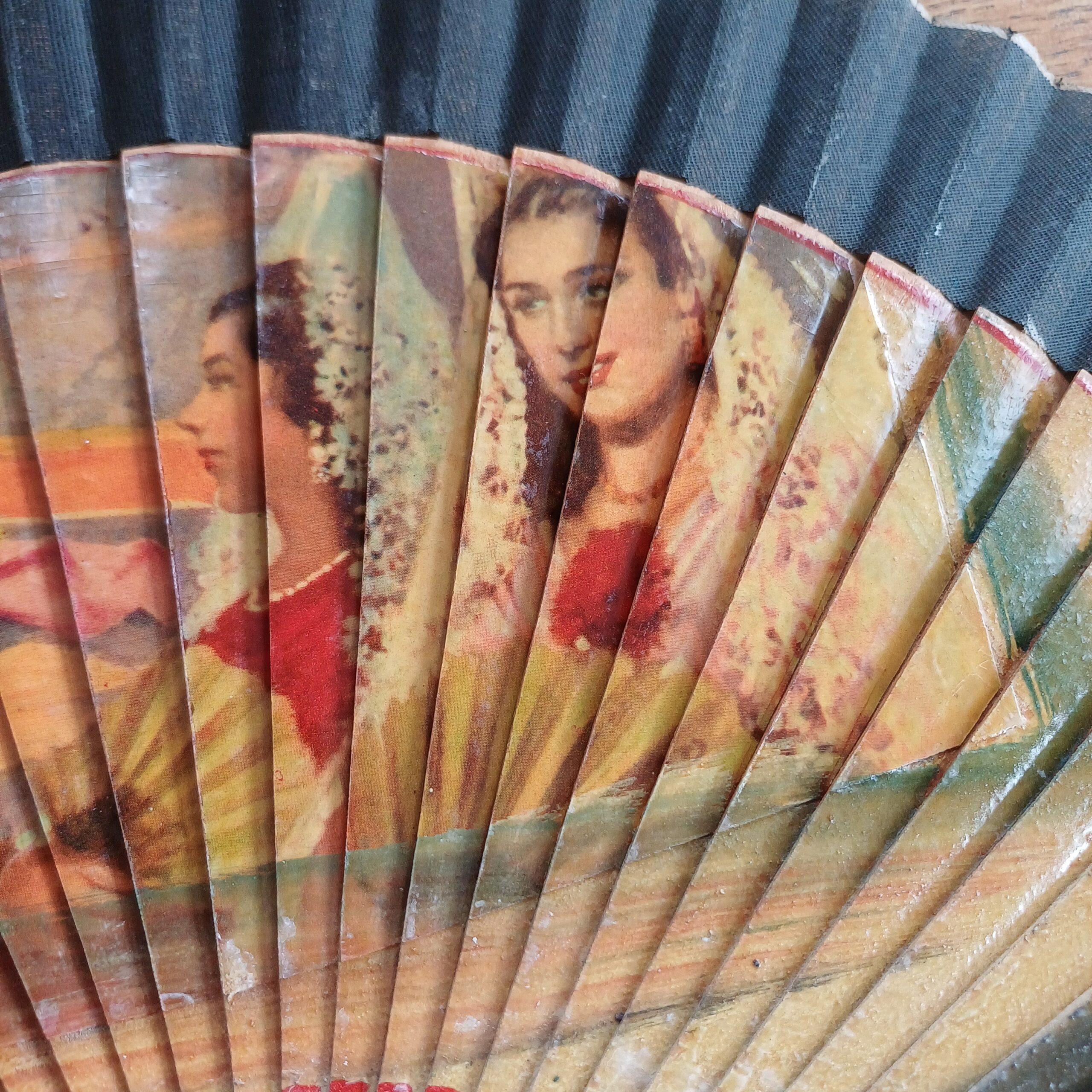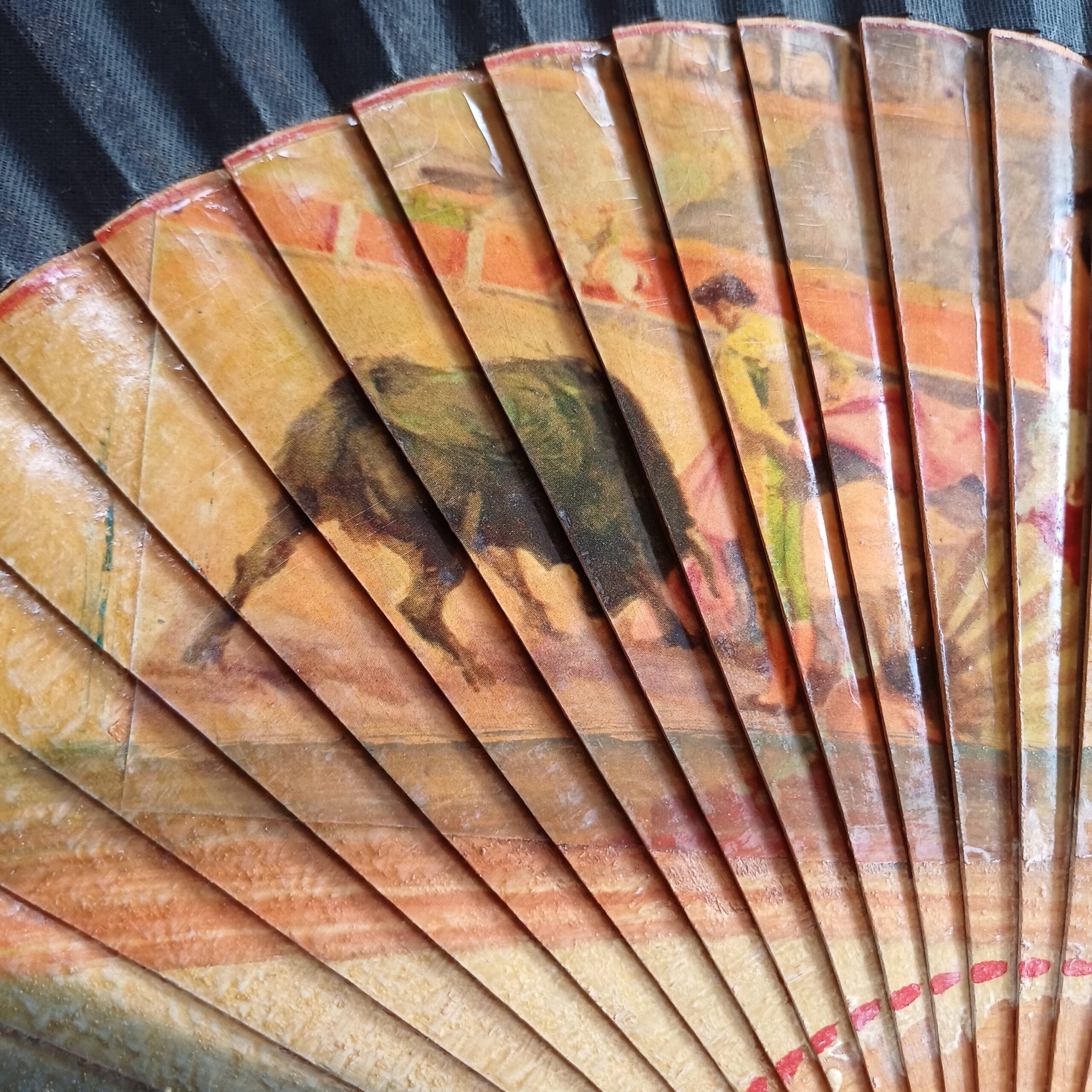 Prachtige oude Spaanse waaier met afbeeldingen van stierengevechten. Links een stier en een matador, rechts 2 señorita’s.