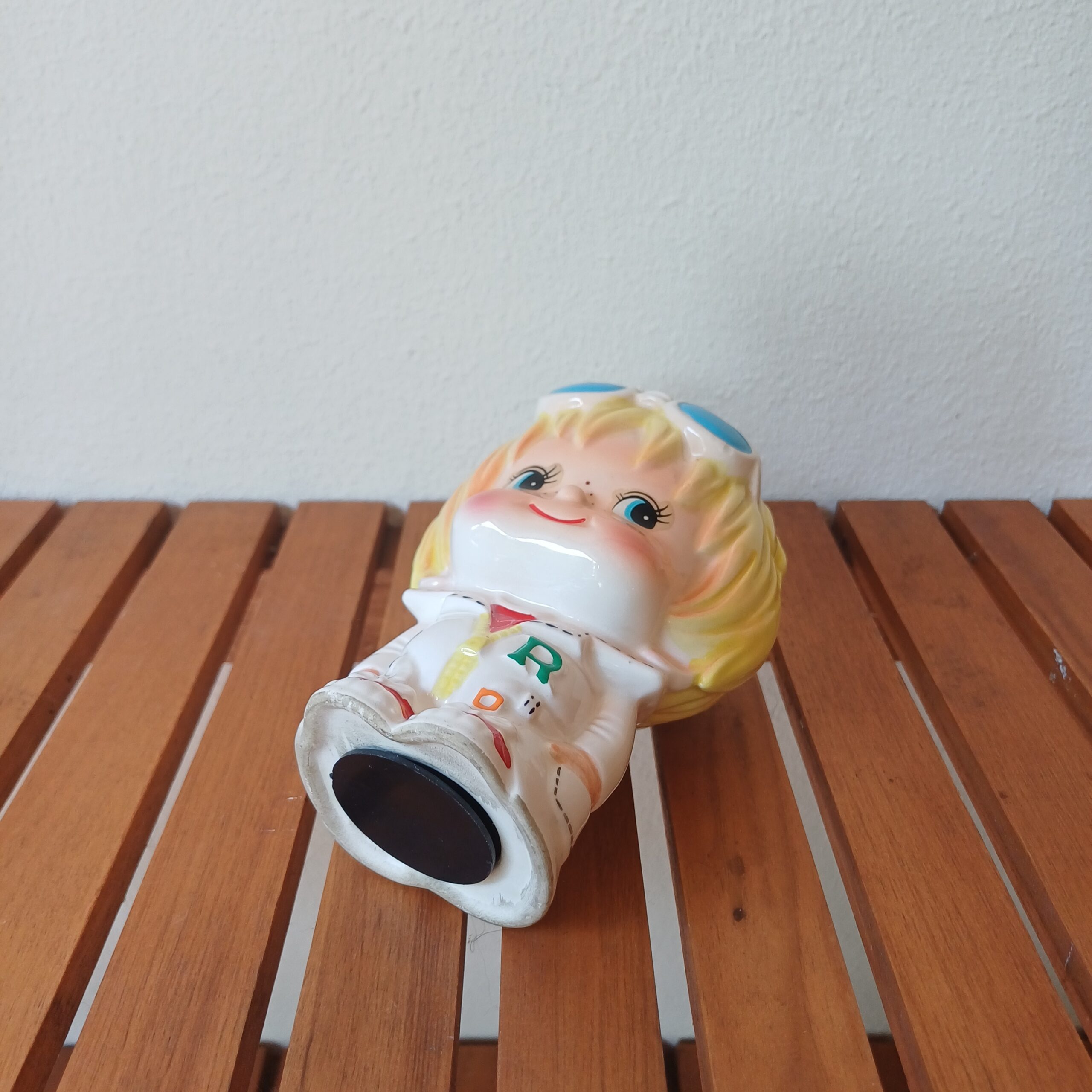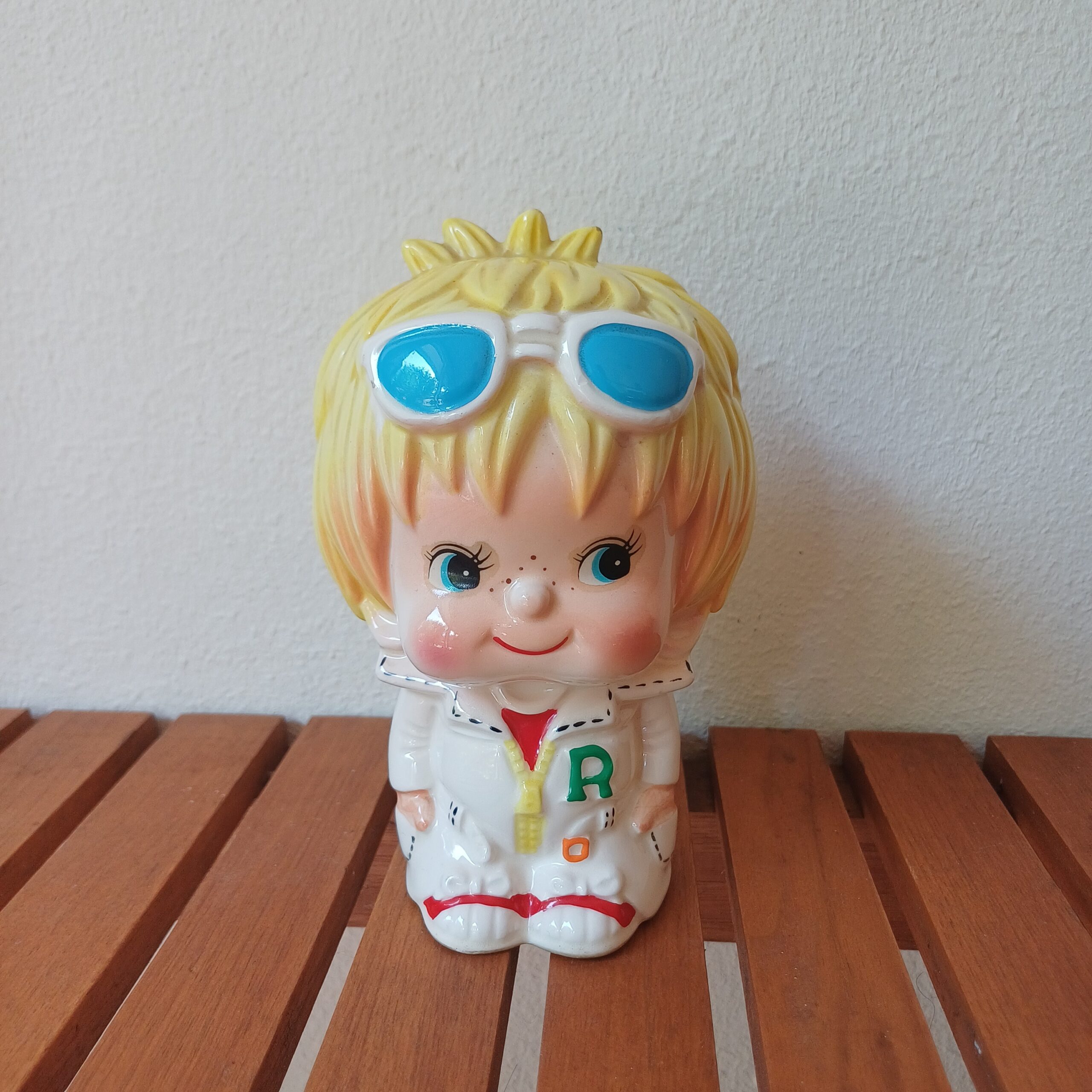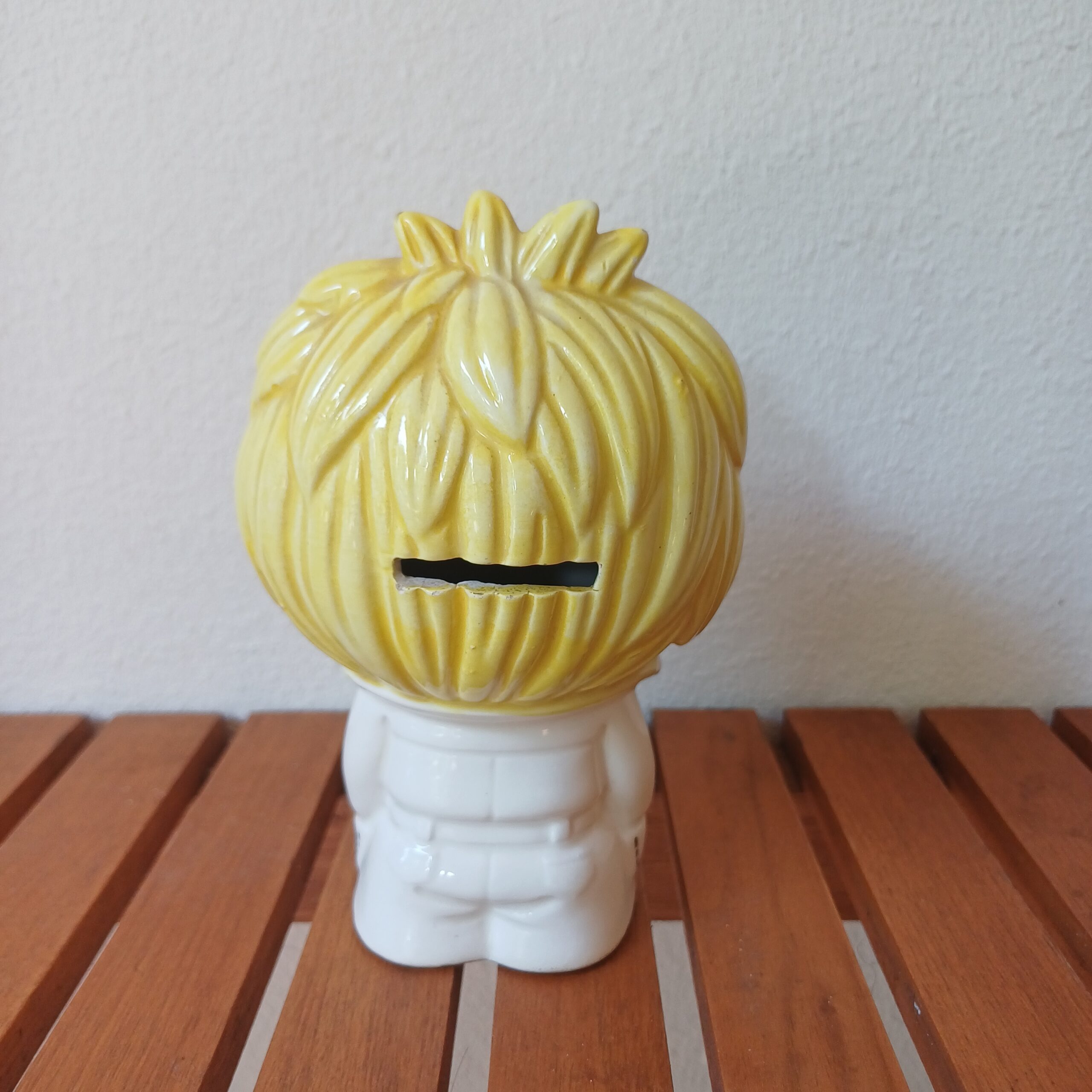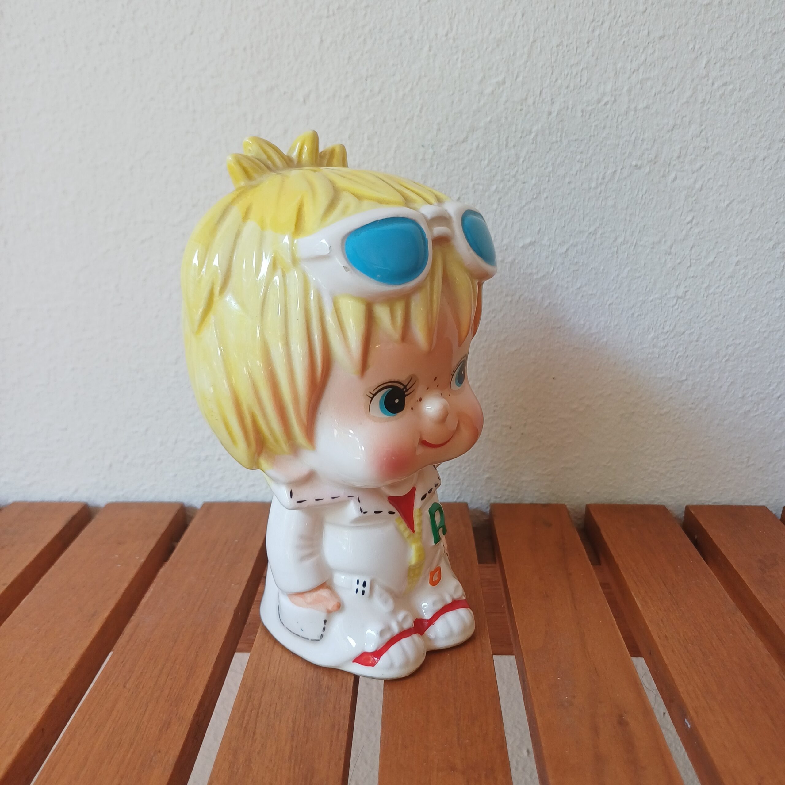 Wat een stoer jongetje is dit! Een spaarpot van een blonde jongen, met blosjes op zijn wangen en een stoer outfit. Aan de achterkant zit een gleuf waardoor je geld in de spaarpot kunt stoppen, onderop een rubberen afsluiting.