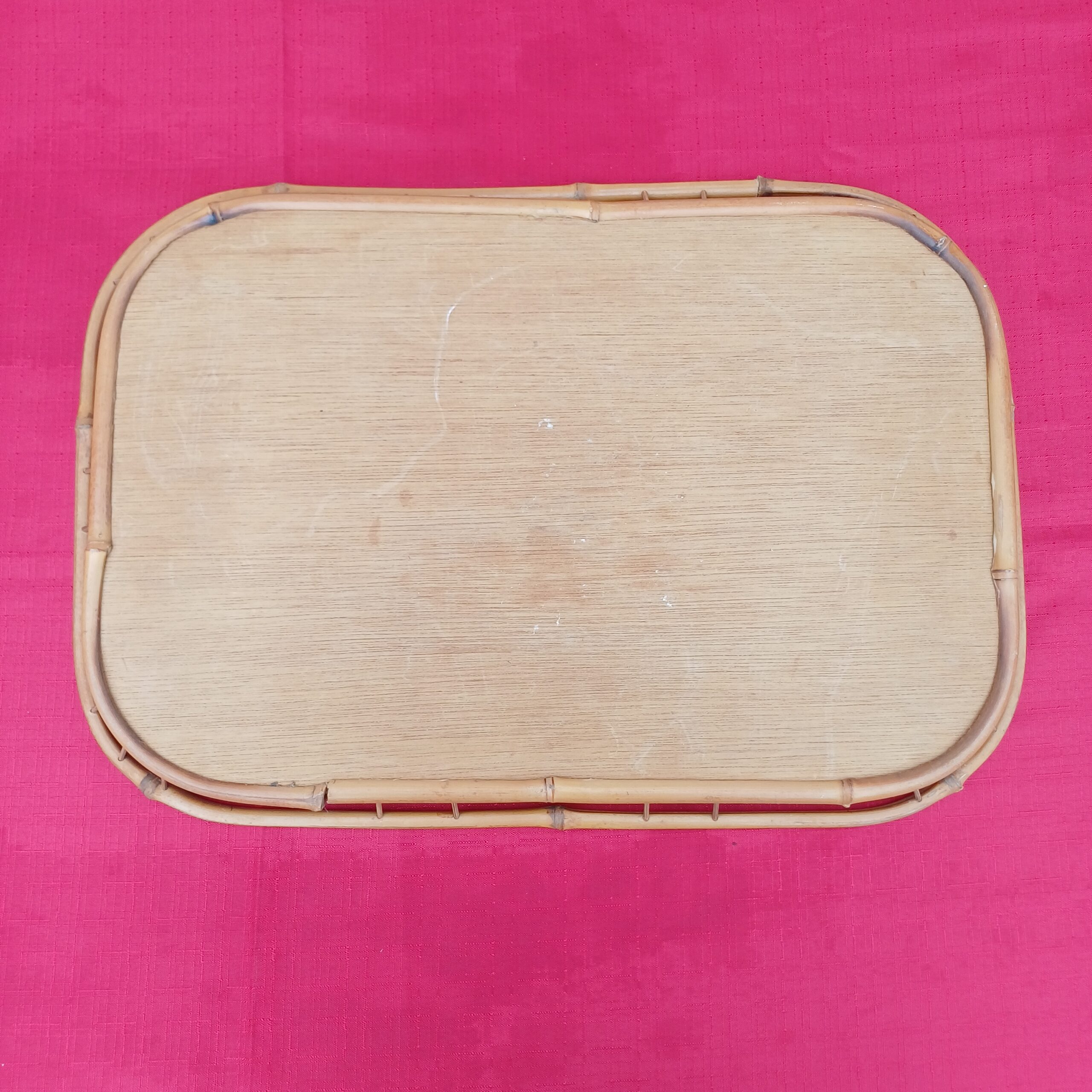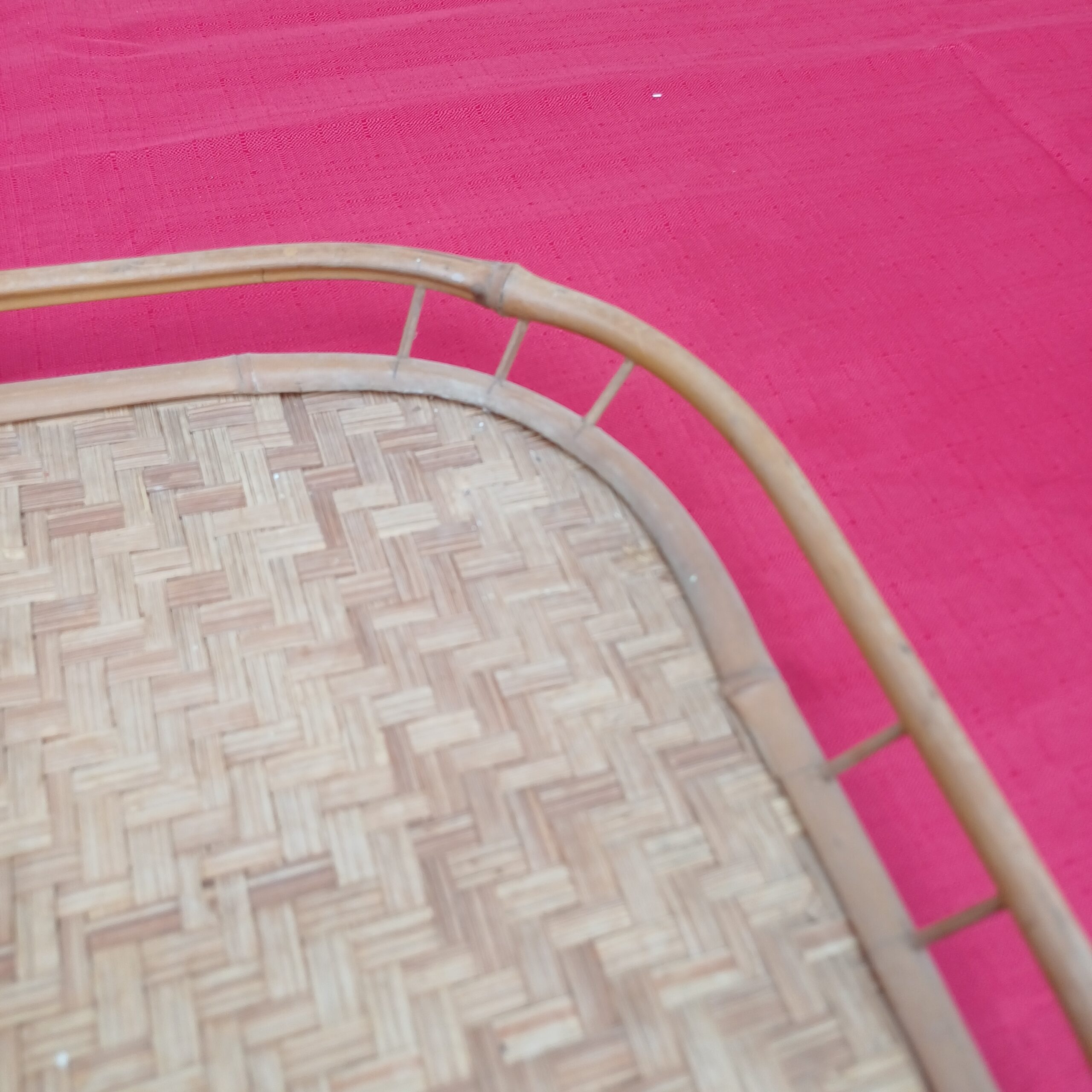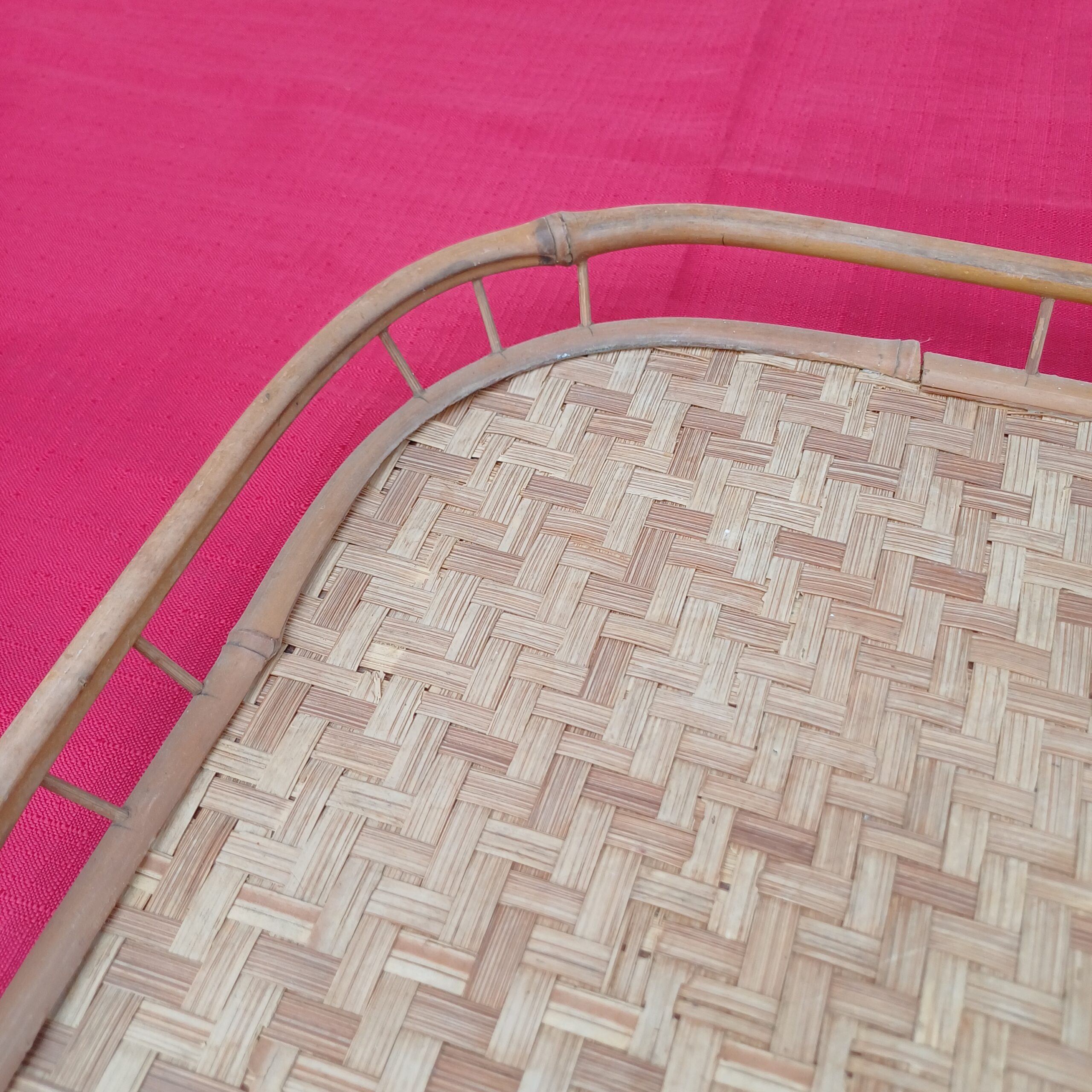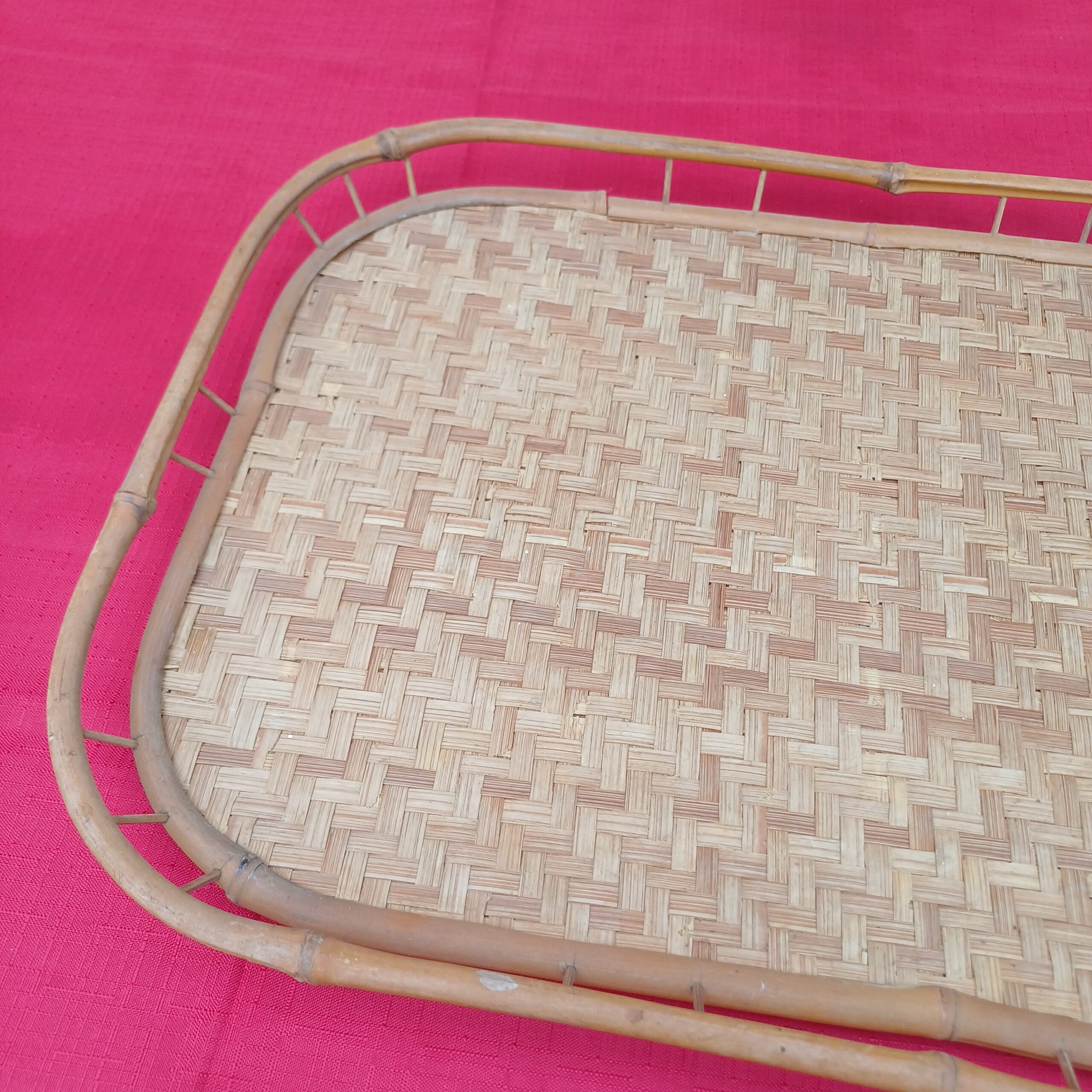 Vintage bamboe dienblad. Het dienblad heeft een prachtig bamboeframe, een geweven rieten oppervlak en een onderkant van multiplex.