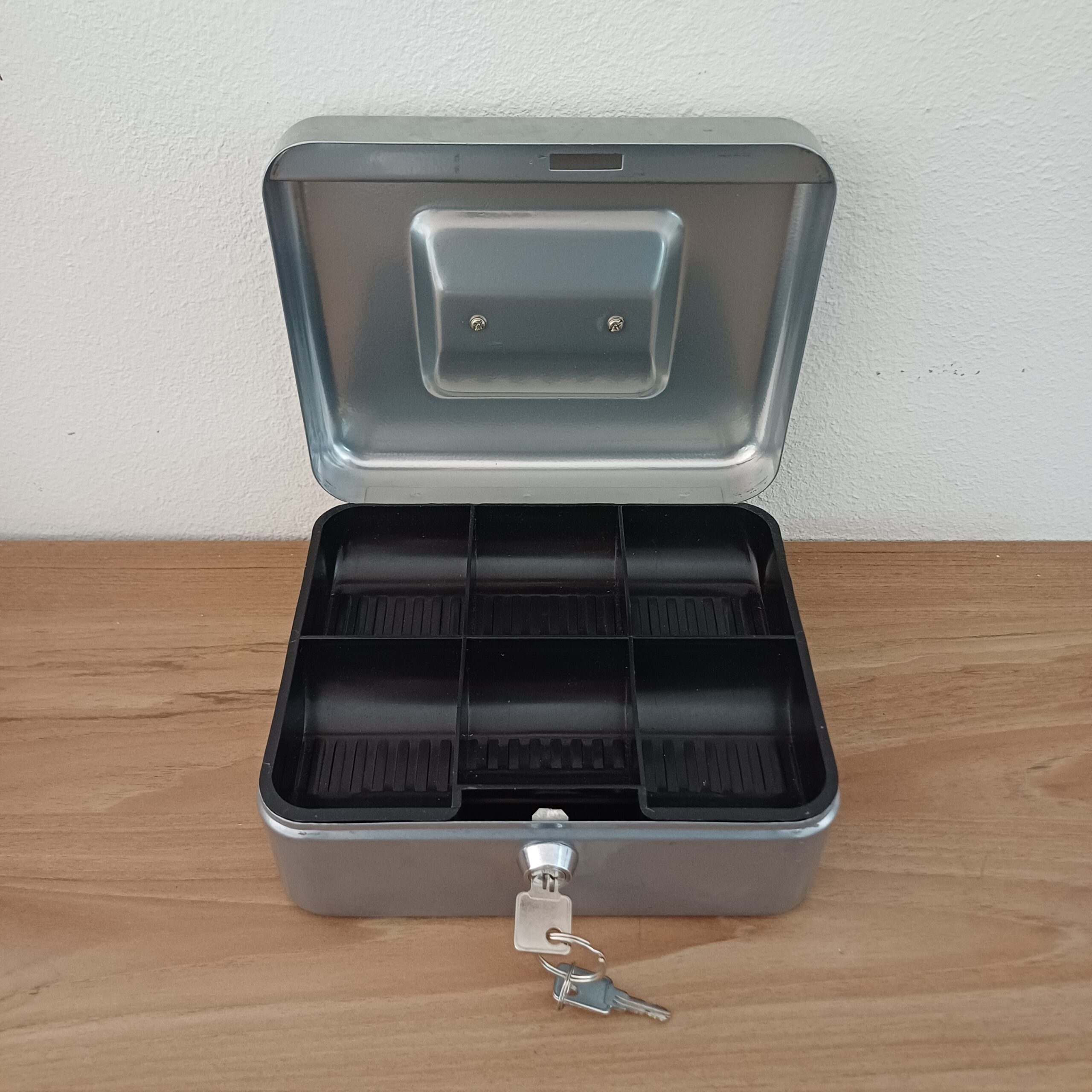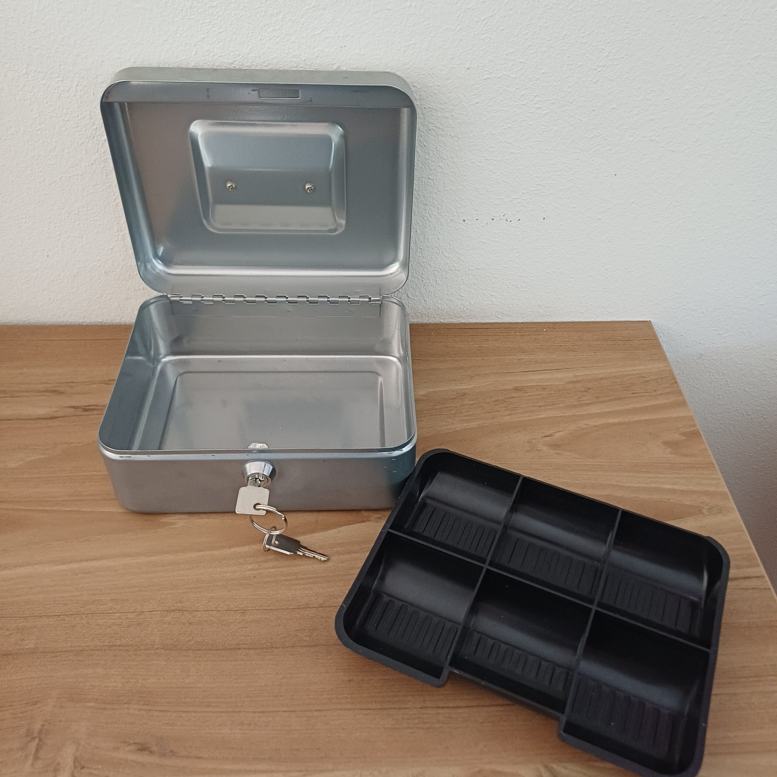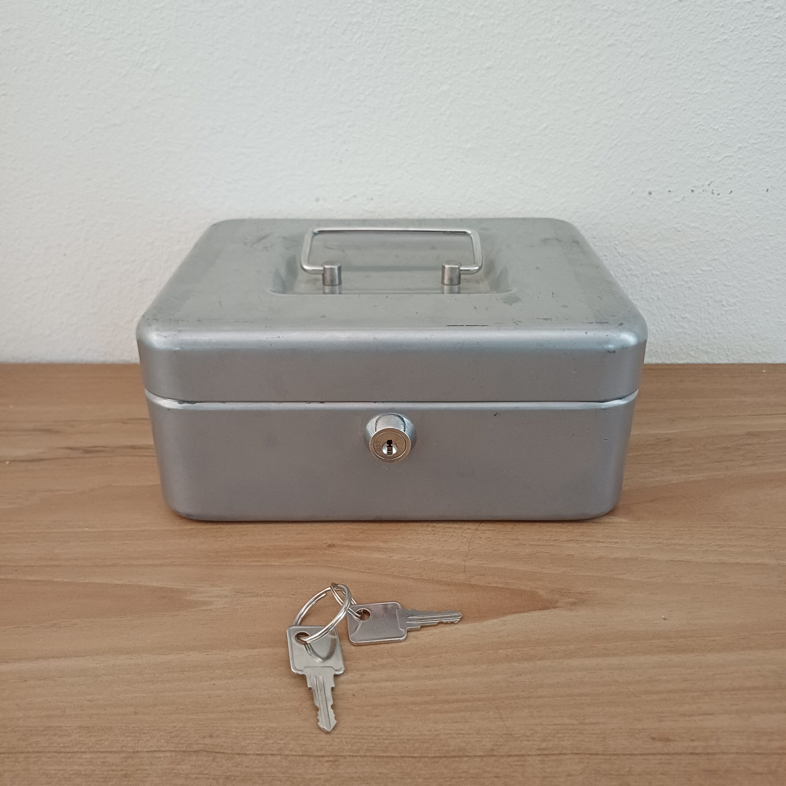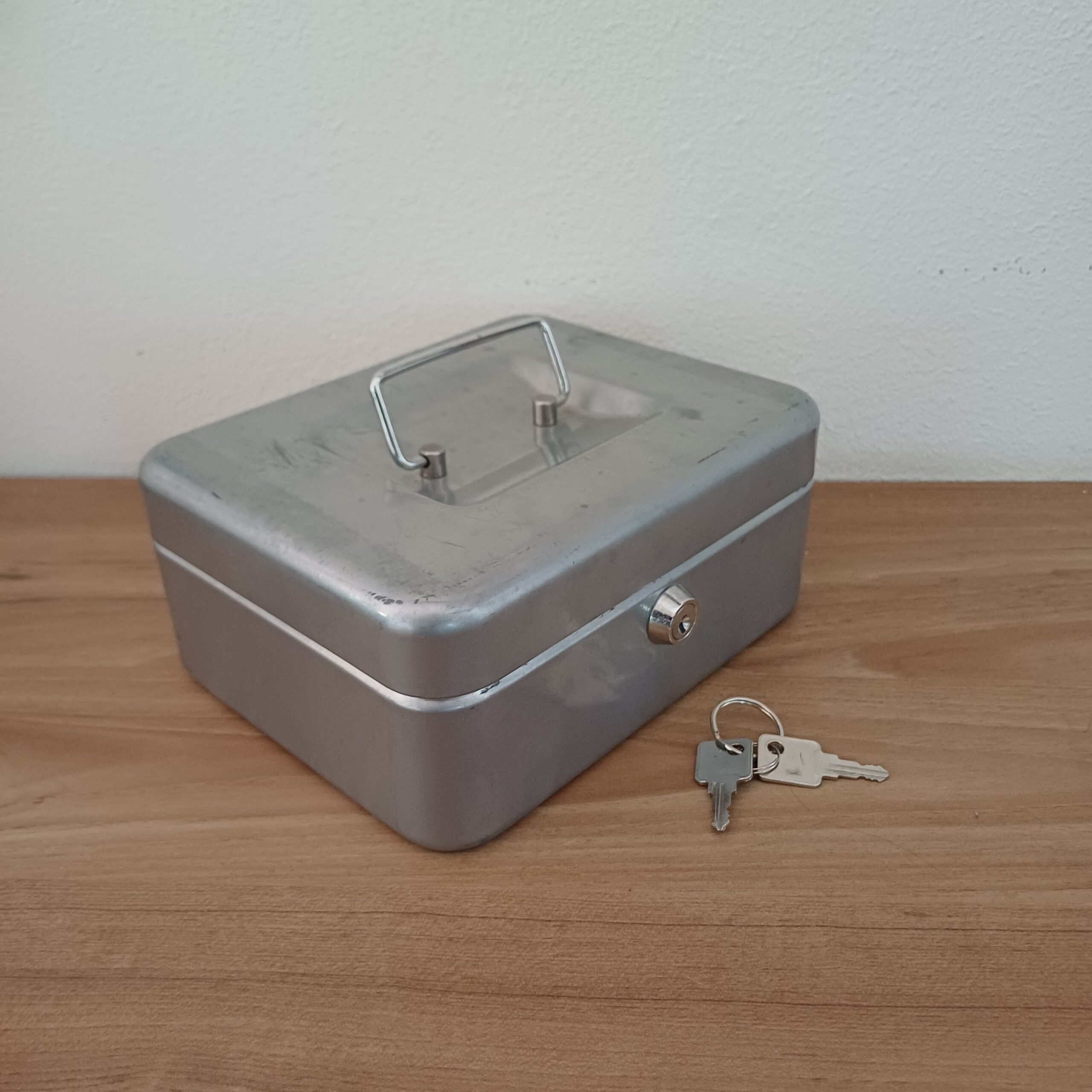 Vintage geldkistje, zilverkleurig, met kleingeldlade. Er zitten nog 2 sleutels bij en hij opent en sluit goed.