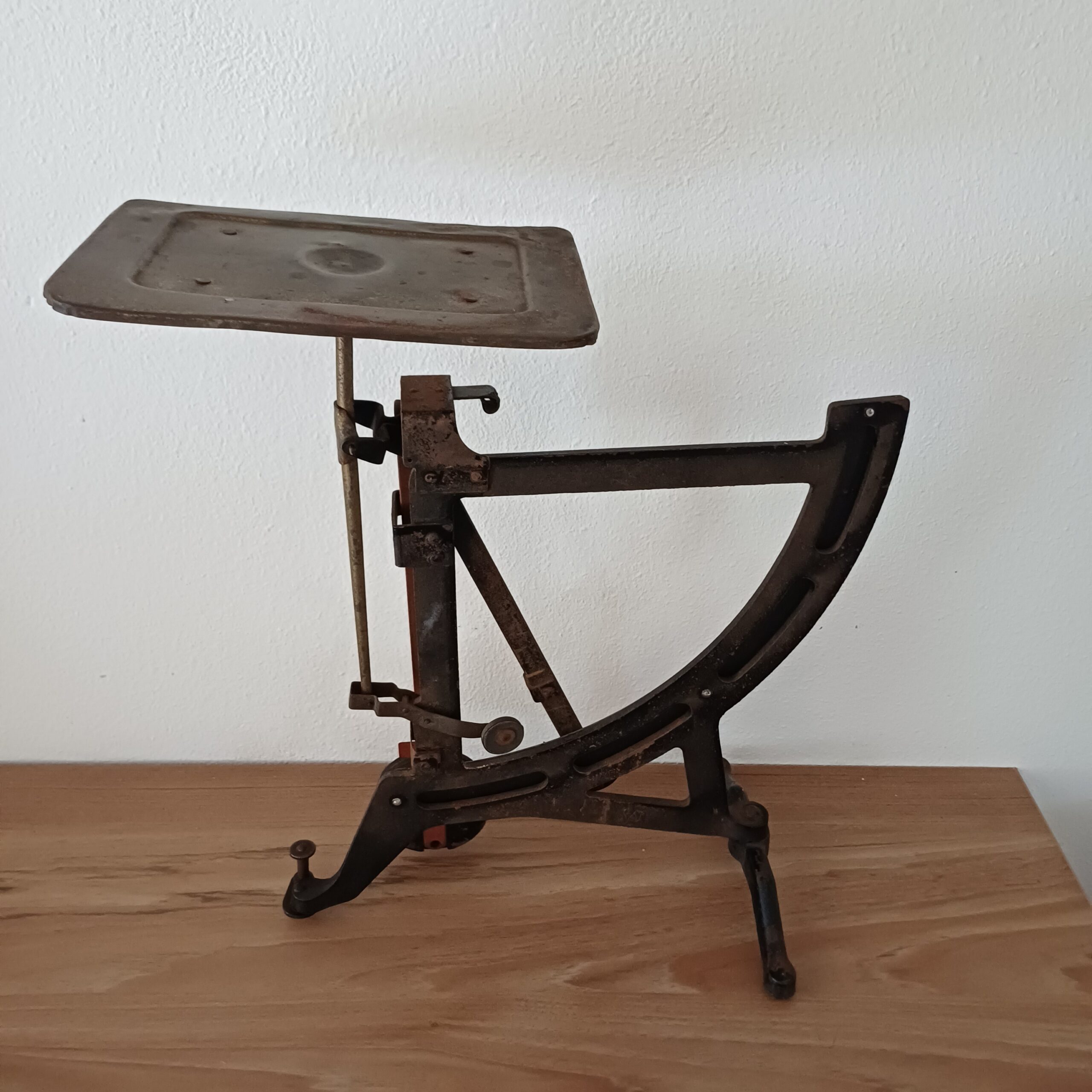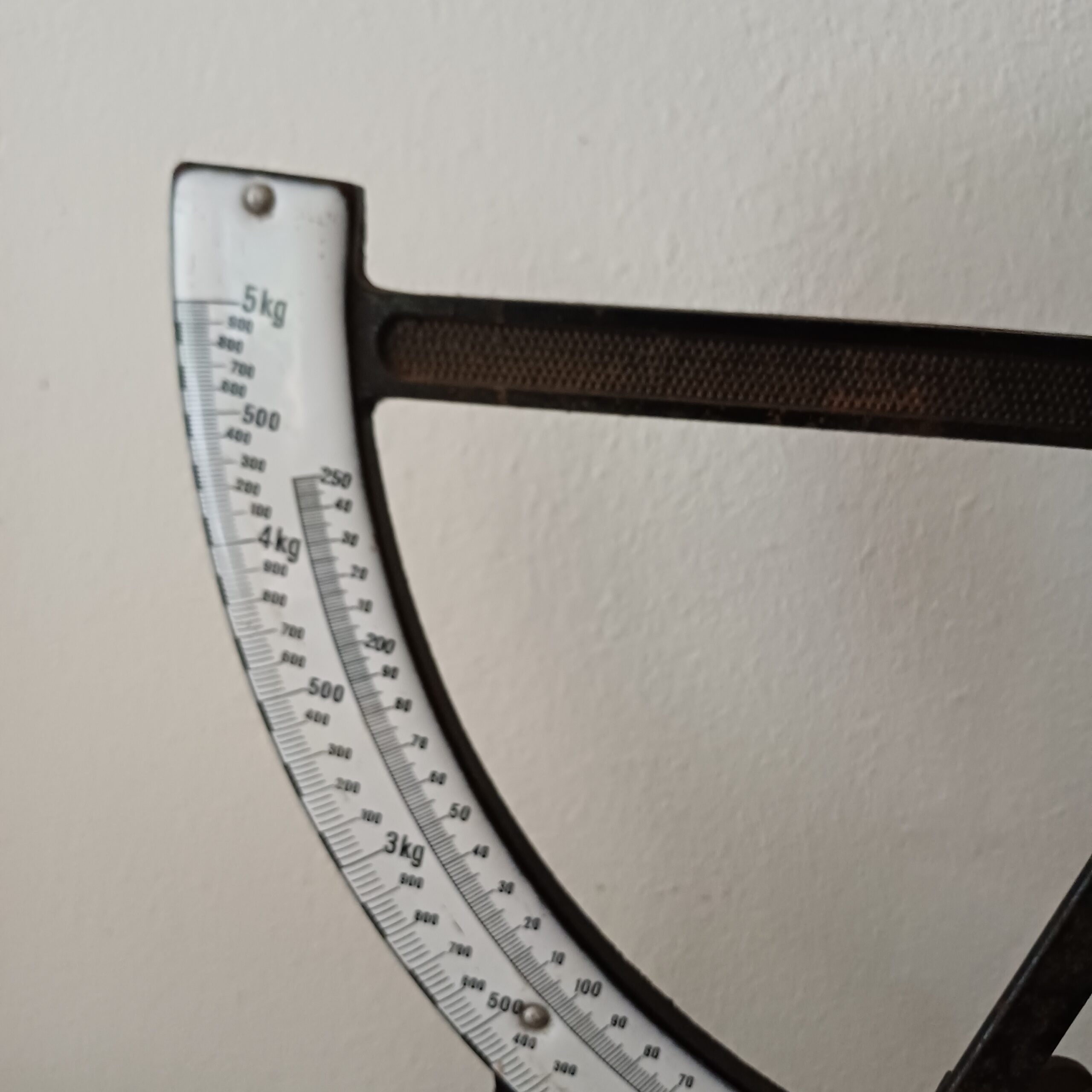 Mooie vintage postweegschaal gemaakt van metaal, een emaille plaatje met gewichtsaanduiding en met een verstelbaar gewicht. Hij kan pakketjes of zwaardere enveloppen wegen tot 5 kg, of je gebruikt hem met een nauwkeurigere instelling voor brieven of lichte items tot 250 gram.