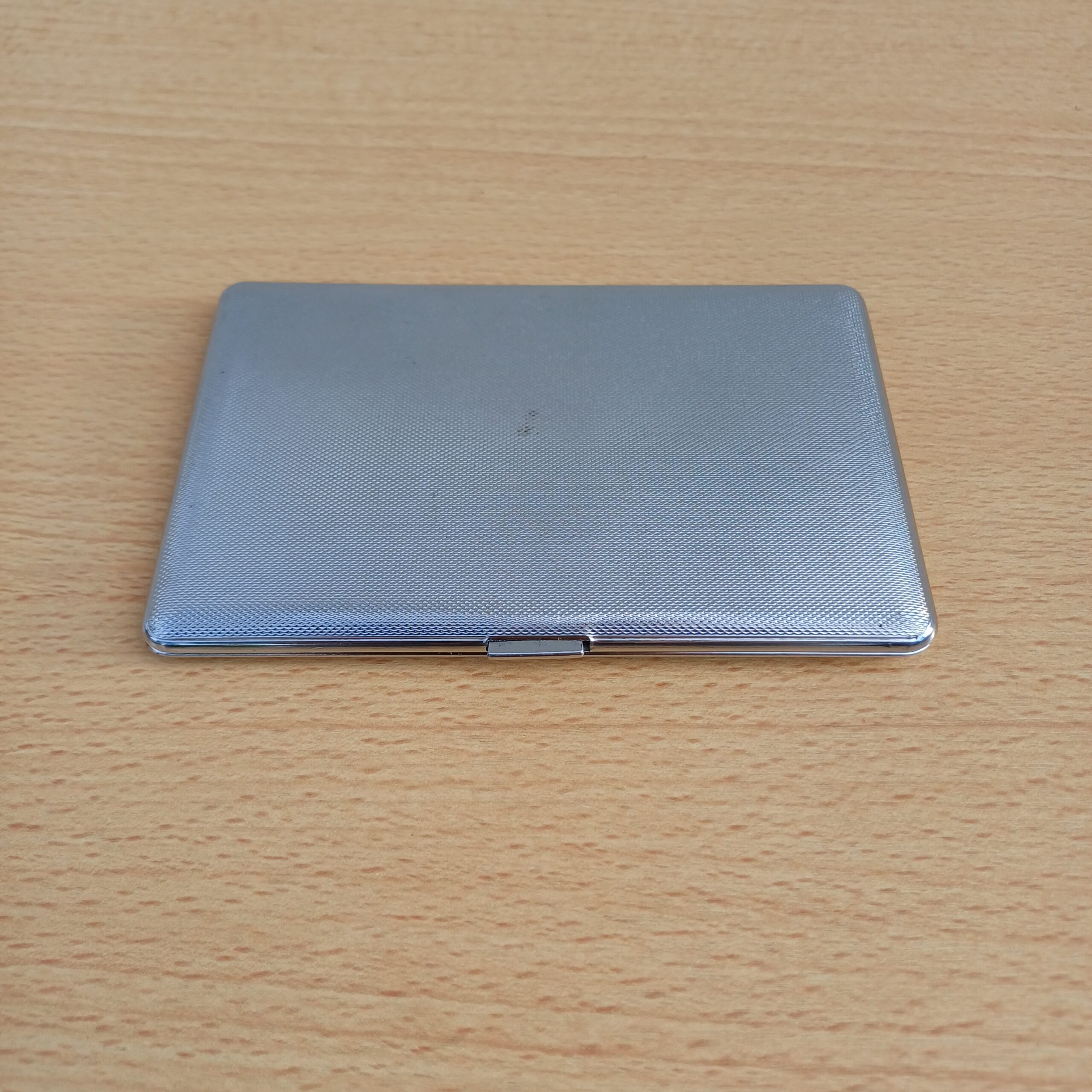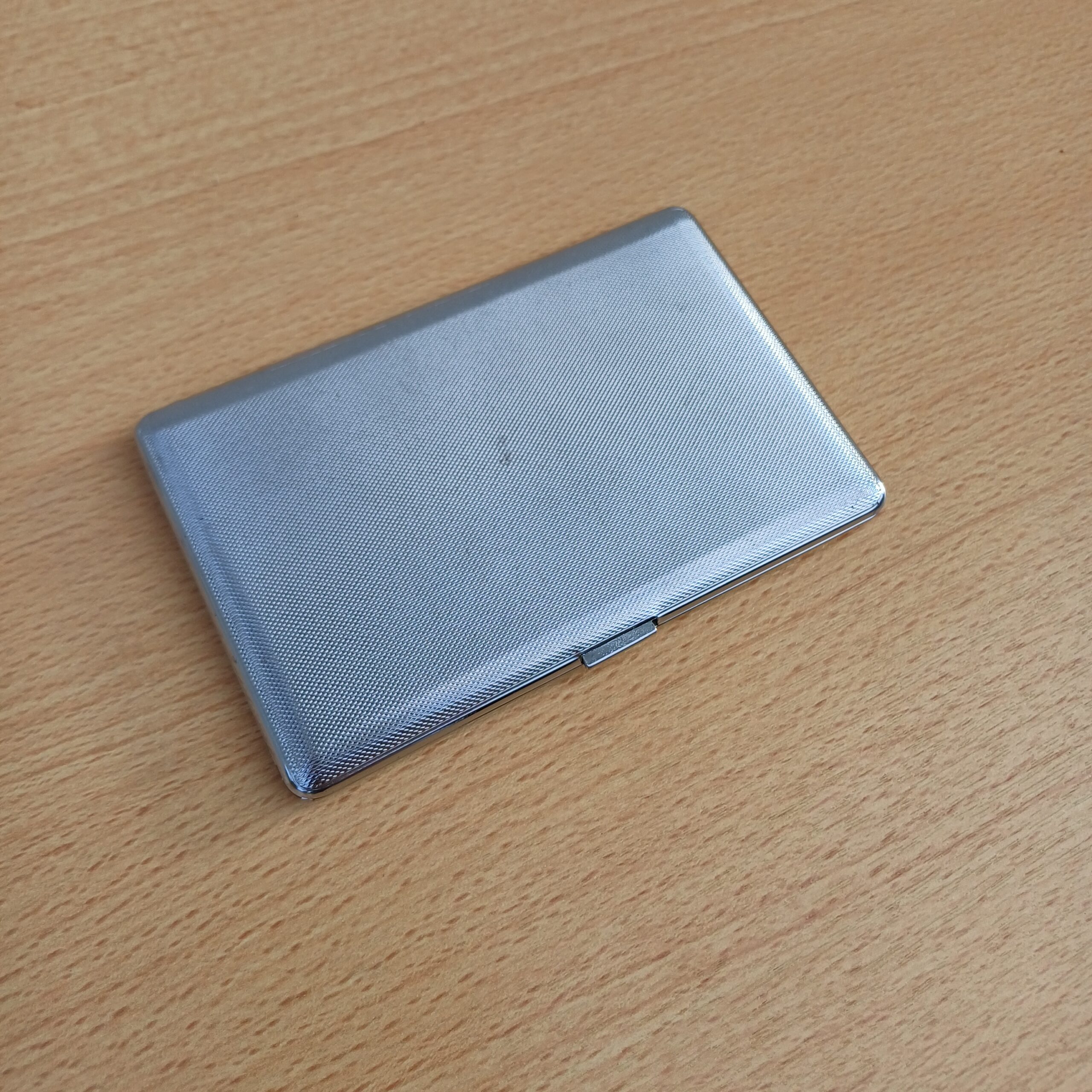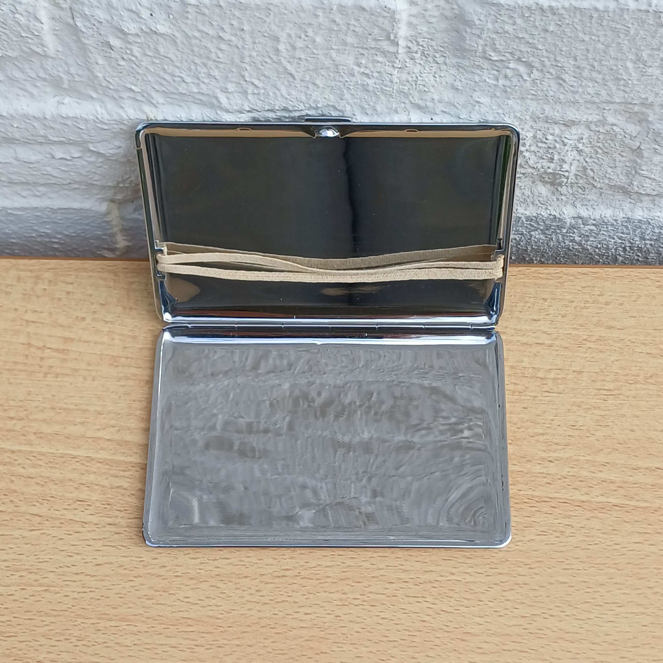 Strakke en toch elegante zilverkleurige sigarettenetui. Het etui is geschikt voor het bewaren van standaardformaat sigaretten en heeft aan de binnenzijde elastiek zodat de sigaretten niet heen en weer vliegen.