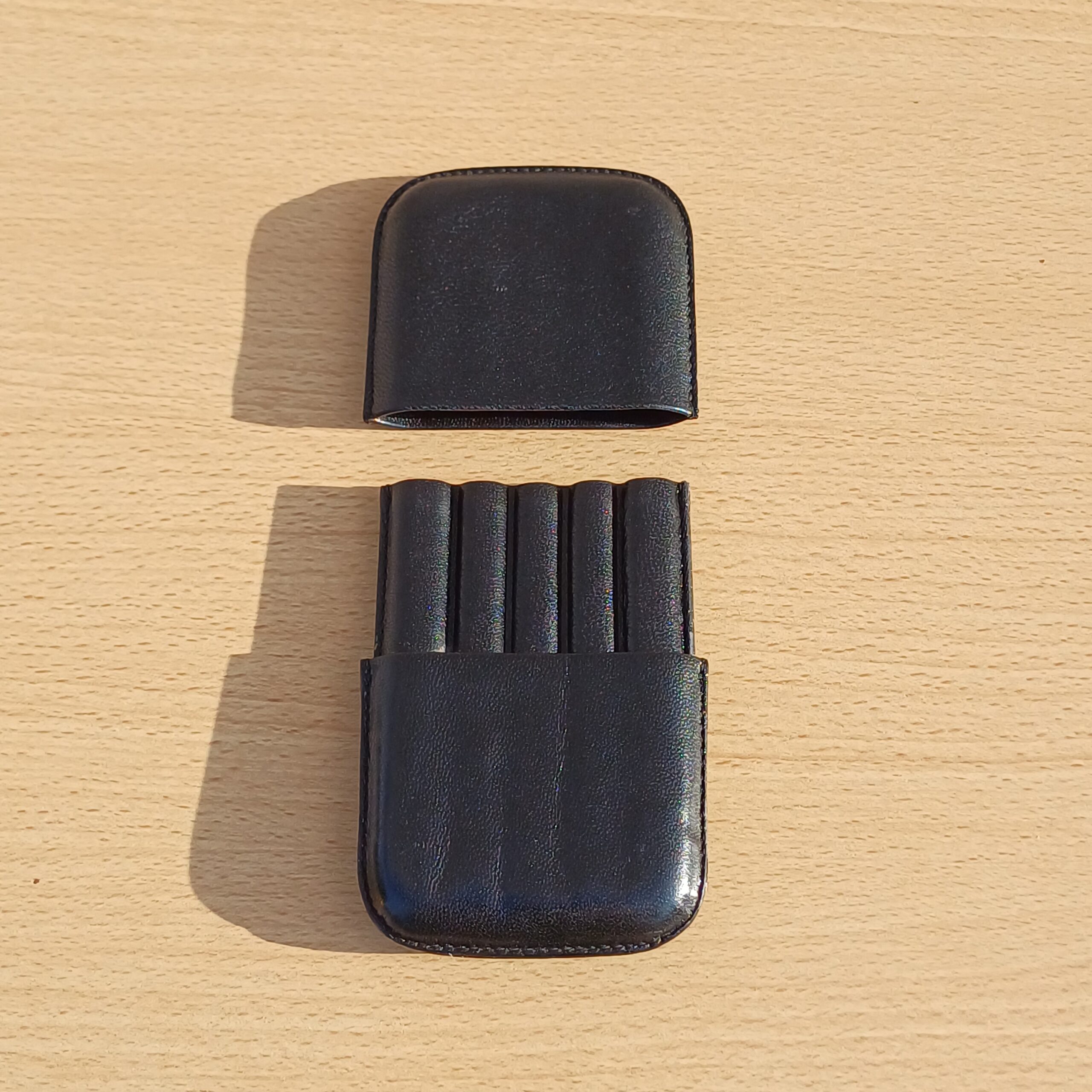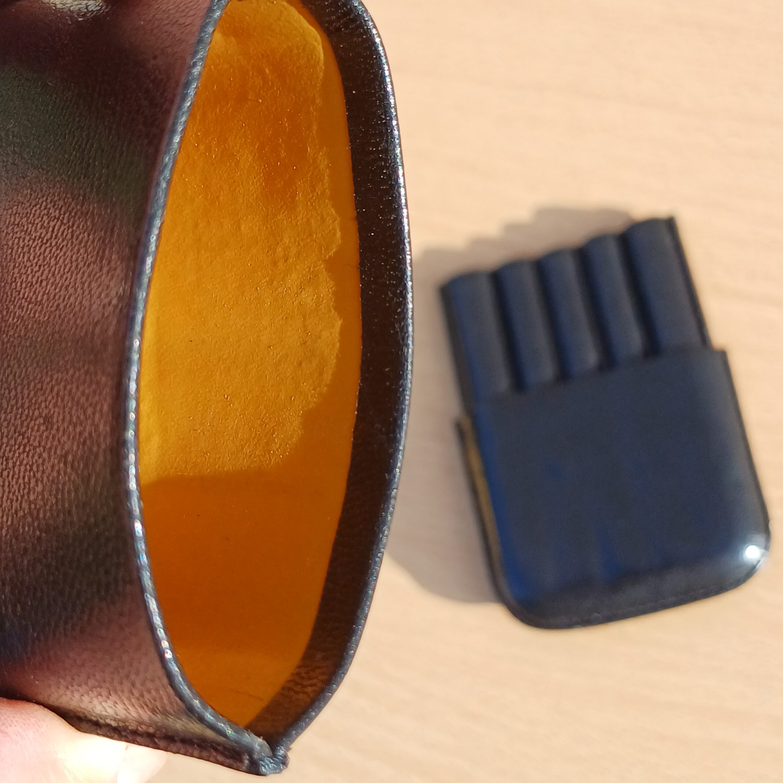 Mooie zwart leren sigarenkoker voor 5 sigaren. Met een mooie warme gele kleur aan de binnenkant. Zo goed als nieuw.